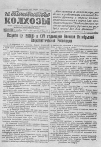 ЗА БОЛЬШЕВИСТСКИЕ КОЛ ХО ЗЫ 1 ноября 1942 г. № 91 (642)_ Лозунги ЦК ВКП(б) к XVX годовщине Октябрьской Социалистической Реовлюци [Окончание, начало см. на 1-й сто.). 3 2 . Рабочие и р а б о тн и цы , ин ж е н е р ы и т е х н и к и т а н к о в ы х за водов! Давайте К р а с но й А р м и и больше боевых м а ш и н ! Чем больше т а н к о в — тем ближе час победы над врагом! 3 3 . Рабочие и р а б от ниц ы , и н ж е н е р ы и т е х н и к и а в и а ц и о н н ы х зав одов! У в е л ич ив ай те в ы п у с к боевых м аш ип , давайт е больше и с т реб ителе й, ш т у р м о в и к о в , бомб ард иро вщик ов для К р а сн ой А р м и и ! 3 4 . Рабочие и ра б о тн и цы , ин ж е н е р ы и т е х н и к е нефтяной пром ы ш л е н н о с т и ! У в е л и ч и в а й т е добычу неф ть! Дадим фр он ту и про мышле ннос ти больше г о р ю ч е г о ! 3 5 . Рабочие и ра бо тницы , и нж ен ер ы и т е х н и к е у г оль ной промыш л е нн о с т и ! О г вас за в и си т бесперебойная работа тр а н с п о р т а и пр о мыш ле ннос ти . Ув е л и чи ва й те добычу у г л я , обеспеч ива йт е т о п лив ом все потребности фронта и т ы л а ! 3 6 . Рабочие и ра бот ниц ы , и н ж е н е р ы и т е х н и к и м е т а л л у р г и ч е с к и х заводов! Больше металла для т а н к о в , самолетов, о р у д и й , пу ле м е то в , снарядов! 3*<. Рабочие и ра бот ниц ы , и н ж е н е р ы я т е х н и к и мото ростроительной пр о м ыш яе н н о с т в ! Сов рем енная война ес ть вой на моторов. Увел ич ив ай те производство моторов для сам оле тов , т а н к о в , ав томобилей, кораблей! 3 8 . Рабочие и раб отн ицы , и н ж е н е р ы и т е х н и к и л е г к о й п т е к ст ил ьной промыш ле ннос ти ! Изо до я к день у в е ли ч и в а й т е произв од ство обмундирования для К р а с но й Ар м ии и товаров ш и р о к о г о п о т ребления для населен ия! 3 9 . Рабочие и р а б от ниц ы , и н ж ен ер ы и т е х н и к и п ищев ой про м ы ш л е н н о е т и ! Все больше ув е л и ч и в а й т е производство п ро ду к то в п и т а н и я для фронта и для с н а б ж е н и я нас еления! 4 0 . Рабочие и р а б от ниц ы , и н ж е н е р ы я т е х н и к и местн ой пр о м ы ш ле н н о с т и ! Больше и н и ц и а т и в ы в использовании м ес тн ы х р е с у р сов , увел и чив ай те в ы п у с к това ров для Кра сной Ар м ии и нас еления! ’ 4 1 . Ра б о тн и ки жел ез нод ор о жн ог о т р а н с п о р т а ! Бы стр ее п р о д в и г а й те поезда! Боритесь за бе сперебойную, ч е т к у ю ра бот у ж е л е зн ы х дор о г и речного тр а н с п о р та ! У в е л и ч и в а й т е п е р ев оз ки г р у з а для фронта и для народного х о з я й с т ва ! 4 2 . Раб от ник и морс ког о и реч ног о т р а н с п о р т а ! У в е л и ч и в а й т е пров оз г р у з а для народно го поль зо ван ия и фронта! 4 3 . Тр уд ящ и ес я с о в е тс к о й с т р а н ы ! Э кон омия во всем — за ко н воен но го времени. Бер еж но р а с х о д у й те госуд ар ств ен ные с р е д с т в , эко номьте топливо, сы р ь е , э ле к т р о э н е р г ию . 4 4 . Ко л хо зн и к и и к о л х о з н и ц ы , рабочие и работн ицы совхозов! Да вай те фронту и стр ан е больше продовольствия и с ы рь я для промы ш л е н н о с т и ! Отдавайте все сил ы па п о дд е р ж к у фронта, па р а зг р о м в р а г а ! Все для фроп та! 4 5 . Советская и н т е л л и г е н ц и я ! Ра бот ник и со в е тс к и х у ч р е ж де ни й , и н ж е н е р ы , у ч и т е л я , а г ро ном ы , в ра чи, ра бо тн и ки н а у к и , и с к у с с т в а и л и т е р а т у р ы ! Отдадим все силы и з н а н и я делу борьбы с нем ец ко - фа ши ст ск им и п о ра бо т ит ел ями ! 4 6 . Тру дящ ие ся Советск ого Союза! Кр е пи те д и с ц и п л и н у на произв од ств е! Железная д ис ци пл ин а и ор га н и зо в а н н о ст ь— залог нашей победы над вра го м ! 4 7 . Со