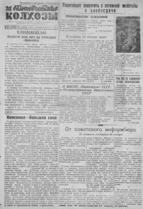 П р о л е т а р и и все х с т р а н , с о е д и н я й т е с ь } ЗйШтеШта&е К О Л Х О З Ы S S T ? ! Решиетльна пкоочнить с затякжой молотбьы и хлебосдачи Обязательство выполнено i Г с и е р н о г о РЬ БК П(5 1 9 / ( 6 4 8 ) Г2Э ноября 1042 г. воскресенье , ц т.а ю к В П О С Л Е Д Н И Й Ч А С | Чдовы колхоза и .|б, али обязательство з ноябре пил | костью зякончить выполнение первой з .поведи— хлебосдачи. Эго обязательство выполнено. 28 ноября па за го тп у нк т отиракле нследпяя парт к л зерна Свердлов« i на чет хлебопоставок. И колхозе также закончена за сып ка семян. М . БОБ Р ОВ НИ К ОВ . Наступятьне наши войск под Сталинградом продолжается 1> течение 20 ноября наши войска в районе го р . Сталинграда, преодолевая сопротивление противника, продолжали наступление на прежних т н н а а о п е н р а а с ше в л л и о ен в и и о я й х Г с . е к н а Н е а р за а с н л е я о в л в е и . ро В н - а з с а р е п а л а й е д о н н н н о е ы м е и у з п ч л у а у н с ч к т и т к н ы е ы фК р р р е о а к н с и Д он наши войска заняли населенные пункты Ка- р с к л и е е а г м ч о к о р с и в е т н , к а , и т В к П е Д и р е х о р н н ч е и а п . с й о К т л е ь А й ю н к ы г а п о т и р - о , о з в т а В , и п е в а р о н д х т и у н б к и р а о й о т с - п С и а и т в а Н в л н о и а и с ж н т э н г т о р и о ч а м й н д ы а у й Г ч е а р б н с а т е а ши в ой ск а заняли населенные пункты Ягодный, Скл яр ов, Ляпичев, Нижне-Кумский, Громосллвка, Ген ераловский , Дор ган ов. Юж н ее Сталинграда успешно отражены контр а ш т и ак х и ся д п в р у о х б ^ и п т ех ь о ся тн ны а х юди го в - и з з а и п й ад п . р П о р т о и т в и н в и н к и а, к п п ы о т н а е в с* большие потери. ли К чил и о с с х ь од н у а 2 1 0 2 н т о ы я с б . ря чел к о о в л е и к ч . ест В в с о ег п о лен за ных вр у е в м е я боев с 19 по 26 ноября наши войска захватили в плен 63 тысячи солдат и офицеров противника. ска З м а и вр за ем хв я ач б е о н е о в с ор 1 у 9 ди п й о в 2 с 6 е х ноя к б а р л я и н б а р шов и —ми 1. в 8 о 6 й 3. п к у о л в ем и е сп то р в авны3. х 85 и 1, н ви еи н с т п о р в а о в к н —ых окол 1. о 3:2 5 0 0 , тыло с ш ., а т д а е н й ; — около 9 тыс. Захвачено также 108 складов с* в ст о в е и н е н мы . м имуществом, боепр С и о п в ас и а н м ф и ор и м п б р ю о р д о о . вольВ сто роне от бо евых задач Комсомол—большая сила В пе рю д великой отечествен пой войны советского народа с немецкими окк у па нт ам и неизмеримо возрасла р»ль сельских ком сомольских организаций, объеди влющих передовую часть молодежи в деревне. М. II. Кглипин яа встрече с комсомольцами-кол- хозниками четко и ясно сстано вплсл на задачах, стоящих в дни войны перед комсомольцами сель- е ю й местности. <В колхоз1, которыйплехо работает,— говорил товарищ К и п - п вп , — комсо иолъека я орган нзация в первую очередь будет отвечать и морально перед всем населением и политически перед централ: пыми ерглвизацпями, перед парти ей, перед государствам за то, что колхоз не выполнил своих обязательств. Все это вадо понять и сделать прак тические выводы». Комсомол— большая сила. В нашем районе насчитывается 86 комсомольских организаций, которые объединяют 5 80 членов ВЛКСМ. Многие комсомольцы с честью выполняют стоящие перед ними задачи. Комсомольская организация колхоза «Ударник» (секретарь т. Баталова) насчитывает в своих рядах 10 чел. Все они повседневно ведут большую работу на производстве, принимают активное участие п пр оведении аги т'ыасссвой работы. Большую работу комсомольцы этой организации проделали и делают по оказанию пом