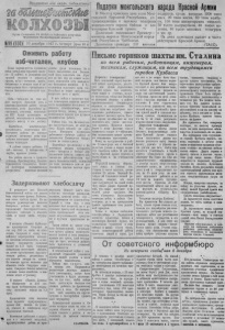 Прол етари и всех стран , соединяйтесь. Подраки могонльскоог нрадоа Крансой Арми 199 ( 850) : 10 декабря 1942 г . четве рг (цщ В М о с к в у пр иехала деле, ац п я М о н г ол ь с к ой Н а ро д н ой Р е с п у б л и к и , со пров ожд ающал 4 эшелона ’ п о л а р к о з м о н гольс ко го народа бойцам л к о мандирам К р а с н о й А р м и и . Деле га цию возгла вляет П ре м ь ер — Iми ни стр , ма р пил М о н г о л ь с к о й нар од- !ной Р е сп у б л и к и Чайб оле ан. Д е л е г а ц и я привезла 237 ва гоно в по да рк ов , сре ди к о т о р ы х 1000 т он н мяса, 90 т он н масла, 80 то н н к о л б а сы, 150 тонн к о нди т ер с ких изделий, 30 тысяч п о л уш у б к о в , 30 тыся ч валенок, 30 тыся ч ме хо вы х тел огре ек и мн. др. lí a днях дел ег ац ия выедет в части де йс твущ е й К р а с н о й А р м и и . ( Т А С С ) . Оживить работу изб-читален, клу бов Наша па рт ия всегда придавала избам читальням серьезное значе ние. П сейчас, в решающие дпп {резней т а т к и с заплатим врагом, в з 'ы — читальни, клубы, библиотеки в каждом селе и поселке должны бы ть превращены в боевые большеввсюкие а [и т пун кты. Изба-— чи тальни па селе может сы г ра ть большую роль в политико-массовой работе среди населения, если партийная орган изация, комсомол, политотделы МТС будут руководить ее работой, повседневно и заботливо поыргать избачу и его активу Парти йны е, комсомольские организации, политотделы МТС Северного района не уделили должного внимания этим важнейшим постоянно действующим очагам к уль тур ы. В районе должно работать 10 изб— читален, 2 библиотеки, 8 клубов, крас ные уголкп. Эта работа начт та в граждапработы среди населения. Но в т а к и х сельсоветах, ка к Биазив- с кий пред сельсовета тов. Абра- до сих пор на может подыскать помещения хотя возможно-' сти безусловно имеются. В Чу- нашинском сельсовете сред. тон. Михайлов не может удос ужи ть ся исправить печь в клубе. В дни войны с заклятым вра гом пеизиеримо возросла потребность тр уд ящ и хс я по гл \ш агь сообщение совппформбюро, и н те ресную беседу, доклад, пол учит ь необходимую зарядку для лучшего нал аживания работы. Районо (зав тов. Козлова) так- жо самоустранилась от этой работы. Кадры избачей не подобрали. Контролем имеющихся работников— избачеи районо не занимается. Имеющиеся библио теч к н не исшмпзуются. Партийные организации и по дитотделы должны превратить избы— читальни в боевые аги тацвон ные п у п к ты , сделать избу читальню действительным ору Письмо горняков шахты им. С т а л и н а ко всем рабочим, работницам, инженерам, техникам, служащим, ко всем трудящимся городов Кузбасса невском, Красноярском, Больше- жием большевистской а гита ц иж Куликовском сельсоветах. Имеют- на селе, подчинить всю ее дел ' ся некоторые положительные , тельность задачам помощи фрон ре з у ль т а ты , политике массовой | т у . Зад е рж иваю т хлебосдачу В решающие дня Великой Отечественной воины все должно быть подчинено фронту. Работать, к ак этого требует фронт. Но некоторые руководители колхозов Северного района до сих пор продолжают благодушествовать, про являя саботаж в обмолоте хлеба и сдаче хлеба государству. В колхозе «Память Куйбышева» председатель Свиридов до сих цор 3 0 0 г а . хлеба не обмолочено. Свиридов к этому важнейшему мероприятию относится бесаечно-посмеияается, а хлебосдачу государству выполнил только на 5 ,2 проц. Свиридов сознательно за тягивает обмолот, не. хоч ет организовать круглосуточную раб