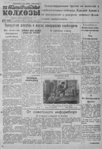 Пр ол ет а р ии всех стра н , сое диняйтес ь: колхозы Самоотверженным трудом па молотьбе и хлебозаготовках поможем Красной Армии в ее наступлении и разгроме н е м е ц к о -ф а ш и стских захватчиков . №131 (6 51 ) 17 д ек а б ря 1942 г . че тве р г [; ц,т.а 1н к. Превратим декабрь в месяц завершения хлебосдачи Все силы— на завершение хл е б о с д а ч и В своем обр аще нии члены к о л х о з а им. 17 п а р т сь ез да , Нов о с и б и р с к о го района, пр и зва ли в се х к о л х о з н и к о в обл асти пре в р а т и ть д е ка бр ь в месяц за в е р шения хл еб ос д а чи . К олх озы , за ко н ч и в ш и е к 31 д ек а бр я план х л е б о п о с т а в о к го с у д а р с т в у у д ос т оя тс я в ы сок о й ч е с т и - з а в ою ю т пр аво по дпис ать р а по рт т о в а р ищ у С Т АЛ И Н У . В споем по ст а но вл ен и и о б к о м В К П ( б ) и об ли сполк ом по стан о ви л и одо бр и ть и ни ци а ти в у к о л х о з н и к о в се л ь хо з а рт ел и им. 17 п а р т с ъ е з д а о р а з в е р т ы в а нии с о ц и а л и с т и ч е с к о го с ор ев н о в а н и я за б ы с т р е й ш у ю сд ач у хл еб а г о с у д а р с т в у и ' з а прав о п о сыл ки ра п о р т а т о в ар ищ у С та л ин у о выполн ени и к 31 д ек а бр я пл ан а хл ебо сд ачи . Во в сех к о л х о з а х сейч ас идет об с у ж д е н и е э т о го об р аще ния . Д ело велич айшей чест и к а ж д о го к о л х о з н и к а до би ть ся , чтобы в д е ка бр е хл ебо сд ача была з а вершен а. Ряд к о л х о з о в па ше го район а с ч е с т ью выпо лн ил и плач х л е босдачи. К т ак им ко л хо за м о т но ся тс я; . К р а с н о г в а р д е е ц ', . П р о г р е с с * , Яно- Ю л* . О д н а к о немало и т а к и х к о л хоз ов , р у ко в о д и т е л и к о т о р ы х под разным и пр едл ога ми сры вают сд ач у зе р на . На п у т ь я в н о г о са б о та ж а в хл ебо сд аче вс тали р у к о в о д и л и к о л х о з о в .1 Мая *, . Н а ц мен п р о л е т а р и * .' . Под ра зными пр едл ога ми они з ат яг и в ал и х л еб ос д а чу . Тот , к т о з а т я ги в а ет х л е б о с д а ч у —пр еда ет и н т е ресы ро д ин ы в чаг ее т я ж е л ы х и спы та ни й, з а н о .и т н о ж в с п и н у Кра сн ой Армии, ге р о и ч е ски о т с т аи ва ющ ей р о д н у ю з > млю. Ра сх л яб ан н ос т ь, б е с п еч но сг ь п о тв ор ст во с а б о та ж н ик а м со» ст ор он ы от д е л ь н ы х ра бо т н и ко в п р и в е л о к т ом у , что на 15 дека б р я план хл еб ос д а чи вы по л не н в сег о на 16,5 проц. У нас в район е м но го бо л та ю т о з а в ер ш ен ии хл ебо сд ачи н мо ло тьб ы, но п р а к т и ч е с к и х ме.) для в ы п о л н ен и я э т и х в а ж - . не йш нх р а бот не п р и ни м аю т . В и н о в н и к и в срыве х л еб ос д ачи д ол ж н ы и п о н е с у т су ро во е на ка з ан ие . Надо не ме д л ен но л н к в и д и р о вать п о з о р н о е от ст ав ан и е в хл еб осд аче , з а в ер ш и ть ее в декабр е. Надо в ся чес ки по дд е рж и в а т ь и н и ц и а т и в у пере до вы х к о л х о з н и к о в , с д аю щ и х хлеб из л и ч н ы х з апа сов в фонд К р а с н о й Ар ми и. Р у к о в о д и т е л и па р т и й н ы х , к о м с о м о л ь с к и х о р га н и з а ц и й д о л ж н ы сд ела ть все от ни х з авися щее для т о го , что бы хл е босд ача в д е ка бр е была з а в е р шена. Стран е, К р а с н о й Ар ми и, ве д ущ ей б о р ь б у с не мец кими з а хв а т ч и ка м и , г р у д ь ю от ст аив а ющей к а ж д у ю пя дь ро дн ой земли, н у ж е н хлеб . Мы обяза ны ег о да ть , к * к мо ж н о больше. Добьемся праза подписи рапорта той. СТАЛИНУ П колхозах Бвазниского сельсовета остоялось обсуждение обращения членов сельхозартели 17 партсьегда о завершении хлебосдачи и декабре о завоева нии орава нодовси рапорта то варищу Сталвпу. В колхозе им К -рла М'грсса собрание прошлое больш