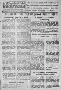 П р о л е т а р и и вс ех с т р а н , с о е д и н я й т е с ь ! колхозы О р г а н С е п е р н о г о Р К В К П ( б ; и Р а й с о в е т а д е п у т а т о в т р у д я щ и х с я Н о в о с и б и р с к о й о б л а с т и №102 (6531 20 декабря 1942 г. воскресенье[,Цеьа 1 0 к Вс е с и л ы — на за в ерш ение х л е б о с д а ч и Ст ахановскими т е м п а м и об молота и вы возк и хлеб а на заготпункты зовою ем право подписать р апорт т оварищ у . ТОТ, КТО ЗАТЯГИВАЕТ ХЛЕБОСДАЧУ— ИЗМЕНЯЕТ РОДИНЕ По -военному биться за хлеб В д е к а б р е з а к о н ч и м х л е б о с д а ч у Хлеб н у ж е н стр ан е и фронту т а к ж е , к а к бо еприпасы а воо руже ние. Мы обязаны дат ь к а к можн о больше х ле ба ге р о и ч е с ки м за щ ит ни ка м родины, п ром ышл ен ным це нт рам . Однахо до сил нор те мпы хлебосдачи в Северном районе ос та ют ся к ра йн е н и з к и м и . Хлеб п о с т у п ае т на з а г о т п у н к т ы ми кр о с ко п и ч е с ки м и дозами. Вместо 1 . 9 8 0 тоин за 15 дней декаб ря г о с у д а р с т в у сдано т о л ьк о 1 4 2 т | в н ы . В рез ул ьта те пл ан с дач а хлеба г ос у да рс т ву выполн ен п а 16 нр оц . Некотор ые колхозы даже еще нс п р и с т у п и л и к вывозке зерна. Пр и чи н а з а т я ж к и хлебосдачи з а к л ю ча е тся в том, ч т о с аб от аж н ик и, срывщ и к и х леб опо ст аво к до сих пор воль- г«лчо себя чув ств ов али в Северном ра йон е. Хлеб р а с х ищ ал с я , под вергался п о р ч е , з аг он ялс я в отхо ды , а г ос ударс т в у не сдавался. П ри налич ии 9 ты с . г а необмолоченного хлеба обмолот в декабре по с ущ ес тв у был с в ер н у т , ч а с т ь у р о ж а я по п ал а под сн ег н е с ко ш е н н о й , свы ше 2 0 кол хозов не з а ко н чи ли с ки рд ова ние. Все это стало возмож ны м в ре з ул ьта те то г о , чт о рай- г оеное ру ко во дс тв о не пр ин яло своевременно мер для вып ра вл ен ии полож е н и я . Мало т о г о , п ер в ы й с е кр е т а р ь р ай ко ма п а р т и и Мартып ов, председатель ра йи с п ол к ом а Родионов и уп ол н омоче нн ый об ко ма п ар т и и Леонов воп р е к и у к а з а н и я м СНЕ СССР, ЦЕ ВБ ГЦб) и обк ома п ар т и и не то ль ко не вели борьбы с с аб от аж ни ка ми и ра с х ить елями зе рн а, а , наоборот, с ам и соз нательно проводили ли н и ю , на п ра вл ен н ую на срыв хлебозагот овок. Си гн ал ы о ф ак т ах ко нт рре вол ю цио нн ог о сабот ажа хлебозаготовок в ко л х о з ах Ч у в а ш а н с к о г о , Б - Е у д и к о в с ко г о , Че- б ак ов с ко го и др. сельсоветов п о с т у п а ли в ра йк ом и райиспо лко м еждне в- но. Однак о Ма ртынов и Родионов п о т ворствовали ан ти го с у да рс тв ен ным мах и н а ц и я м , с т р я п а л и раз личные ра сче т ы для обмана го су дар ст ва, давали колхозам у к а з а н и я о за сы п ке семян, ид ущ ие в разрез с постановлением ЦЕ ВК П ( б ) и Сов нар ко ма СССР. П р е с т у п н у ю бездеятельность в деле хлебо заготовок прояв ил и на ча ль н и к и политотделов Северной и Тар та с- ' с г о й МТС Пл ош ев ски й и Тер ех ин . В кол хо за х зоны Северной МТС план хлебосдачи выполн ен ва 1 2 , 5 н р оц ., в Т а р т а с с к о й — 9 , 8 нроц. Немалая часть у р о ж а я ос талась не у бр ан н ой , неза- с ки рд ова нно й. Однако ни П л ош евс кий , ни Т ер ех ин не п р ин ял и ис ч ер пыва ющ их мер к предот вра ще нию э то го , не вели т а й к е должной борьбы с саб о т а ж н и к а м и хлебосдачи, проходили мимо факт ов пор ч и хлеба, разбазарива н и я зерна. Решением обкома ВК П ( б ) от 1 2 д е к а бря Ма рт ы н ов я Родионов с работы с н я т ы , из п а р т и и ис кл ю че ны и К а к передает а г ен т ст во Рейте р, согласно сообщениям из Ма ро кко , на острове Си ци ли я всп ыхн ул о восстание. Ввид 