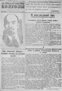 П ро лет ар ии вс ех стран , сое диняйте сь* колхозы Or»i »и '. е м е р н о ю РК ВКП(б> и Рн& с ^ с и д<м>хтато» т р у д я щ и х с я Но ь о о и б и р с к о й об л а с ти 1 6 ( 8 6 1 ) [| 21 января 1 0 4 3 г . четверг Щепа, 15 к. Под знаменем Л е н и н а - Сталина вперед, на разгром врага! Прошло 19 дет с того дня, к ак перестало биться пламенное сердце создателя большевистской партии и Советского государства, учителя и вождя пролетариата всего мвра — Владимира Ильича Левина. Левин пронес победоносное Красное знамя через величайшие трудности. Он ушел от нас в тот момент, когда страна залечивала раны, нанесённые войной, разрухой. З н а м я , выпавшео из рук Ленина,подхватил товарищ Сталин, который повел наш парод по п у ти , указанному Лениным — к с и я ющим вершинам коммунизма. Свято выполняя ленинские заветы, парт ия Ло нип а— Сталина обеспечила победу социалиствчес- кого строя в нашей стране, у к репила союз рабочего класса с крестьянством, дружбу народов СССР, создала мощную впдустрвю, крупное социалистическое сельское хозяйство, неустанно укрепляла Краевую Армию. Наша страна была превращена в самую передовую державу мира. Под солнцем Сталинской Конституции с каждым годом все ярче расцветала жизн ь народов Советского Союза. Вероломно и подло напали на нашу страну гитлеровские разбойники. Подлые бандиты рассчиты вали в 2 — 3 месяца покорить Советский Союз. По этв м коварным замыслам не суждено было осуществиться. Красная Арм ия , которую создал Ленин, которой руководит Сталин нанесла и наносит вру 1 у удары сок рушающей силы. Дух великого Ленина воодушевляет красных войной, защищающих родную землю. Красная Армия победоносно продвигает ся вперед, очищает родную землю от гитлеровской нечисти. Ежедневно с фронтов поступают сообщения о все новых и новых ус пехах Красной Армии. Близится день разгрома гитлеровских ар мий. Выполняя заветы Ленина, советский народ всеми силами по могает фронту, армии, все силы отдает для разгрома врага. Под знаменем Ленина — Сталина мы победили многочисленных врагов в годы гра ж данской войны. Под этим знаменем мы победим и самого заклятого врага человечества — германский фашизм. Нод знаменем Л е н и н а - Сталина вперед, на разгром врага! „..Товарищ и к р а сноарм ейцы ! Напрягайте псе си лы ! В о что бы то ни стало пр еследуйте отступающие войска, бейте и х , не да вайт е им ни часу, ни минуты о т д ы х а “ . _____________ ( Л Е Н И Н ) . В последний час i Успешное наступление наших войск южнее Воронежа Н а д и я х паши войск», расположённые южнее Воронежа, перешли в наступление против нвмец- ко-фашистских войск. Наступление наш лось на 3 и а н р т е н п х : из ¡айонов Селавно« и Щучье на юго засад ; з района Каятемировка на севере зчпад в запад. Прорвав енльн» укреплённую обороау противника в районе Селавное протяжением в 45 клм., в районе Щучье протяженьем в 50 ы м . и в ра йоне Каптемаров^а протяжением в 60 клм., маши иояска за 3 дни н а п р я ж е н и и боек, преодолевая сопротивление пр~>твви.(ка, продвинулись вперед на »0 90 клм. Нашим и войсками а а а н о более 6 0 0 населённых пу нк то в, в том числе i «род и желе» яодорежпый узел Рессешь, районные центры и ж е лезнодорожные ста ации Олыо ва тка , Митрофавовкч, Пухово, районные ц ен тр ы— Репьеика, Краевое, Ровеньки, Ла рковка, Каменка, железнодорожные стан цен Мелогорье, Рмб алгчиио, Сотнициее. В ходе нас тупления н а ш и вейек разгромлены 9 
