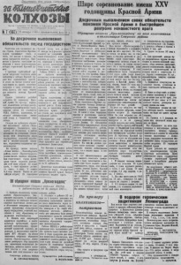 П р о л ет а р и и в с е х с т р а н , с о е д и н я й т е с ь ! ЗйШтШткЫ] колхозы i 7 (662) [25 января 1943 г. понедельник, ц.,и 15 За досрочное выполнение Ш и р е соревнование имени X X V годовщины К расной Армии Досрочным выполнением сво и х обязательс тв поможем Красной Армии в быстрейшем ра згроме не нави стного врага О б р ащ е н и е к о л х о з а тК р а с н о г в а р д е е ц“ к о всем к о л х о з н и к а м и к о л х о з н и ц а м С е ве р н о г о р а й о н а Приближается 25 юд овщипИ ю р м н т ь , одевать, обувать слав Радостные дни переживает па- ] Красной Армии ша страна. Героическая Красная | 25 января по 5 февраля прив ет а А [мин продолжает гнат ь гнат ь все дальше в дальше заиад пр о к ля тую немчуру. Ежедпевпо с фронтов поступают сообщения о новых замечательных победах героической Красной А р мии. С чувством глубочайшей радости встречают советские люди сообщения о победах Краспой А р мии над ненавистным врагом. В ответ на боевые у с пех и красн ы х воинов на фронте советские патриоты в тылу усиливают по мощь фронту, все силы отдают для ок&запии помощи Краспой А рми и. Страна готовится достойно встрет ить 25 годовщину Красной Армйи. Но npnvepy передовых коллективов всё шире разьёр- тывае тся социалистическое copen новавие вмени 25 годовщины Р К К А . Рабочие, колхозники, советская интеллигенция вносят свой вклад в Сталинский Фонд победы. Сегодня мы цублвкуем обращение колхозников колхоза <Крас ногвардеец» , Бпа зинскою сельсовета, Об объявление в районе де кадника по ускорению выполнения всех обязательств перед го суд арством, успешной подготовке к весенне посевной ка мп ании, образцовому содержанию ж и вотноводства. По примеру членов колхоза «Новая жизнь». Новосибирского района, колхоз «Крчсно гвардеец» р е ш и оказать славным з ащ ит ни кам героического города Ленинграда самую широкую помощь. Для этой цели собрано 25 пудов хлеба, 5 голов крупного ршато- го скота, 4 овцы, 2 скняьи 6 , 5 к гр . шерсти Борясь за достойную встречу 25 годовщины Ка ш колхоз «Красногвардеец» с честью справляется с возложено б я з а те л ьс тв перед го с уд арс твом р шили С Эту знаменательную дату наша страна встречает в обстановке докаднпк по ускорению аыпол велик|1* наступательных боёв нению обязательств П ’ ред !■госу- ^Рася°й Армии проткв немец* дарством по м яс у , молоку; шерсти, кожсырью И другим ПОСТа8- кам. начать деятельную подготовку к севу, усилить работу по образцовому уходу за скотом. Гайком ВБП(б) и рлйрспол 11,011 чат(4|П\ю т 1’ п одобрили заме е] инициативу.членов колхоза «Кр ic ногвардеец» в решили обт.явить в районе де кадник но досрочному кыполневыо колхозами своих обязательств перед юсударством, успешной подготовке к севу, усилению работы но уходу за скотом. Задача заключается к том, чтобы пре вратить декадник действительно в дни напряженной горячей работы. В тех колхозах, где еще не закончены обмолот и хлебосдача нужпо употребить все усилия для завершения этой неотложной работы. Одновременно надо ускорить выполнение своих обязательств ред государством по мя*у, мо лону, шерсти, кожсырью и др поставкам,развернуть ремонт сель- хозппвентаря, сбруи, по -боевому запяться сбором и вывозкой па ноля местных удобрений, принять самое активное участ ие в сборе продуктов для героических защитников Ленинграда. Эта большая 'ашистскпх яа х вич ик о в . Воодушевленная ноябрьским докладом и приказом велико!» Сталин« ге