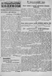 заМ тие& йтмЬе колхозы В последний час I Наши трофеи и потери пр отивника западнее Воронеж а Орган Семерного РК НКП(6/ н .<•айсокот* дспутлг,.., трудящихся Нсьосибирской области 1 10 (6 6 5 )1 :7 февраля 1943 г. воскресенье ; Ц т 15 к М О С К В А, Ц К ВКП(б) товарищу С Т А Л И Н У С большое радостью, товара щ Ст алин, встретили сибиряка В а л е нривет стк не и благодарность за заботу о воздушны! силах Красной Арм ии. Весть эта быстро облетела всю пашу область, от таежного Нарыма до Кузбасса, от ту ч ны х Барабин- оких степей до плодородных полей Ма рнинска Па многолюдных ми ти нг ах в городах и районных ц ен тр ах , на собраниях в колхозах и сонхозах сибиряки решили создать в области фонд победы Ваш ег о жмени — продолжи ть сбор средств на строительство воздушных сил Красной Армии, собрать дополнительно побольше продовольствия для фронта. Сегодня, товарищ Стал ап, сибиряки рапортуют Вам: на строительство боевых сибирских авиаэскадр ил ий «За Родину» дополнительно в январе собрано 11 5 млн 6 4 7 тые. рублей, а всего 2 2 2 млн. 6 14 тыс.рублей. Колхозники из личных запасов ■ колхозы сверх плана сдали в хлебный фонд Краевой Армии еще 2 5 0 т ы с яч пудов хлеба. Это наш янв арс кий вклад в Стал инс кий фонд победы. Изо дня и день, до полного разгрома немецких за хва тчиков, он будет пополняться дополнительной продукцией, которую рабочие дадут сверх государственного плаеа.но выми сбережениями труд ящи хся , сверх плановыми посевами кол хозом, новым выращенным по юловьем скота н другими сель- хоэ продуктами. С удовлетворением, с великой радостью сибиряки встречают вести с фронта о новых победах Красной Армии, осуществленных под Ваш им руководством. Эти аобеды воодушевляют сибиряков на новые трудовые подвиги, на борьбу за честь быть в первых рядах ак ти вны х помощников на шей доблестной Красной Армии, ведущей нас тупление до полного разгрома нен авистного врага и изгнание его с нашей земли. В депь когда до Сибири дошла весть о прорыве блокады героического Ленинград», сибиряк« решили провести веделю помищч славным ленинградцам, кто чем может,шахтеры — у гл е м , рабочие— боеприпасами, воору жением и снаряжением для бей- цов и командиров Ленинградского фронта, кол хозники — сель хозпродуктами. За короткий с ро к колхозы, колхозники и колхозницы сдали сверх плана еще: картофеля 2 2 тыс. пудов, пти - цы 78 тыс. 5 00 ш т у к , рыбы 4 тыс. 5 0 0 пудов, мёда 6 23 пуда , шер сти на 10 ты с пар валенок, оччнн 4 . 8 8 4 шт ук и, махорки 8 5 0 пудов и сибирских оель- мений 12 тые. пудов Сибиряки не забывают колхозников и колхозниц, освобожденных районов В Тог учвнском . районе колхозы решили вы рас-1 тит ь и летом направит ь в кол-1 хозы »тих районок 3 тые. го- I лов молодняка крупного рогатого скота, та кую же помощь в обзаведении скотом колхозам осво бождевных районов ок аж у т многие колхозы нашей области. Сибиряки знают о той ог ромной помощи, которая оказывалась товарищем Сталиным, п а р тией и правительством в развитии и процнет&нни Сибирского к р а я , ' помнят, не забудут м сделают все для оказания дальнейшей помощи своей родной деро- пчгской Красной Армии в полной победе над врагом. . Сибир яки своим отца м, б ра т ьям, сыновьям — фронтовикам дают боеьой наказ: бейте, земляки, гитлеро вс ки х людоедов де пол ного уничтожения, не жалея жи з в», выполняйте приказ Верховного Главнокомандующего: «Вперед, за разгром немецких ок