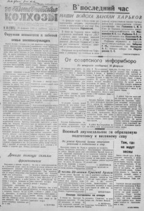' Пролетарии ecex*c)i 2 й > )пран, соеОичяйтесы I 14 ( 6 6 3 ) 2 0 фе вр а л я 1943 г . с у б б о т а |Цена 15 Окружим вниманием и з а б о т о й семьи военнослужащих В" по сл ед ний час Н А Ш И В О Й С К А З А Н Я Л И Х А Р Ь К О В Портал Леоппа — Сталина о со ветское правительство проявляют исключительную заботу о семьях военнослужащих. Трудоспособные члепы семьи мог ут получить работу, им дается возможность овладеть повой профессией, повысить свою квалификацию. Партия и правительство требуют от мест пых организаций максимального взимания благоустройству семей Фро нт ов ик о в- защитников роди ны. Хорошее отношение к семьям военнослужащих показывают со ветские организации райфо, райпотребсоюз, раЦзо, которые обеспечивают семей военнослужащих топливом, многие члены семьи устроепы на работу. Т а к, например, красноармейкам колхозницам колхоза нм. Тельмана т .т . Ивановой и Милюковой выдала мануфактуры, помогли снабжением питан и я. Жене военнослужащего тов. Сметаниной выдали обуви, белья и т. д. Т ак и х примеров заботливого отношения можно привести очень много. Но наряду с положительными сторонами имеются отдельные случаи когда семьи бойцов, командиров и политработников сражающихся на фронте испытывают некоторые затруднения. 11м пе представляют транспорта для подвозки дров, корма для ско та , не оказывают им пика кой практической помощи. Красноармейка тов. Останина обратилась к председателю Северного сельсовета тов. Рогову за помощью, но последний отнесся к жалобе тов. Останиной формально по-бюрократичес ки, заявляя: «вас т у т мно го , нет у меня для вас подвод». Не лучше дело обстоит и в райком- хозе. Ежедневно семьи военнослужащих обращаются к тов. Л унину с просьбой об оказании им помощи в подвозке дров. Последний формально по-бюрократически отделывается только обещаниями, а подвод не представляет. Имеются отдельные случаи и в некоторых колхозах когда семьи военнослужащих обращаются за поиогцыо но их пе хотят даже выслушивать. Например в колхозе, «Новый п ут ь », Верх-Красноярского сельсовета (пред, колхоза Телогин, «Намять Ленина», Лу кь я но в ) к оим обращались красноармейки за помощью но они им отка зывали. Люди которые припебрегают нуждами семей военнослужащих защищающих отчизну за сл уж и вают сурового огужденвя. Ыы можем и обязаны создать нормальное условие каждой семье военнослужащего. Забота о семьях фронтовиков дело государственной важности. Дело каждой партийной, советской, профсоюзной организации обеспечить семью нашего воина, чтобы она не испытывала бито вых неудоб;тв. В объявленный райкомом ВКП(б) и райисполкомом с 15 А в р а л я но 25-е февраля декадник помощи семьям фронтовиков партийные, комсомольские, советские и профсоюзные организации должны выявить ьсе материально-бытовые нужды семей фронтовиков и немедченно приступ ит ь к оказанию им соответствующей помо щи. Ежедневно, изо дня в день, там где требуется помощь семье военнослужащего, она должна быть оказана немедленно. Надо собирать собрания семей фронтовиков и выявлять их н уж ды , оказывая практи ческую помощь. Проводить среди них к у л ьт ур н о- массовую работу, чит ки и беседы, привл ека ть их к участию в общественной ж из ви . IG февраля н аши в с й с к а после ре ш и т е л ь н о го ш т у р м а , п е ре ш е д ш е ю по том в о ж е с т о ч е н н е е ули ч н ые бо и , овладели г о р о д о м Х ар ь к о в о м . В б о 
