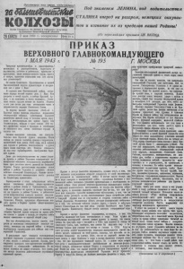 2 (Окончание. Н а ч . на 1 стр.) Поэтому главное сейчас состоит в том, чтобы вся Красная Армия изо дня в день совершенствовала свою боевую выу ч к у , чтобы все командиры и ' бойцы Краспой Армии изучали опыт войны, учил ис ь воевать та к , к а к этого требует дело победы. Товарищи красноармейцы и краснофлотцы, командоры н политработники, пар ти за ны н па рт из ан ки ! Приветствую и поздравляю вас с днем 1 - М А Я , П РИКАЗ ЫВ АЮ : 1. Всем бойцам,пехотинцам,мииометчикам, артйллеристам, танки ст ам, ле тчикам,саперам , связистам,кавалеристам — продолжать без устали совершеиствовать свое боевое мастерство, точно выполнять приказы командиров, требования уставов в наставле нии , свято блюсти дисциплину, соблюдать организованность и порядок. 2. Командирам всех родов войск и общевойсковым командирам— стать мастерами вождепия войск, умело организовать взаимодействие всех родов войск и управл я т ь ими в бою. Изучать противника, улу чшать разведку— глаза и уши армии, по м п и ть , что без этого нельзя бигь враг а наверняка. Повысить к у льт ур у работы вой ск ов ых штабов, добиться того, чтобы шт абы частей и соединений Красной Армии стали образцовыми органами управления войсками. Поднять работу войсковых тылов на уровень требований, предъявл яемых современной войной, твердо помнит ь, что ох полного и своевременного снабжения войск боеприпасами, снаряжением, продовольствием за висит исход боевых операций. 3 . Всей Краспой А р м и и — закрепить и развить успехи вимвих боев, не отдавать врагу ни одной пядн нашей земли, быть готовой к решающим сражениям с немецко-фашистскими захватчиками. В обо pone проявлять упорство и стойкость, свойственные бойцам нашей армии. В нас туплении— решительность, правильное взаимодействие войск, смелый мавевр на пеле боя, завершаемый окружением и уничтожением противника. 4. Партизанами партизанкам^-наносить мощные удары по вражеским тылам, пу тя м сообщения, воинским складам, штабам и предприятиям, разрушать ливни связи противника. Вовлека ть широкие слои советского населения в захваченных врагом районах в активную освободительную борьбу, спасая тем самым советских граждан от угона в немецкое рабство и от истребления гитлеровскими зверями. М сти ть беспощадно немецким захватчикам за кровь и , слезы наш их детей и жен, матерей а отцов, братьев и сестер. Всеми силами помогать Красной Армии в ее борьбе с подлыми гитлеровскими поработителями. Товарищи! Вра г уже изведал си лу сокрушительных ударов наших войск. Близится время, когда Красная Армия совместно с армиями паших союзников сломает хребет фашистскому зверю. Д а з д р а в с т в у е т н а ш а с л а в н а я Родина! Д а з д р а в с т в у е т н а ш а д о б л е с т н а я К р а с н а я А р м и я ! Д а з д р а в с т в у е т н а ш д о б л е с т н ы й В о е н н о М о р с к о й Ф л о т ! Д а з д р а в с т в у ю т н а ш и о т в а ж н ы е п а р т и з а н ы и. п а р т и з а н к и ! С м е р т ь н е м е ц к и м з а х в а т ч и к а м ! В е р х о в н ы й г л а в н о к о м а н д у ю - М а р ш а л С о в е т с к о г о С о ю з а И . С т а л и н . М Н 12441 --------- З А Б О ЛЬШ ЕВ И С ТС К И Е КОЛХОЗЫ 2 мая 1943 г. № 28 (682) К о л х о з н и к и и колхо зницы , рабочие и работницы М Т С и совхозов! Агрономы колхо зов, совхозов и земельны х органов! Организованно проведем весенний сев! Д о б ь е м с я высокой урожайно сти вс ех сельскохозяйственных к у л ьт у р ! Д а д и м фронту и стране больше продовольствия, с