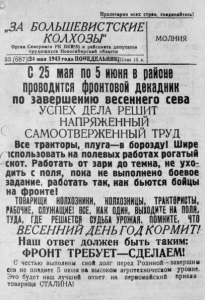 Пролетарии всех стран, совдивяйтесь! „ЗА БО Л ЬШ ЕВ И СТ СК И Е К О Л Х О З Ы молния О р г а н С е в е р н о г о РК В К Н 'б ) и р а й с о в е т а д е п у т а то в ____________ т р у д я щ и х с я Н о в о с и б и р с к а й об л а с ти _______________ 3 3 ( 6 8 7 ) 1 2 4 м а я 1 9 4 3 г о д а П О Н Е Д Е Л Ь Н И К ! Цена 15 к. С 25 мяа по 5 июня в районе проводится фронтовой декадник по завершению весеннего сева УСП ЕХ ДЕЛА РЕШИТ НАПРЯЖЕННЫЙ ( САМООТВЕРЖЕННЫЙ ТРУД Все тракторы, п л у га— в борозду! Шире и с п о л ь з о в а т ь на полевых работах рогатый скот. Работать от зари до темн а , не у х о дить с поля, пока не выполнено боевое задание, работать т а к , к а к бьются бойцы на фронте! ТОВИАЩР И КОЛХОЗНИКИ, КОЛХОЗНИЦЫ, ТРАКТОРИСТЫ, РАБОЧИЕ, СЛУАЖЩЕИ! ВСЕ, КАК ОДИН, ВЫХОДИНАТЕПОЛЯ, ТУДА, ГДЕ РЕШЕАТЯС СУЬДБА УРОЖАЯ. ПОМНИТЕ,ЧТО В Е С Е Н Н И Й Д ЕН Ь Г О Д К О Р М И Т ! Наш ответ должен быть таким: Ф Р О Н Т Т Р Е Б У Е Т — С Д Е Л А Е М ! С ч е ст ью выполним свой долг перед Р о д и н о й —завершим еев не позднее 5 нюня на высоком а гротех н ич еском у р о в н е . Э т о будет наш лучший от в ет на первомайский пр и к а з товарища С Т А Л И Н А !
