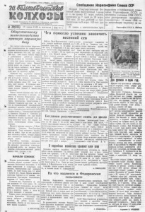 П р о л е т а р и и в с е х ст р а н , с о е д и н я й т е сь колхозы Орган Северного РК В КП (б , и Райсовета депутатов __________ тр у дящ ихся Новосибирской области Й 39(693) 18 июня 1943 г . пя тни ца \ Цена 15 к. О бщ е ст в е н н ом у ж и в от н ов одст в у п р о ч н у ю к о р м о в у ю б аз у Дл я полн ого обеспечения общественного животноводства на зимний период кормами колхозам нашего района т р е буется заготовить 36 5 тыс. цнт . cena, 14 0 т ц с . тонн силос1. Райном Ш Ш (б ) и райисполком довели до каждого колхоза задание по заготовке кормов. В этом году травы прекрасные, сеноко сн ых уг оди й очень много. Каждый колхоз имеет все условии к тому, ч тобы не только выполнить, по и зн ач и тельно перевыполнить устано вле нны й план по заго товке кормов. За ко нч и в лев, передовые колхозы наряду с прополочными работами, во всю развернули сенокос, силосование. В колхозах Мало-Карагаевского сельсовета заложено около 100 тон н си лоса, идет сенокос. В Остяцком сельсовете севокос развернулся полным ходом, начали сенокос в Биазинском сельсовете. Однако мп о гя е колхозы еще чего то выжидают , з ат яг и в аю т с началом сенокоса. В колхозах Федоровского сельсовета не скошено ни одной сотки травы . Председатель сел ьиг пол ком а т . Сотников ссылается ири этом па то, что не отремонтирован сеноуборочный инвентарь, машин ы. «Вот найдем к у з - Сообщени е Н а р к о м ф и н а С ою за ССР Вт ор ой Государс твенный В о енный Заем, выпущенный 5 июня с. г . на сумму 12 млрд, рублей, размещен за 7 дней на 20 млрд. 323 млн. 32 тыс. рублей— с пре вышением на 8 млрд. 3 23 тыс. р у блей. В связи с значительным п р е вышением уст ановленной суммы займа На ркомфином С С С Р , ла основании у к а з а н и я С Н К С С С Р , дано ра сп ор яж ени е прекра тить по в сем ест н ое 13 июня 1948 года дальнейшую по д пи ск у на заем. Нар комфин СССР А. ЗВЕРЕВ Что пом ог ло успешно закончить весенний сев Колхоза Мазо-Карагаевского сельсо вета успешно закончили весенний сев, выполняй план сева к 12 июня ца 100 проц. В бл ижайшие 1-2 дия колхозы з ак а пчи вают сверхплановый посев 55 га . Урожай с 3 0 га будет передан в фонд Красной Армии. Таки х успехов колхозы добились в результате образцовой организации труда, боевой работы колхозников. Председатель колхоза «Пут ь Сталина» тов. Волков сумел организовать работ у т а к , что большинство колхозников перевыполняли нормы выработки. Так , например, пахар ь Колпаков Александр на весеннем севе показывал высокие образцы тр уд а— вспахивая по 1 , 3 0 га за смену. Правление колхоза премировало его теплой фуфайкой. Хороших результатов добилвсь па хар и т т . Прохоров и Васильцов. Работу в этом колхозе начинали в 2 ч. ночи и з а к а н чивали в 11 вечера. Сам председатель колхоза не уходил с поля ни па одну ми ну ту , оказывая все время пр а к т и ческую иомощь паха рям, бороноволокам. Первым по сельсовету сев закончил колх оз «Верх-Тарка» (председатель т. Балк ин ). Здесь т а к ж е хорошо был организован тру », по -хо зяйс ки подошли к использование па работе коров, бы ков. Люди знали свое место, явое дело. Ови работали г-, зари до лари, не жа- Кденоч а , отреиоп тэрусм ШиЗ Д аф ь, начнем к о с и т ь » , — невозмутимо заявляет 1лея С11л- п а х а р и Прокопьева т . Сотников. Неужели т. Сотников д о ' сих пор не понимает, что при та ко й постановке вопроса колхозный скот па заму останется опять без кормов со всеми выт екающими отсюда последст виями . Медлят с началом сено