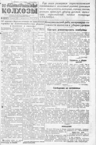 */¡ / О . ф т а р и и в сех с т р а н , с о е д и н я й т е с ь ] ' 2& Ш ш ё ё Ш ш Й 1е КОЛХОЗЫ Ор г ан С е в е р н о г о РК ВКП(б; н Р а й с о в е т а де пу т ат о в трудящихся Новосибирской области №43(697) 1 8 и ю л я 1943 г . в о с к р е с е н ь е }Цена 15 кои О б ит о га х дв ухм есячника по наведению порядка на животноводческих фермах в к о л х о з а х и с о в х о з а х П о ст а н о в л е ни е И с п о л н и т ел ь н о г о к ом и т е т а Н о в о с и б и р с к о г о О б л а с т н о г о С о в е т а д е п ут а т о в т р уд я щ и х с я и бю р о О б к о м а ВКП( б) от 30 июня 1943 г . . Уассмотрзв и т о ш социалистического коров, резкое увеличение удоев молока: " и р е к п о з а п я я за лучшее сохранение Е щ е ш и р е р а з в е р н е м с о ц и а л и ст и ч е с к о е сор ев нов ани е в к о л х о з н о й д е р е в н е , умножим число п е р е д о в и к о в ,к о т о р ы е , х о р о ш о по с ея в , у с п е ш н о п р о в е д у т у б о р к у ур ожа я , выпол - н ят п ер в ом а й с к и й С Т А Л И Н А . п р и к а з т о в а р ищ а поголовья молодняка п взрослого с ю г а и повышение его продуктивности в колхозах п совхозах области,Облисполком п бюро Обкома В К П ( б ) постановляют: 1 . Приз нат ь победителям а в социалистическом соревновании пс итогам двухмесячника районы и присудить премии: Татарскому району— председател! райисполкома т. Баскаков, секретарь Р К ВШ1(б) т. Б е л о к о н е в - И Е Р В У Ю П Р Е М И Ю — стройматериалов на сумму 1 0 0 ты са ч рублей; Чамен ск ому ра йо ну— председатель ь мюлкома т. Голубенко, секретарь I ВКИ(б) т. Уваров - В Т О Р У Ю И Р Е 1110— строительных материалов ва су мму 75 ты сяч рублей; Ку ни нс ко му райопу — председатель ч П йнсполкома т. Чурсип, секретарь ВКИ(б) т. Козяйк ин, —ТР ЕТЬЮ ИРЕМШО — стройматериалов па сумму 50 тысяч рублей. 2. Признать победителями в соревновании совхозы и присудить премии: ^ Т а б у л п ш с к о м у молсовхозу Чистоозерпого района— директор т. Жирнов е) нагул п откорм скот а; ж) полпос сохранение молодиака и взрослою поголовья скота; з) проведение u j 4ku всех маток, способных к расплоду. Обязать райисполкомы и райкомы ВКН(б), Но римский окрисполком окружком ВКН (б) с 15 сентября по 1 октября проиес1ц массовую проверку готовности колхозов к зимовке скота Колхозам, полное» ю ПОДГОТОВИВШИМСЯ к зим п'.ке скота, в р у ч ат ь от райисполкома и райкома IÍKI1 б) «Паспорт го говност i колхоза \ к зимовке скола в 1 9 4 3 - - 4 4 годах». Паспорт вручать колхозу па собрании колхозам сов после тщательной проверки г о г о в н ' с ю колхоза к зимовке скота к о м и с с и и в составе представителя райисполкома и райкома ШШ(6), зооветработниса и прздеедателя рев комиссии колхоза. Колхозам, лучше дру твх подготови- вшимса к зимовке скота и первыми юлуч ивпим и паспорта, выдать премии Комсомольский рейд по проверке го товности к олхозов к уборке ур ож а я Быстрее рем онти роват ь ком байны за сче т местных районных ресурсов 7. Соязать председателей райиспол- . . комор, секретц*ей райкомов ВКЩ б) , П Е Р В УЮ Н Р Е М П Ю — нромтоваров|директоров совхозных трастов с 15 сумму 50 ты с я ч рублей; |сентябри по 1 октября ировестн проСвиносовхозу «Сибиряк» Ояшинского района— директор совхоза т. Ела у рк в ь — ВТОРУЮ П Р Е М И Ю — промтоваров на с у м м у 30 тысяч рублей; Маслиннискому льносовхозу— дирек тор т. П а н ч е н к о - Т Р Е Т Ь Ю П Р Е М П Ю - мтоваров па с умму 25 тысяч рублей. 3. Признать победителями в соревновании колхозы и присудить премии; П Е Р В УЮ ИРЕ М И Ю -п р о м то вар о п на сумму 40 т ы с яч рублей— колхоз