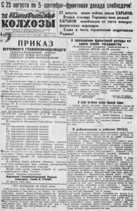 / 4 0 Н 4 С25 авгсутапо 5 сентября—фронтовая декадхлебосдачи! П р о л е т а р и и всех с т р а н . с<#0“ ч я1.ч/т Л чаШ Ш Ш кШ Ш КО Л ХО ЗЫ ( Орган Сенерного НК B K Í1( 6 J н Райсовета депутатов т р у д я щ и х с я Н о в о с и б и р с к о й области №# t ) ( 9 Q £ ) 20 а в гу с та 143 г. четверг ]цеаа 15 к о п 23 августа наши войска взяли Х А Р Ь К О В . Вторая столица У к р аи н ь г -н аш родной Х А Р Ь К О В освобож ден от гнета немецко- ф аш и ст ск и х мерзавцев. Слава и честь героическим защ итникам Родины ! П Р И К А З ВЕРХОВНОГО ГЛАВНОКОМАНДУЮЩЕГО Г Е Н Е Р А Л - П О Л К О В Н И К У К О Н Е В У Г Е Н Е Р А Л У А Р М И И В А Т У Т И Н У Г Е Н Е Р А Л У А Р М И И М А Л И Н О В С К О М У С е год ня , 23 ав гус та , во й с к а С т е п н о г о фронта п р и а к т и в н о м сод е й с т ви и с флангов в о й с к В о р о н е ж с к о г о и Ю г о - З а п а д н о г о ф р о н то в , в ре з ул ьта те о ж е с т о ч е н н ы х б о ев сломили с о п ро ти вл ен и е п р о т и в н и к а и штурмом взяли г. 4>д Х а р ь к о в . Т а к и м образом , вторая столица У к р а и н ы — наш ро д не Х а р ь к о в о с в о б о ж д е н от г не та н е м е ц к о -ф а ш и с т с к и х мерзавцев. В на с т у п а те л ь н ы х б о я х за овладение го р о д о м Х а р ь к о в наши в о й с к а п о ка зал и в ы с о к у ю боевую в ы у ч к у , о т вагу и уменье маневрировать. В б оях за гор од Х а р ь к о в о т л и ч и л и с ь войска генерал- майора М о н о г о р о в а , генерал -лейтен .ж та К р ю ч е н к и н а , ге нерал-лейтенанта Ш у м и л о в а , генерал-лейтенанта Га ги на , данерал-лейтенанта т а н к о в ы х в о й с к Ротмистрова и л е т ч и к и генерал-лейтенанта авиации Горю нова , а т а к ж е части 3 3 - г о г в а р д е й с к о г о с т р е л к о в о г о к о р п у с а генерал-майора К о з л о в а М . И. и 3 4 - г о с т р е л к о в о г о к о р п у с а генерал-майора К о л ч и г и н а . В ознаменование о с в о б о ж д е н и я Харь кова 89 г в а р д е й с к о й Б е л г о р о д с к о й с т р е л к о в о й д и в и з и и . 252, 84, 299, 4 0 , 3 7 5 , 1 8 3 с тре л к ов ы м , 15, 28 и 93 г в а р д е й с к и м ре л ковы м д и ви зи я м п р и с в о и т ь наименование „ Х а р ь к о в с к и х “ и вп р ед ь их именовать: 89 гва рд е й с к ая Б е л г о р о д с к о - Х а р ь к о в с к а я с тр е л к о в а я д и в и з и я ; О проведении фронтовой декады по сдаче хлеба государству П о с т а н о в л е н и е С е в е р н о г о р а й и с п о л к о м а и р а й к о м а В К П ( б ) от 2 5 а в г у ст а . В о тв е т на п р и к а з Верховного Глав- нокоман 1ую щ е го Маршала Сов етс ко го Союза т ов ар ищ а С тал и н а , о т м е т и в ш е г о ноные у с п е х и г е ю и ч е с ю й К р а с н о й А р м и и , освободившей о т гн е т а н емец к о -ф а ш и с т с к и х мерзавцев вторую с т о л и ц у У к р а и н ы — наш родной Х а р ь к о в , рай и сп о л ко м а и р а й к о м ВК11(б) п ос та нов ляют: 1. В с о о тв е т с тв и и с решением Но восиоирско го облисполко ма и бюро обкома В К Н ( б ) о б ъ я в и т ь с 2 5 а в г у с т а по 5 сентя б ря ф ронтовую д е кад у со сдаче хлеба г о с у д а р с т в у . 2 . У т в е р д и т ь з ад ан и я колхозам по сдаче хлеба г о с у д а р с т в у на период декады и на к а ж д ы й день согласно п р и л о ж е н и я . 3 Осязать с е к р е т а р е й п е р в и ч н ы х п а р т и й н ы х и к о м с о м о л ь с к и х о р г а н ■- '| | > ^ ц ^ з а ц и й , председателей с е л ьв с и ол к ол о в , Председатель райисполкома Е. МЕРЗЛЯКОВ ко лхозов. у п о л н о м о ч е н н ы х р ай ко м а ВК11(о) и р ай и с п о л ко м а провести м и т я - Н ( и в к о л х о з а х , МТС, б р и г а д а х , к о м б а й н о в ы х а г р е г а т а х , т р а к т о р н ы х о т рядах но п у ч е н и ю п р и к а з а т о в а р и щ * С т а д и и * . П р и п я т ь на а г и х м и т и н г а х к о н к р е т в ы е
