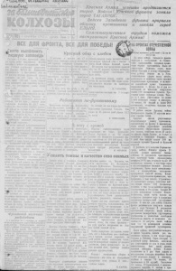 / JaaX Ю И О ( «AJü jíla ju kM SUi ролетарии Л Ш м р р всех стран, соеииняищ^п! | ' "Г *ш|— ■*■■ Н м м i 4 1 Красная Армия у с п е ш н о продвигается вперед. В о й с к а1 Юж н ого ф р онт а занял и 1 Ш » ** г*. ** ж j •ï à I W J % ■ ' ■ i ; : ? H A T \ . . Л ? * •* \ О р г а н С е в е р н о г о P i í ВКП(б ) и Р а й с о в е т а депутатов - т р у д я щ и х с я Н о в о с и б и р с к о й о б л а с т и город Т А Г А Н Р О Г . Войска Западного оборону противника Е Л Ь Н Я . Самоотверженным ф р о н т а прорвали и з а н я л и г о р о д 1 сентября 1043 г. среда ¡Цена 15 Ла. | Наступа/ОЩвй KpaCHOÜ А р м и и ! трудом поможем В С Е д л я Ф Р О Н Т А , в е к д л я П О Б Е Д Ы ! gвято выполнить т т р в у ю заповедь С е го д н я— 6 - й день фронтовой д е к а ды сд ачи хлеба го с у д а р с т в у . М но ги е ко лхозы с честью вы д е р ж и в аю т э к з а мен, успешно в ы п о л н я ю т устапив лен- пые задания. Колхоз им, Ворошилова (председатель т . М а л н р е в и ч ) еще на 3 0 а в г у с т а задание фронтовой декады вы полнил на 130 прод. За . 4 д п я здесь сдано 1 9 5 н о т . з е р н а , годовой план хлебосдачи у ж е вы полнен на 5 1 , 3 п р о ц . , т-е г о с у д а р с т в у сдано 3 .G 4 2 п у д а , хлеба .' ^ л о х о борется за первенство в - Л Яфетическом соревновании по хле- б о с д ю ко лхоз « П а м я т ь Чкалова». За 4 ' 'з а д а п и е фронтовой декады в ы полнено на 8 4 проц , годовой план хлебосдачи в ы п о л н е н на 4 4 , 7 проц . Колхоз им. Т нм иш еп ко задание фронгоКрасный обоз с хлебом 2 7 а п г у с т а в колхрзе г м . 17 г о партсч.езда состоялся м ф ш г , п о с в я щ е н ный п р и к а з у товарища С талина, отм е тившего с л а в н ы х з а щ и т н и к о в родины, освободивших город Х а р ь к о в о т г н е та н ем ец к о-ф аш ис тс к их мерзавцев. С чувством о гром по г ц у до иле творе и I' я колхозники п риня ли ату радостную несть. В ( .т в - з не. мои; . | 1 победы фронт о в и к о в было решено у с к о р и т ь сдачу хлеба го с у д ар с тв у . — В виду т о го , что Л к л а у нас не х в а т а е т , — з а я в и л и кол хо зни ц ы т т . Пет р у ш е н к о , Кремона и д р , - ,мы предлагаем НАФРОНТАХ ОЕТЧЕСТВНЕНОЙ ВОЙНЫ н а ч а ть вы возку хлеба на своих ко ровах, о р га н из у е м к р а с н ы й обоз с хлебом в честь повой победи К р а с н о й Армии . 3 0 а п г у с т а был организован кр ас ны й обоз па 1 7 к о р о в а х , которые доставили в Сев ервый п у н к т «Заготзерно» 1 0 2 пуда хлеба . За фронтовую декаду колхоз у ж е вывез на з а г о т п у н к т 9 6 0 пудов зе р н а . Ав густовское задапие па хлебосдаче мы вы п ол н и л и . А . 1 . А Х А Р Е В , п р е д с е д а т е л ь к о л х о з а им. 17-го пирт - с ъ е з д а . Работают по-фронтовому К о л хо зн и ца колхоза к * . Ворошилова I Не о тстает о т нее и ж ен а фро нтовика п3Г 1 ^ 9 Д , п , ю ц П П о 1“б о е ^ Г с д а ю т х л е б 1 «— « Л - « »у», . ь н .г ! tг ■™ j t L bi= . ; Анна На ильевна 1п о в с Л л п о п р а в у 1ко л х о з п и ц а Л у к о м с к а я Т а т ь я н а . Она Л I i m n i û T O : 7» l ' 3 í I f i n i i ЛЧ111 v a _____ . . . . . • л е т к а » . Ведущее место в соревновании по хлебосдаче з а н им а е т п о п р е ж н е ы у ^ некий сельсовет, и о р а з ц и труда па вы сокой производитель ости вывозке хлеба п о ка зы в а ю т Ге ктар ов р ж и и за 5 дзен вы косила л и т о в к о й с г рабкамп 9 г е к т а р о в гр е ч и х и . т а к ж е за 25 робочах дней убрала 1 3 , 7 га хлеба. В Н И К О Л А Е В . С чувством о г р о м н о й о тв е т с тв е н В ногу с армией р а б о т н и к и т р а н с п о р т н о й б р ш а д ы ко л - в о с г и перед страиой и фронтом ра- хоза «Память Ч а п ае в а » , ко тор ую воз- ботагот.члены колхоза n i , К а л и н и н а . главляе т у ч а с т н и к отечес твенной войны, комсомолец В и н о г р а д о в .Н а па р