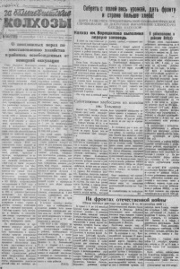 ■U n o . m n n p i n i всех с т р а н , с п г И н н .п йш с / ,! 4*' O p i n i i ( c i i e p n o r o l ’ K í ! ' v [ ! (6) и Р а й с о в е т а д е п у т а т е в i ТРУДЯЩИХСЯ Н0ЬОСИ(.КрСК0Й о б л : с т и v ^ i r “ 1p r j ------- ' Собрать с полей весь урожай, дать фронту и стране больше хлеба! ШПРЕ РАЗВЕРНЕМ ПРВДОКТЯБРЬСКОЕ С О Ц И А Л И С Т И Ч Е С К О Е СОРЕВНО ВАНИЕ ЗА Д О С Р О Ч Н О Е ВЫПОЛНЕНИЕ Х Л Е Б О С Д А Ч И КАЖДЫМ КОЛХОЗОМ! ^ № 5 4 ( 7 0 8 ) И э с е н т я б р я I Л 3 г . ч е т и е р г Цена 15 кои О н е о т л о ж н ы х мерах по в о с с т а н о в л ен ию х о з я й с т в а в р а й о н а х , о с в о б о ж д е н н ы х о г немецкой оккупации Сокет Н а р о д п ы х Комиссаров с е л е н и я . Рабочие и е л у ж п ш и е ■ П О Я Г Г .Р . . 11 finit.1‘1I I г>| « A I.V ! ... - .......... Союза С С Р и Ц е н т р а л ь н ы й Ко м т . т е т В К Н ( б ) п р и н я л и пос та но в ление о н е о т л о ж н ы х м е р я т , н а п р а в л е н н ы ! к скорейшему нос,- е та новлеиш о х о з я й с т в а и о к а з а нию помощи населению област е й , о св об ож ден I и х о т немецкой о к к у п а ц и и . Совнарком С С С Р и Ц К В К П ( в ) Обязали но позднее 1— 15 о к т я б р я в о з в р а т и т ь ко лхо зам освоб о ж д е н н ы х о б ла с те й э в а к у и рованный в в о с точ н ы е районы с к о т , п р и н а д л е ж а щ и й ко л х о за м . Д л я у в е л и ч е н и я по голо в ья с к о т а в к о л х о з а х освобожденн ы х о б л а с т е й , разрешено у в е л и ч и т ь п л а н к о н т р а к т а ц и и и по к у п к и с к о т а у к о л х о з н и к о в , р а бочи х н с л у ж а щ и х , а Нарком- зему С С С Р вменено в о о л ш н - п о с т ь о р г а н и з о в а т ь в восточн ы х и ц е н т р а л ь н ы х о б л а с тя х г о с у д а р с т в е н н у ю з а к у п к у всех лидов ско та д л я областе й,освобож денных о т немецкой о к к у п а ц и и . Д л я во сс га п о в л е п и н п т и ц е водства г о с у д а р с т в о о т п у с к а е т к о л х о з а м осенью >'.143* года и о л м и л л п о п а г о л о в взрослой д о машней племенной п т и ц ы . Кол хозы, к о л х о з н и к и . едино лич н и к и , рабочие , с л у ж а щ и е и к у с т а р и , пострад авш ие о т н е мецкой о к к у п а ц и и п о лно с тью и л и ч а с т и ч н о освобождаются в 1943 г о д у о т сдача г о с у д а р с т « у с е л ь х о з п р о д у к т о в . Д л я - о б е с печения п л а н а посева озимых к у л ь т у р п о д у р о ж а й 1944 г о да ко лхо зам , а т а к ж е совхозам о т п у с к а ю т с я семенные сс уды . По с та но в ле ни е Совнаркома СС С Р » Ц К В К Н ( б ) п р е д у см а т р и ва е т во с с тановление в 1943 г о д у в к а ж д о й из освобожденных о б л а с т е й определенное к о л и ч е с т во М ТС я ремонтно т р а к т о р н ы х м а с т е р с к и х . Д л я воссташжла - н в л а п о с т р о й к и но в ы х ж и л ы х доиов из м е с т н ы х с т р о и т е л ь н ы х м а тар аалов в с е л а х , городах и ра б очи х п о с е л к а х , осеобожден - в ы х а т немецкой о к к у п а ц и и , в 1943 г о д у д о л ж н ы б ы т ь построе пы и вв едены в э к с п л о а т а - ц и ю заводы с т р о и т е л ь н ы х мат е р и а л о в и заводы по пронз в о д с т в у с т а н д а р т н ы х домов. Н а о св о б о ж д е н н ы х о т пр о т и в н и к а ж е л е з н ы х д о р о г а х до 1 я нв а р я 1944 года д о лжны б ы т ь в о сс та но в ле ны и п р и с п о соблены ч а с т и ч н о разрушениые в о к з а л ы ш а , п у т е в ы е и ж и л ы е п о м е щ е н и я , а т а к ж е построены временные с т а н ц и о н н ы е поме, щ е и и я у п р о щ е н н о г о т и п а ц ж и л ы е з д а н и я т а м , г д е они со вершепно р а з р у ш е н ы . Д л я обесп е ч е н и я с т р о и т е л ь с т в а рабочей с и л о й н а п р а в л я ю т с я ба тальоны ж.д. в о й с к , а т а к ж е м о б и л и з у е т с я о пределепное ко личеств о рабочей с и л ы и з местного н а - ж . д . т р а н с п о р т а , работающие 