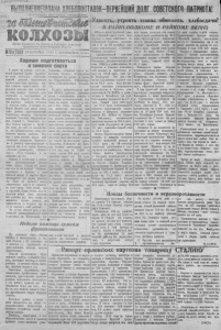 З А Б О Л Ь Ш Е В И С Т С К И Е К О Л Х О З Ы 2 4 с е н т я б р я 1 9 4 3 Г. № ( 7 0 9 ) ПИСЬМА В Р Е Д А К Ц И Ю ч >. Т4.. / у у » ’» а и и и и д • * .. Д и к то р п р еду преди л ! . С л у ш а й т е наш и радиопередачи, будет передано ва чное сообщение*- М о скви чи ждут у реп р од у кто ро в передачи приказа В ерховного Главнокомандующего Марша да • о в в т с к о г о Союза то в а рищ а И. В. С Т А Л И Н А о новой победе наших доблестных войск, ссвобож ^ и и 1 \ л и 1 и ^ 1м и О ( | Г 1 . и . С . 1 П ^ П П А и И . ш и п П и Ц С Д С Н о Ш Н л Д С Д / Л С \ . I I I 1м Л П О П С П , и в и и и т * » » щ . х от немецких о к к у п а н т о в города нашей Великой Родины, находившиеся под игом гитле р о в с к . х зятватчиков . Ч е р м десяток минут столица будет салютовать своим прославленным в боях воинам. На снимках: («л»ва) И* Красной площади у репродукторов. Не дорожат рабочим временем ве11етьса з д е с ь - B i u i . i t t н . * т ' . А В а н ь к а и П е т ь к а г . т к о З и о ра Сота ют и своих с о к е а н и х ого »Война есть войиа, она те р п и т никакого самовольнича. нин , и если человек н ар уш ае т д и сц и п л и н у , он должен сурово к а р а ть ся . Дисциплина ьсе гда и везде должна Г и т на персом плане». (М . К а линин ) Эту истину забыли работники м ил и ц и и , дли пах ничей» родах. Такое ;ез»Гц»ази<* раб »ганка милиции на »ива юг o'i u i i u u явлением» и ничей» п р е с т у п н о г о в нем нс находит. пн стоит в рабочее время бросит государственную работу, у й т и а («права) Салю т М о с к в ы . _____ Ф о т о Г . Ш и р о к о в а , и Ф Кислова. JPoro x^OHHKa^TACC^ Н а ф р о н т а х о т е ч е с т в е н н о й войны ( О б з о р в о е н н ы х д е й с т в и й з а в р е м я с 15 п о 21 с е н т я б р я 1 9 4 3 г . ) домой и заниматься своими лич н и м и делами. Т а к часто делают работника милиции и пвепор- - т в е т т . Белоусова. Вы нередко встретите у з д а н и я милиции людей, часами прос таивающ их в ожидании паспор ти с т а в начальника милиции, чтобы подписать п а с п о р т , или получить разрешение па п р о п и с к у . А часто бывает так'. « В а п ь к а здесь — Петьки пет , То, что люди цел ле часы т р а т я т в ущерб своей работе в ожидании чтобы п о л у ч и т ь с п р а в к у , то, что се й ч а с , к а к н икогд а , дорог к аждый час р а б о ч е ю нре-..^. м е н а ,— это работников м и л п ц ч Щ ) пе к а с а е т с я . З а ко н — работа ть 8 часов, ночему -то п р е с т у п н о нарушается П арторганизация 1*0 П К В Д д о л - жиа вм еш аться в э г о и навести н уж ны й порядок. Но она иоче- м у т о находится в стороие. А Р. За время с 15 по 21 с е п т я - | н т а , во взаимодействии с Черпо- бр я н а ш и войска па широком морским флотом, 16 сентября фронте продолжали развиват ь успеш но й н аст упление . На Киевском направлении в р е з у л ь т а т е д в у х д н е в н ы х боев сове тские части 15 сен тябр я з а н я л и город и к р у п н ы й ж е л е з н о дорожный узел Н е ж и н — важ не йш и й •порций п у н к т обороны немцев ва п у т и к К и е в у . В боях за 1 ежин истреблено 3 . 0 0 0 н ем ец к и х с о л д а т и офицеров, з а х в а чено 14 т а нков , 6 0 о р у д и й , из н их 12 даль нобойных, к р у п н ы е склады с боеприпасами и продовольствием. П р од ви га яс ь вне род, советские войска в послед ую щ и е дни заняли города Ром- п и , Миргород, 1'омодан, Н р и л у П и р а т и н , Лубны , Хорол, Гребенка и Козелец. Яагаи войока усп еш но форсировали р е к у Десну и 21 с е н т я бря овладели областным центром У к р а и н ы городом Ч е рни гов . З а хвачено 2 5 танков, 6 0 орудий ■ много д р у ги х трофеев. Иа Запорожском и Мелитопольском н а п р а в л е н и я х наши в о й с к а с боями осво