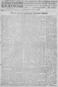 З А Б О Л Ь Ш Е В И С Т С К И Е К О Л Х О З Ы 7 ноября 1943 г. № 61 (715) НАШИ ЗЕМЛЯКИ В Б ОЯХ ЗА СОВЕТСКУЮ РОДИНУ С именем С Т А Л И Н А и д у т в бой советские бойцы и Наша часть получила приказ прорвать оборону противника, выбить немцев i s паселенного п у н к т а . Группе разведчиков, «второй командовал я, поручалось рааведать передний край обороны немцев, определить их оптовые точки, систему оборони. Приказ был получен вечером В нашем распоряжении было иееколько часов ночи, та к как иа рассвете часть должна была качать наступление. Проверив оружае и уточнив нрнкав, наша группа равведчи- ков выступила на выполнение боевого задания. Передвигаться приходилось с величайшими предосторожностями. Местность перед передним краем противника была почти чистая и простреливалась из пулеметов, автоматов. Вивреди чернела кромка леса, подле к о торой был расположен передней край обороны немцев. За лесом находились деревня, которую фашисты прекратили в опорный п у н к т . Подступы к пей были минированы, обнесены колючей проволокой. Мы ползли по пластунски, сливаясь со снегом, зорко всматривались в темноту. Вое шло благополучно. Вот ужо осталось немного места до вражеского рубежа. Еще несколько напряженных минут в мы у цели. Минуты ползут мучительно долге. Слышим лающую речь нем- нов. Так и хочется послать очередь из автомата в проклятых фашистов.Но у нас приказ другой. Определяем характер вражеской обороны. Немцы искусно замаскировали свои огневые точки. Во от зоркого глаза разведчиков нвчто не укрылось. Мы безошибочно определили 5 пулеметных точек, 4 минометных, 2 орудия. Прово вечные заграждения немцев т а к же были разведаны нами.Раздобыв эти ценные сведениями отправились назад. Собранные сведения сослужили огромную услугу пашей части. На рассвете заговорила наша артиллерия, минометы. Немцы ответили ураганным огнем. 1о их огневые точки были вскоре подавлены. Наша пехота ринулась на врага. Фашисты упорно оборопядись. Завязался жестокий бой. Но ничто не могло удержать красных воинов. С возгласами «За Родину!», «За Сталина!» бросались на врага наши воины, выбивая немчуру ив занимаемых рубежей. Немцы цеплялиеь за каждый выступ, с упорством обреченных оказывали еопротпвление. Особенно сильный бой разгорелся на подступах к ■введенному пункту. Бой продолжался целый день. Е вечеру наша часть опрокинула врага, отбросила его далеко ■а запад. Много немецких сел- дат н офицеров было убито. Мы еахкатнли огромные трофеи: ЮС автомашин, сотни мотоциклетов, подбили и уничтожили десятки танков, захватили склад е соеивым снаряжением] Во время боя я находился в первых рядах. Затем моей груп пе разведчиков был дан приказ пробраться во фланг противника с целью выяснении не но пытается ли враг обойти нас. В ы п о л н я я этот приказ, мы натквулнсь на г р у п п у фашистов в 8 чел., которые, вероятно, с целью разведки направлялись в нашу сторону. Завязалась перестрелка. Мы уложили 5 -х немцев, а остальных захватили в плен, которых доставили в штаб своей часта. За выполнение этой / боевой операции командование армии Западного фронта наградило меня медалью «За боевые заслуги». Мне было присвоено звание старшего сержанта.. После этого наша часть с боями гнала немцев вплоть до самого Ржева. Наша часть стояла недалеко от г . Воронежа, который немцы превратили в сильно ук- реплепный опорный пунк