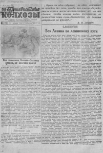 С l u£ j ( ¿ i£ } t ú J L f j )лет i p u i t всех ст р а н, соединяйтесь! О р г а н С е в е р н о г о Р К ПКГ1(6) и Р а й с о в е т а д е п у т а т о в т р у д я щ и х с я Н о в о с и б и р с к о й о б л а с т и . 13(725) 21 января 1944 г. пя тница |Цсна 15 коп M W - " „ П у ст ь ни одно собрани е , ни одно совещание \не пройдет без того, чтобы при всяком обсуждении на первом месте не с т о я л вопро с : все ли мы сделали , чтобы помочь войне, достат очно ли напряжены наш и силы, д о ст ат очн о ли помощи отправлено на ф р о н т ? . ..* ____________ _________ ______ В . И . Л Е Н И Н . Д . М А Н У И Л Ь С К И Й Б ез Ленина по ленинскому пути 20 л о т назад п е р е с та ло би ться к а за л в военное времз. Н е с м о т - о р г а н и з а т о р а с оц и а ли с ти ч е с к ой сердце Владимира И л ь и ч а ¿ е а и - ри на временную у т е р ю важ ' с т р о ч к и , р у ковод ителя t o n » f » к о на. Г е н и а л ь н ы й м ы с л и т е л ь , осяо- н и х с е л ь с к о х о з я й с тв е н н ы х р а й - 1го г о с у д а р с т в а и в о ж д я н в р е д и и х а а т е л ь могу чей , подлинн о народ- онов, колхозы без серьезных переп о й п а р т и и большевиков , и р г а - баев снабжаю т Красную Армию н иза тор и вождь В з л и кой О к т я з - 1 в с т р а н у продово льс твием , л Цье ко й с о ц и а л и с ти ч е с к о й револю промыш ле нно с ть сырьем .Без к о д - ц и в , создател ь С о в е тс к о г о г о с у - ' хозного с г р о в . без самоотвержен м р с т а а — так ов б ы л Л е н и н . Т а р н о г о т р у д а к о л х о зн и к о в и ко л х о з ов ы о п вечно б у д е т ж и т ь в п а - ни ц мы не с д о г л а бы р е ш и т ь п я т и наше г j народа в т р у д а .чту г р у да ru.u/x> з а д н / . Советское п р а в и т е л ь с т в о су идя х " я в с е ю мира. На о с н о в е - Л е н и н е к о г о у ч ен и я мело в к о роткие срока з з а к у и р о - т а р т и я ноль пени ков я с оветск ий Ва т ь п р е д п р и я т и и из у г р о ж а в Под знаменем Л е н и н а -С та л и н а вперед, на разгром врага! f r на р о д под р уководством т о в а р и щ а С т а л и н а построила с о ц и а л и с ти ч е с к о е общество. у к р е п и л со m u i р а й о нов , бы с тр о н а л а д и т ь и х работу на н о з ы х м ес тах,п ире к л ю н и т ь п р ом ы ш ле нно с ть я сель 20 л е т нрошло со д н я смерт и В л а д и м и р а И л ь и ч а Л е н и н а — -Щсрганизатора бо л ьш е ви с тс к ой пар О т и и , с оз дател я первого в мире с о ц и а л и с ти ч е с к о г о г о с у д а р с т в а , в о ж д я , у ч и т е л и и д р у г а т р у д я щ и х с я всего мира. Л е н и н умер, но д е л о его ж и - < 9 1 . Бе ссм ертен д у х л е ни ни зм а , бессмертно о го в е л и к о е у ч е н и е . Под р у к о в о д с т в о м ген и алььо.н ) П р о д о л ж а т е л я деда Л е н и н а то /■■“ ■'ища С т а л и н а народы Совет ^ »го Союза в ы п о л н и л и заветы своего в о ж д я . З а 20 л е т , про ш е д ш и х со д н я смерти товаре ща Л е н и в а , с т р а н а Сове тов п р о ш л а г и г а н т с к и й п у т ь борьбы з по беды , с т а л а м о г у ч е й и н д у с т р и ал ы ю й д е рж а во й с самым п е редовым с о ц и а л и с т и ч е с к и м сель ским х о з я й с тв о м , отечеств ом социализма, способным в ы д е р ж а т ь любые и с п ы т а н и я . 20 год овщ вп у со д н я смерги 'В л а д и м и р а И л ь и ч а Л е н и н а на ша с т р а н а в с т р е ч а е т на 3-м г о д у великой о т е ч е с т в е н н о й во йны со з лейш им вр а гом народов В о е н н а я о п а с н о с т ь еще б о л ь ше с п л о т и л а народы Со ветс кого Союза, пр е в р а ти л а и х в не сок р у ш и м у ю , м о г у ч у ю с и л у . У с п е х и н а ш и х войск на ф р о н т е , д о о т и ж е н и н т р у ж е н и к о в т ы л а - с в и д е т е л ь с т в о морально п о л и т а ч е ско го е д и н с тв а советского н а р о д а , кр е п о с ти н а ш е г о г о с у д 