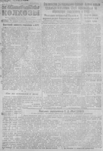 Z C a J t H f U S . о и л л и f ' 1 У : . p <. пролетарии всех стран, соединяйтесь! Б П И0Щ ш ш Ознмаенуем М годовщинуНраснси Арин новым ТРУДОВЫМП0ДМШ1. !ÉpE 1ор1Ш|Ш$8 Opi ап Северного трудящихся P l í В К П ( ( ) и Рей света д е п у т а т е * H c b u u i L c j е к о й области. i образцовую щ п т ш у н osé ! ^ Н Н Н Н М Н | ^ | Н Н З £ ^ ' № 4 ( 7 2 0 ) 2 8 я н в а р я 1 ^ 4 4 - iГ. П Я Т Н И ц з Дота 15 ион Б ы с тр ей завезти горючее в МТС Работника МТС и все трудящиеся нашего райопа с огромной радостью встретили известие о црисужгеиня Новосибирской области переходящего Красною Зваыепи Государственною Коми- тета Обероны за успешный ремонт тракторов в 4-м квартал*. Н ответ на эту высокую награду и на новые боевые успехи Красной Армии трудящиеся изгое шего райова отвечает самоотвср '*г жевным трудом. Сейчас в колхозах, МТС идет упорная, напряженная работа по подготовке к веспо: ремоптиру ами.ТсЯ сельхозмашины, плуги, бо ироиы, сбруя, Готовятся сечена, собираются и вывозятся на поля местные удобрепия. líce думы чаянья колхозного крестьянства направлены к тому, чтобы вы полнить поставленную перед я \ Шим сельским хозяйством зада ч у —завоевать в 1044 году высокий военный урожай, дать фронту и стране как моаио больше сельхозпродуктов. Выполнение этой важной задачи будет яависить от всего комплекса подготовки н проведения сева. В деле успешного про ведения сева большую роль Оу- < дет играть взаи одействие ж и вого п иехапического тягла. Завоз горючего для тракторов -дело ) огромной важности, известно, тивг{т0 в прошлом году в Северной в Гартасской МТС тракторы по целым пяти спевкам простаивали из-за отсутствия горючего. Урок и прошлого года одиако не учд- тываются. Руководители МГС проявляют и п этом году непростительную беспечность ъ sisóse горючего. - Северная МТС должна завезти квварс 22 тонны горючего, а до настоящею времена ззвезешо ильн ко па комсомольцы в молодежь к ош м а «Красный вацмен», Шало-Кара- : Гаевского сельсовета,з ответ гш . новые блестящие успехи -нини. ! доблестных войск Ленинградскою i Волхов« косо фронтов, освебо- - , г _ дисшях от пемецквх захватчя1,г> Т<)11ПЫ ТаР « < К г о в Краевое Села, Пь сргоф, \ __ Р ' Е¡»«полнила. январский Цотюрод, и я ответ па вручезаубзд ю рючего всего т о л ь - , пие паш?й области переходящего 0 < * * и ь и ы . РУ1®- Красного Знааеии Государственною Д ,1И квЛ10Д п Ч'лкже не про,- [ Дцдиста Обороны за успешпый i .1,) пт Äo*wKHol лаьоты о выборе , ¡ eu0HT трактброн в 4-м кварт* Молодые патриоты! Будьте в первых р^дах борцов за урожай О б р а щ е н и е к о м с о м о л ь ц е в и м о л о д е ж и к о л х о з а « К р а с н ы й н а ц м е н » , М а л о К а р а т а е в е к о г о с е л ь с о г е т а , к о в с е м к о м с о м о л ь ц а м и м о л о д е ж и С е в е р н о г о р а й о н а Д'рвгне товарищи! Мы рааант трзтероно дню Армии ¡ Й В Д гщчочаго. Колхозы- Северной МТС пизорно сорвали график в ы - ! возки горючего, це выполнили его и колхозы радиуса Та р т е - ской M i С. Председатель колхоза до 1944 г . обязуемся: 1. Закончить весь ремонт сельхозннвепт'рн к 15 февраля 1944 года, для чего орюнязоt, я - - нать бригады по сбору запч«с «Верный путь» т. Волков, имея тсй -К _ I? наряд вывезти в январе 1,5 то ;пы горючего, не вывез ни кило: рамхга Неужели той. Вол ков во думает в этом году сеять? Иол*кепи* с вывозкой горючего Д1Я MIC исключительно трв-1 ножное. Однако ии председатели ! сельских советов, пи дирекция MIC пе проявляют об этом дол-; жгой заботы, срывают к сельхо. инвентарю, анстру- меяов и ««т