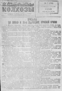 з а б о л ь ш е в и с т с к и е к о л х о з ы 22 феараля 1944 г. № 7 (729) ПРИЗЫВЫ ЦК Ш Ы ) К 26-й {Окончание. Н а ч а л о на 1 странице) ч ш в в а й т е с ь на в р а г а . Поливайте немцев огнем аз а в т о м а т о в ! эсво ¡ о д и н л е й р о д н я м ! Да з д р а в с т в ую т советские а в т о м а т ч и к и ! 3 4 . Всеобщее военное обучение граждан и гражданок 2 1. Свячиеты К расной А р м и и ! Помойте, что хорошая С С О Р укреил - мощь нашей родины. Советский с в я з ь я в л я е т с я важ н ы м условием п о беды на врагом. Все* п а тр и о ты а п а т р и о т к и ! Н а с то й ч и в о и з у ч а й т е военное дело мерно у л у ч ш а й т е дело связи в Красной А р м и и , о б е с п е ч и- 1 Го т о в ь т е с ь в с т а т >уме. ¿ми я о т в а ж н ы м I з а щ и т н и к а м и р ^ и н ы ! лапте у с п е х ее н а с т у п а т е л ь н ы х о п е р а ц и и ! 3 5 . Все наш и с и л ы — на, по дд е рж ку н а н н й г е р з а ч е с - Да з д р а в с т в ую т советские с в я з и с т ы 1 | к ои Красной А р м и и , н аш е го елавтого К р а с н о г о »[»лота! 22. Бо й ц ы и командиры и н ж е н е р н ы х войск ! Всеми В с е силы народа— на разгром вр ага! I перед, з а н о ш у победу! в1Лами и средствами п омогайте н аш и м н а с т у п а ю щ и м З Б . Рабочие и р а б о тн и ц ы , инженеры в т е х н и к и ! Рабо- войскам ф о р с и р о в а т ь р е к и , преодолевать шивные поля, тайг< , не покладая л у к , на н с д д е р а к у Фронт»! Д а в а й т е в х к р е п л я т ь и р а зв к в а т ь у с п е х и н а с т у п л е н и я ! . н а с т у п а ю щ е й Красно:; Арм т вс«1 больше т а н к о в , самолетов, 8 а з д р а в с т в у ю т и нж е н е р ны е ча ств Красной А р м и и ! о р у д г й , минометов, г у д е м ш о в , Евтоматов, г а в К и о к , боянри- а здра в с т в ую т нашв славные с аперы 1 м и н е р ы ! <, пасов , у л у ч щ а Г т е к: чествэ б о е ю й И | "ы у к1 и и ! 3 7 . . Советские ж е лезнодорожника! С а м о т в е р ж е н Е . о й и четкой работой )бесш чввайте у с п е х наст п л е н т я Красной [ ! Д а в 2 1 . Да зд рав с т в ую т в а ш а с л а в н ы е п о г р а н в ч н в к в , в е р н ы е з а щ и т н и к а с о в е т с к в х г р а в в ц ! 21. Бойцы в к оман двры вой с к противовоздушной оборо- ■ ы ! Бдвтельно о х р а н я й т е н а ш и города, п р о м ы ш л е н н о с т ь , т р а н е н о р т в ч а с т и Красной А р м я н от в р а ж е с к и х нападе- и в ! е воздух а ! Во-время р а зг а д ы в а й т е и с ры вай те з амы - елы п р о т и в н и к а ! У н в ч т о ж а й т а ф а д и с т с и х н алетчиков ! 2 5 . М е д и ц и н с к и е работники К р а с н о й А р м и и ! В р а ч и , фельдшеры, медицинские сестры, с а н и т а р ы и с а н в т а р к и ! Самоотверженно боритесь ва спасение жизни н возвращение в строй р а н е н ы х советских воинов! Да з д р а в с т в у ю т медицинские работники Красной А р м и и ! 2 6 . Р а б о т н и к и войскового т ы л а ! Своевременво и ч е т к о с н а бж а й т е части д ей ств ующ ей Красной А р м и и вооруж е н и е м , боеприпасами и продовольствием, обеспечивайте н а с т у п л е н и е н а ш и х в о й с к ! , Да зд ра в с т в ую т работники войскового т ы л а ! 2 7 . I вардеицы Красной А р м и и я Военво-Морвкого Флота! С честью несите вперед славные Г в а рд е й с ки е знаме на ! Б у д ь т е примером доблести к о т в а г и , воинского м а с т е р с т в а , стрем и т е л ьн ости и н а т а с к а в н а с т у п л е н и и ] Да з д р а в с т в у е т советская- Г в а р д и я ! 2 8 . С л а в а Героям Советского Союза и Героям с о ц и ал и с т и ч е с к о г о т р у д а — л у чш и м с ы н а м нашей родины! 2 9 . П р и в е т войскам л е н и н г р а д с к о г о фронта, о т с т о я в м и м Л е н и н г р а д и полностью освободившим его от в р а ж е с кой б л о к а д ы ! 1 0 . Ч е с т ь и слава доблестным в о и 