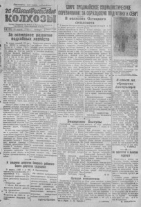ои о и б л и с - ' - ч е К р п е т а р и и всех ст р а н, соединяйтесь ! 2й< колхоз О р г а н С ев ерно го РК ВКП(б) и Р а й с о в е т а д е п у т а т о в т р у д ящ и х с я Ново сибир ской области. 1 3 ( 7 3 5 ) 30 марта 1944 г. четверг | Це на 15 коп За всемерное развитие [ п од собны х хозяйств ШИРЕ ПРДЕМАЙСКОЕ ОЦИАЛИСТИЧЕСКОЕ С0РЕВН0ВАНИЕЗАОБРАЗЦОВУЮПОДГОТВКУ КСЕВ! В к о л х о за х Остяцкого » г / 11« основе решений XII пленума ВЦСПС к решении Совнаркома от 5 января 1944 г. облисполком утвердил для Северного района на 1944 год план посевных -площадей подсобных хознйств предприятий ■ организаций в 215 га. Из них карто ф еля—8 0 га, зерновых- 9 3 га, овощей —32 г а . , с урожайностью картофель — 100 цнт. с га, к а пу ста—от 110 до 140 цнт .,пшеница— Ц д а т . , овес— 12 цнт., крупянно-бобовые—от 7 до 9 цнт. с г а . У нас имеются все возможности значительно перевыполнить этот план. Руководители некоторых предприятий по-деловому готовятся к севу. Северное сельпо против прошлогодних 10 га увеличивает свои посе- иы до 23 га. Здесь подготовлены семопа, увеличено парниковое хозяйство в 2 раза. Уже посеяна рассада капусты и помидор. Вагановский лесхоз (директор т. Рытов) готовит 12 га к посеву. Рабочее и служащие ив Своих дачных запасов вносят се Предстоящая районная XI сессия райсовета должна подробно обсудить работу предприятий и учреждений по подготовке к с е ву в подсобных хозяйствах. Согласно постановления облисполкома у нас в районе должен начать работу пищеиромком- бкнат, как основная база местной пищевой промышленности, который в резуль тате освоения посевов^ (я атом году 14 г а ) , развития животноводства, использования местных ресурсов по заготовке дичи,*, ры бы и дикорастущих должен органа зоаать предприятия по выпуску различных пищевых продуктов. Но в результате неразворотливое™ райисполкома до сих ю р не утвержден директор ии це- промкомбината я организац(ей этою большого дела в рагоне никто не занимается. Облисполком утвердил на 1 9 4 4 год иметь в подсобных хо зя й с ки х предприятий и организаз а й крупного ^рогатого скота— 94 о В колхозах Остяцкого сельсою та широко развернуто соц а л и г - тичеекое соревнование за Образ Новуюподютовку к севу. Соревнование проходит под до ¡унтом высококачественного проведении сева в получения 1 0 0 . пудового урожаи зерновых с гектара, а картофеля — 1 .0 0 0 пуд. Колхоз «Красная звезда» взял обязательство с отдельных участков получить по 1 50 пуд. зерновых. На-днях проводилась ироверка готовности колхозов к севу. Лучшие успехи имеют колхозы «Северная з а р я » , «Единый путь» и «Красная звезда». В колхозе «Севервая заря» (председатель т. Баннов) высококачественно и и полностью отремонтирован весь есльхозипвептарь и сбруя. Пол ним ходом здесь вдет ремонт гелег, Фургонов и таратаек для коров. Кузнец Копрелов закон сельсовета со р монтировано 20 плугов борон. 15 этих колхозах ужо о р г а низованы бригады и звенья. За бригадами закреплены тягло, инвентарь, отведены земельные участка. Организованы также комсомольско-молодежные бригады, которые поставили целью собрать с закрепленных за н и м и участков рекордные урожаи. Но есть в Остяцком сельсовете и отстающие колхозы. В>' т, например, колхоз ям. Сталина, где председателем работает Белова. Колхоз к севу не готов. Руководители этого колхоза за- н и а я ю к я всем чем угодно, во только не подготовкой к севу. Сбруя отремонтирована недо