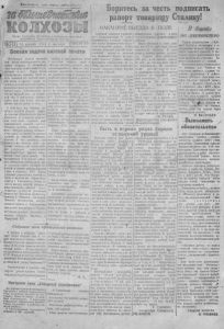 ï ü летарии всех стран, с*е9инЯитесь[ Орган С еверн о го F'K ИКП(б) и Р ай с ове т а д еп у т а т о в т р у д ящ и х ся НовосиСирской области . Б ори тесь з а ч есть п о дп и са т ь рапорт товарищ у Сталину! В борьбе v Д е в а 1ч> кои- 1 /15(737) 13 апреле 1944 г. четверг ; Боевая задача низовой печати Н а с т у п а ю т те п лы е ве се нние Однако в ряде , колх озов дело дна. З ем ля ос вобож дае тс я от сне - ’ с в ы п у с к о м с г г н н ы х г а з е т и жного покрова. В б л и ж а й ш и е «Б о е в ы х л и с т к о в о б с т о и т не у д н я к о л х о з ы н а ш е го р а й о н а п р и - дов летворительпо. М н о г ие пер- с т у п а ю т к с е в у . Перед вс еми я и ч н ы е п а р т и й н ы е о р г а н и за ц и и т р у ж е н и а м и дер евп и стоит за- ни' р у к о в о д я т в и д н о й п е ч а т ь ю ,н е ^ дача п р в в е е ти сев т р е т ь е й в о е н - * во'й ве сны в с ж а т ы е ср о ки , па ,1 вы со ком а г р о т е х н и ч е с к о м уровне, .■множить о с но в у вы со ко го урожая С е й ч а с дор ог д ей с тв и те л ьн о не т о л ь к о к а ж д ы й день, но а к а ж дый ч а с . В дни к а н у н а полевых работ надо е щ е и еще раз про а е р а т ь все л в ю т о в о к севу. \ В этом г о д у м ы обязаны п о - ; л т ч а т ь в ы с о ки й ур ож а й , добиться п о д ъ ем а общественного ж и в о т новодства . В у с п еш н о м разреш ен и и э т и х задач огромна я родя п р и н а д л е ж и т низовой пе ч а ти , с т е п н ы м г а з е т а м , «Боевым л и с т к а м » , кото рые должны м обилизов а т ь м а с с у на борьбу^за в ы с о ки й у р о ж а й , ва развитие ж и в о т н о в о д с тв а . В т е х к о л х о за х , где г р е д к о л л е г и и с т е н н ы х газет р а б о таю т у с п еш н о , где газеты в ы х о д и т р е г у л я р н о , разв е р ты в аю т б о л ь ш е в и с т с к у ю к р и т и к у недост а т к о в — т а м у с п е х налицо. На (, п р о хо дивш ем ¡¿-го апреля районном с о в е щ а п в и рабселькоров б ы ло проведено много приме ров х о р о ш е й и плохой ра б о ты с т е н н ы х г а з е т в к о л х о з а х , М ГС . Хор ошо р а б о т а е т редколлегия стенпой г а - в е т ы в колхозе им. Тельмана(ре-' д а в т о р т. Филимонова) Га зе та пом о г л а к о л х о з у наве сти порядок в ж а в о т н о в о д с г в е , н еп ло х о п о д г о то в и т ь с я к с е в у . В р е з у л ь т а т е ко л х о з нм.- Т е л ь м а н а д е р ж а т п е р венство в Северном ... сельс овете . Непло хо организовала в ы п у с к с т е н п о й п е ч а т и в Ч у в а ш н н е к о м сельсовете комсомолка т. Г а н п п а , р е г у л я р н о вы х о д я т ст ен г а зе ты в колхозе « П а м я т ь Ч к а л о в а » , в Т а р т а с с к о й МТС. п ом огаю т р едколле гиям в работе. В к о л х о з а х О с т я ц р з г о . з н е к о т о р ы х колхозах О с т а п и1^вог о, Ч с ба к о н с к о г о се л ьс о в е та * ст ен н ы е газеты не в ы х о д я т со всем . Т а к о е по ло ж ен и й т е р п и м о бы т ь во мож е т . Необходамп д о б и т ь с я , ч т о бы в к а ж ; о м колхозе р е г у л я р н о , выходили стенные г а з е ты , пом ог а л а у с п еш н о м у проведению сева НАКАНУНЁ ВЫЕЗДА В ПОЛЕ Се верпы й сельс ове т С'феввует-1 о б я за тел ьст во г о л у ч и т ь в атом си с Г р а ж д а н ц е в с ки м В основу ¡ г о д у Ш О и у д о в ы г у р ож а й с каждог о соревнования п ложеяо обраще- г е к т а р а , пие сессии Дм итриевского сельсо- • Плохо гото вит ся к севу кол- кет а Та тарс кого ра й о н а . Сейчас [ х о з и м . - 1 7 - г о нартсъвв да ( п р е д - колхозы з с т у п а ю т в с а м ы й от вет - с е д а т е л ь т . J оба шов). Б это м с т в е н п ы й период— в ве ссиний к о л х о з е лошади крайне н етощесев, нач и н а е т ся борьба за п о л у чение высокого у р о ж а я победы Колхозники с о р е в н у ю т с я з а то, чтобы зав о е в а 