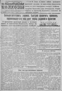 2 З А Б О Л Ь Ш Е В И С Т С К И Е К О Л Х О З Ы 5 и ю л я 1 9 4 4 г № 3 0 (752>'0* Партийная жизнь Шире размах агитационно-массовой работы В аж н е й ш ую роль в у спешном проведении фронтовой декады но выполнению осповных сельхозр абот должна с ы г р а т ь а г и г а ц п о п но-массовая работа с населением. П а р т и й н ы е о р г а н и з а ц и и , а г и т а торы должны всю свою работу проводить иод лозунгом вы волнения к л я т в ы , данной товарищу Сталину в первомайском рапор те. Се к р е т а р и пар т о р га н и з ац и й долж н ы повседневно контролирова ть работу а г и т к о л л е к т и в о в , о казыва ть им необходимую помощь. П а р тийн о -к анд ид а тск ая г р у п п а Ирибе липского сельсовета ( с е к р е т а р ь т . Григорьев) серьезн о в система тически за ни м ае тся а г и таци онно массовой работой с населением. Агита торы регулярно проводят в бригадах ч и т к и газет, ж урналов, сообщений Соиинформ бюро, вы п ускаю т стенные газеты и «Боевые л и с т к и » . Л у чш и м чте цом-беседчако* я вл я е т с я в кол хозе «Правда» т . С и н и ч к и н а . Она в период сенокоса в ы и у ств л а 5 стенгазет и « Б о е вы х листков» проводит у ч е т соцсоревнования, у ст р а и в а е т громкие ч и т к и газет. В Прибелинском сельсовете за время сенокоса всего выпущено 5 стенгазет, 19 «Боевых л и с т ков», сделано 4 доклада, в ы п у щено 3 газеты « м о л в и а » г проведено 23 беседы. Хорошо поставлена а ги т а ц и о н ная работа в Останинском сельсовете, где а ги тколлективом ру ководит кандидат па рт и и т. Адо- н и н а . Помимо проведения массовой р а б о т ы , а г и т а т о р ы участвуют непосредственно в работе на се нокосе и др .Н апример, а ги та то р учительница т. В и тю гова вмеси с колхозниками к оси т сено, зак ладывает силос. В О с т а н и н ш организованы доски почета с фо тографиями л у ч ш и х люден, «Чем ты помогф р о н т у?» Но есть и т а к и е па р т и й н ы е о р ган и зации , которые но на стоящему не руководят аги таторами. Н-Троицкий а г и т к о л л е к т и в , кото ры м руководит т. Кузнецова работает из р у к вон нлохо , а сек ретарь парторганизации т . Бух- тияров ничего не делает для того, чтобы оживить э г у работу Плохо работают Граждапцевский и В ерх -Красноярский аги ткол лективы. Задача всех п а р т и й н ы х в комсомольских организаций зак лючается в том, чтобы поднять на новую вы сш ую с т у п е н ь п а т риотический подъем масс, мобилизовать все силы колхозной деревни на успешное выполнение очередных военно-хозяйственных задач. М. С А М О Й Л О В А , зав. райпартнабинетом Все население—на поля! М о л о д еж н ая бригада В колхоз е «Красный нацмен», Мало Ка р а г а е в с к о г о сельсовета . организбвана молодежная бригада по з а готовке к ормо в для 15 лошадей, выделенных в ко сяк. В б ри г а т е 10 человек Она р а з б ит а на 2 группы Первой группой руководит т. Журавлева , второй — т. Ле с никова . Конюх косяка Попов Василий т а кже принимает активное участие в з а г о т о в к е кормов- Э т а б ри г ад а взяла обязательство поставить 1.500 цнт. с ена З а пеовые пять дней выкошено 50 г ек т а ров трапы, 115 цнт. с ена уже за ск ирдо вано Вн у т ри бригады развернуто соревнование. Нормы выработ ки перевыполняются. П А Н Т И П И Н , председатель М- Ка ра г а ев ск о г о сельисполкома. В обс тановке р а с х л я б а н н о с ти 10 часов утра . Солнц« прппе- От Советского Ифномрбюро Друу 'ная работа Т у ч н ы е и частые расТ). он-! поля до тех пор ,пока не выпол- че хлеба на полях колхоза им. : няли задание.