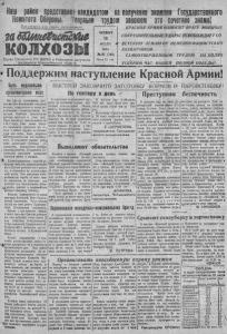 Наш район представлен кандидатом на получение знамени Государственного Комитета Обороны. Оопрнымтруден завоюем зто почетное знамя! Про летарии в с е х стран, соединяйтесь] В-------------- - А КРАСНАЯ АРМИЯ НАНОСИТ ВРА ГУ МОЩНЫЕ КОЛХОЗЫ О р г а н С е в е р н о г о Р К В К П ( б ) и Р а й с о в е т а д е п у т а т о в ________ т р у д я щ и х с я Н о в о с и б и р с к о й о б л а с т и ЧЕТВЕРГ 1 3 ИЮЛЯ 1 94 4 № 3 1 (753) Цена 15 Fon СОКРУШИТЕЛЬНЫЕ УД А РЫ, ОСВОБОЖДАЕТ СО ВЕТСКУЮ ЗЕМЛЮ О Т НЕМЕЦКО-ФАШИСТСБИХ ЗАХВАТЧИКОВ. САМООТВЕРЖЕННЫМ ТРУДОМ НА ПОЛЯХ УСКОРИМ ЧАС НАШ ЕЙ ПОЛНОЙ ПОБЕДЫI 3<1 Поддержим наступление Красной Армии! Быть подлиняыаи I органиэнорами »асе Вот уже на пр отяжении н е с к о л ь к о лет Би а зи н с к и й сельсовет неплохо, сир&нляется со веема х о з я й с т в е н н о— полита ческам и з а дачам«. Особенно показательно работал сельсовет в этом году. План весеопего сова выполнен на 1 4 3 ,7 проц. У ж е давно колхозы сельсовета пропололи все посевы и сейчас др ужио заготовлют П р и для скота. План развития животноводства т а к же в ы п ол н я е тся . В сельсовете хорошо рабоу тают к у л ь т у р н о - б ы т о в ы е у ч реж де ни я , разв ивается местная д промышленность . Т р у д я щ и е с я Бя- азинссого сельсовета проявляют большую заботу о школа*. У с п е х и сельсовета— прямой рез у л ь т а т того,что нредсель нсполко- ма т. Абрамов работает не в однпоч- к у , а о п и ра ет с я на многочисленный акти в . В се население мо б и лизовано на борьбу з а честь своего сельсовета, не покладая рук работает нзд выполнением обязат е л ь с т в , д а н н ы х в первомайском -рапорте товарищу С та л ину . Неплохо справляются со всеми задачами О с т я ц к и й ,М а л о - К а р а г а - евский сельсоветы. З н а ч и т е л ь н о у л уч ш а л и свою работу Прцбелин- ский , Останинсвип сельсоветы. Однако у н а с имеется немало и таки х сельских Советов, которые все еще работают очень плохо. К нам относятся Б * К ул и ко в с ки З , В -К ра сноярский, Гр аждавцевскай , Федоровский и некоторые други е. Особенпо отстает Б -К у л в к ов ски й Совет. Задача заключается в том , чтобы активизировать работу Со ,1 вето в,превратить и х в подлинных организаторов масс. Н аш район представлен кандидатом на п о л у ч е н и е переходящего знамени Го сударственнего Коми тета Обороны. Нужно по д нять всех т р у д я щ и х с я района па борьбу за честь завоевать это почетное знамя . Особое вн имание должно б ы т . уделено развитию социалвс" тического соревнования. В осно' ву всей работы должно быть положено постановление Совнаркома СССР от 5 февраля 1 9 4 4 г. «О мерах по подъему сельского хозяй ства Новосибирской област и » . В конце июля созывается IX сессия районного Совета депута - тов т р у д я щ и х с я , на которой бу Дут подведены и то ги соревнова» нпя сельсоветов. Дело величайшей чести всех се л ь ск их Советов т а к организовать работу, что- **ои завоевать первенство в сорев новании. БЫСТРЕЙ ЗАКОНЧИТЕ ЗАГОТОВКУ КОРМОВ И ПАРОВСПАШКУ! По г е к т а р у в д е н ь ” С о гр ом ны м напряжением т р у - | дятся на заготовке кормов кол- хоэпикн селыо з тртел и « Н о в а я : жизнь». Особенно хорошо работают косари в р у ч н ую тт. Летова Елппа, Цы г ан ко ва Анн а, Ш аурко Ц е т г е я . За 10 дней фронтовой декады они скосили по 9 , 6 0 га т р а в ы каждая . 10 ию ля у них бы л а особенно рекордная выраб о т ка . В э т о т деаь они скосили по полтора г ек т а р а . В колхозе уже з г с А г о в а н о 8 2 6 цвт. cena, кроме того с к о шено травы св