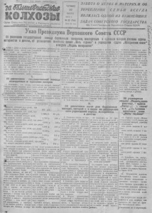 Пролетарии всех стран, соединяйтесь ! г. :^ш:хтл; Орган Северного Р К ВКП(61 и Райсовета f епутат .трудящихся Новосибирской области 0 3 ЧЕТВЕРГ 20 И Ю Л Я 1 1 9 4 4 г. ЛЬ 32 (754) Ц гпа 15 ьсн. • ■ —í * — i i f „ •«* I | ЗАБОТА О Д Е Т Я Х И М1\ И ОБ УКРЕПЛЕНИИ С Е М Ь И В С Е Г Д А ЯВЛЯЛАСЬ ОДНОЙ ИЗ ВАЖНЕЙШИХ З А Д А Ч СОВЕТСКОГО ГОСУДАРСТВА < И з У к а з а П р е з и д и у м а В е р х о в н о г о С о в е т а С С С Р ) ---------- ■—■ м тгшья л _ . * * * ИСС* . . . л , . . . - ч - Указ Президиума Верховного Совета СССР матеаинства,Ни%етрСтя3^пйВе п'<е|*8М8ННЫМ женщинам, нногодегным и одинонин матерям, усилении охраны " « - ■ Ас.гн.р--, с. установлении почетного звания „Мать героини* и учреждении ордена „Материнская слава* имедали „Медаль материнства“ •З^Пота о д е т я х и матерях и об ется дальнейшее расширение мер о и р и я т и й государстве иной ко мощи. ^ г ё ф е а л е и и и семьи всегда я в л я лась отрой на важнейших задач Советского >осударства. О х ра няя ин тересы м а т е р и и р.беп- ■ к а , государство ока зывает боль ß целях увеличения м&те|иаль пой помощи бе|еменным жеш ци - ’ * I------ vv<J»»i i - ----- -- ш у ю ма те р иа л ь ную помощь бере- • Sf> и н о г о д е т в ы и и одинок . . . _ _ ............. .......... ....................... u a r n n m i ..................... ... ............. ........ . . . . м е п н и м ж е н щ и н а м п матерям па содержание и во спитание дет е й . Во вре м я войны п после войны, когда для м н о г и х семей имеются более зн ачительные м а те риальные за трул пеная , требу - матерям, поощрения многодетно ста и у с и л е н и я о храны материн ства и детства, П ре зи диум В е р ховного Совета Союза С о г е т с к и х С о ц и а л и с т и ч е с к и х Респуб л ик п о ста ноял л е т : с тоящей статьей , выплачивается | лает поместить в детское учу еж--| г) обязать наркоматы в нрек* доаолввтельчо к пособию по мао- делио рожденного ею ребенка на т а х п р о м ы ш л е н н о г о строи тель - I. Об увеличении государственной помощи многодетным и одиноним матерям 1. У ст ан о в и т ь , что юсудар- с т ве н но е пссобве выдается я нш о д е т ы м матерям «имеющим муж,, и вд о ьым / , имеющим двух детей нри-^ождения т р еть е г о и каждо ^ т о следующего ребенка вместо н ы и с с у щ е с т в у ю щ е г о порядка вы дачи государственно го пособия год е т н о с т и , получаемому к сот тветствии со второй ста тьей пас тОящего У к а з а . При вступлении едннокой ма тори в брак право па иособве^ ■предусмотревши н а с т о ящ е й с т а т ь е й , за ней сохра ня е тся . М а т е р и ,, иолуч»видке ал и м е н т ы на детей, р о д ивш их ся до изд а н и я на стояще го У к а з а , сохра вяю т свое право па получение алиментов до совер ненолетия ре- , бейка и иособия, . предуемотрен- 1п о ю настоящей ста ч е й , не повоспитание, детское,, учреждение обязано п р и н я т ь ребенка па со с т ва преду сматривать с т р о и т е л ь ство де т с к и х учреждений ( ае л и , держание и во»п a m i n a иглнос- детсады , к ом н а ты матери и ре- ¡ т ь ю з а г о с у д а р с т в е п ь ы й с ч е т . б ел ка ), р а с с ч и т а н ны х на по лный ДУЧЕ ЮГ многодетным м атер ям , имегощим . : шесть детей, ори |ожденпн седь* I Мате ри детей, родившихся в мого в каждовд следующего ре- ' 1 9 4 4 году до I зд ан ия пь стоящ е бенка. ' 1{О У к а з а , не голучагощче пи. 2 . В ы п л а т у государственного них ялимептоп, имеют право на поегбия многодетным м а т е р я м получение иособия, преду смот производить в следующем п о р я д - , р е в с о г о на с т о я щ й с ы те й . ке и размере: I 4. Е с л и одинокая мать нозгел | М ать ребенка имеет право вз ять о б р а т е н сво