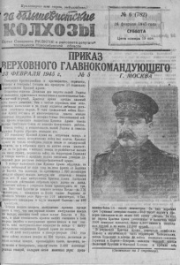 Пр олет а р и и веет стран, соединяйте«/.! № 6 ( 782) - 24 февраля 1У 45 года СУББОТА Орган С е в е р н о го РК ВКИ(б) и райсовета депутатов трудящихся Новосибирской области Цена номера 15 коп. • ' V с П РИ КАЗ Ш Ф Е В Р А Л Я 1945 г. I 9 То вар ищ и к р а с н о а р м е й ц ы и краснофлотцы, с е р ж а н т ы , 1 |фицсры и г е в е р а л ы ! О г о д в я мы празднуем ¿ 7 годовщ ину ^ щ е с т ь о в а п н я Красной А р м и и . Созданная великим Л е н и н ы м для з а щ и т и нашей Родины от нападения ч у ж е з е м н ы х з а х в а т ч и к о в и выпестованная больAucf невской п р ти е й , К р а с н а я А рмия нрош ла с л а в н ы й п у т ь своего р а з в и т и я . Она с честью оправдала свое исто риче ское н а зн а ч е н и е и по п р а в у я в л я е т с я любимым д е т и н а м советского н а рода . В годы г р аж д ан ск о й войны К р а с нея А р м и я от с т о я : а о т м н о го ч и с л е н н ы х врагов молодое советское государство . В в е л и к и х битвах Отечественной войны против нем ецко го н а ш е с т в и я К ра сн ая А р м и я сиасла народы Советского Союза от немецко фаш истско го рабства, 1гстонла свободу и нез ави с им о с т ь нашей Родины и помогла а родам Е в ро п ы с б р о с и т ь немецкое иго. 2 7 годовщину Красной А р м и и мы встречаем т е п е р ь в обстановке новых и с т о р и ч е с к и х побед над врагом. К ра с н а я А р м и я не только освободила родную землю от ги тл ер ов с к ой м в ч и с т и , по и отбросила в р а га на многие сотпи к илометр о в за те р у б е ж и , с к о т о р ы х немцы цо разбойничьи напали на в а ш у с т р а н у , пе ре оесла войну на те р р и то р ию Гер м ан и и и теперь вместе с а р м и я м и н а ш и х союзников у с п е ш н о д о вершает дело разгрома немецко-фашистской а р м и я . | В я н в а р е нын еш не го года К ра сная А р м и я обрушила на [: в р а г а небывалый по силе удар на иссм фронте от Балтики до Карпат^ Она взломала на п р о т я ж е н и и 1 . 2 0 0 километров мощную ооороиу нем цев , которую они создавали г. течение ряда лет. В ходе н а с т у п л е н и я Красная А р м и я быстрыми и умелыми д е й ст в и я м и отГ»росила врага далеко на запад, f Советские в ) й с к а с у п о р н ы м и боями продвинулись от г р а ниц Вос\ чнон П р у с с и и до нижнего т е ч е н и я В и с л ы — на 2 7 0 |идом ет|ов , с плацдарм а ы Висле южнее В а р ш а в ы до ' я в я в е г и течения реки Одер — па 5 <0 к и л о м е т р о в , с Сан- * дом и некого плацдарма в глу.»ь немецкой Силезии — на 4 8 0 I и о л е т р о в . Б * У с п е х и н аш е го з и м в е г о на с т уп л е в и я пр и вел и прежде всего к том у, что они сорвали зимнее н а с т у п л е н и е немцев па западе, имевшее своей целью з а х ва т Б е льгии и Э л ь заса, и дали возможность а р м и я м н а ш и х союзников в свою очередь перейти в н а с т у п л е н и е против немцев м тем с о м к н ут ь своп н а с т у п а т е л ь н ы е операции на западе с н а с т у - ш т е д ы ш м и о п е р а ц и я м и Кра с н о й Армии н а востоке. За 4 0 дней п а с т у а л е п и я в я н в а р е феврале 1 9 4 5 года ваши войска и з г н а л и немцев из 3 0 0 городов, з а х ва ти л и до сотни военных заводов, производящих т а н к и , самолеты, во- ■ оруженио и б о е п р и п а с ы , з а н я л и свыш е 2 . 4 0 0 железнодо- рожвых стан ци й , о в л а д е л ! сетью железных дорог оротлГЛАВНОКОМАНДУЮЩЕГО № 5 Г. МОСКВА ■ 11' 0 4л ^ . я м ^а г.АЦ,^М>ш у г » * , »«•»'<** $% жением более 15 т ы с я ч километров . З а этот короткий с ро к Г е р м а н и я потеряла с в ы т е - 3 5 0 т ы с я ч солдат и офицеров п л е н н ы м и и не менее 8 0 0 т ы с я ч убитыми. З а э то т же период К ра сн ая А р м и я у н и ч т о ж и л а и з а х в а т и л а о