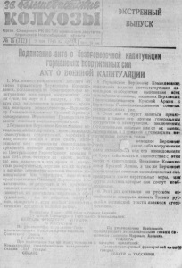 У К А З П РЕЗ И Д И УМ А ВЕРХОВНОГО СОВЕТА СССР Об об'явлени 9 кая Праздником Победы В ознаменование победоносного зав ерш е ни я Ве л и кой О течественной в о б н ы \ с о в е т с к о г о народа против нем ец ко - ф а ш и с т с к и х з а х в а т ч и к о в и о д е р ж а н н ы х и с т о р и ч е с к и х побед Красной Армии, у в е н ч а в ш и х с я полным разгромом г и т леровской Германии, з а я в и в ш е й о безоговорочной к а п и т у л я ц и и , у с т а н о в и т ь , что 9 мая я в л я е т с я днем всенародного т о р ж Ш в а — П раздником Победы. 9 м а я с ч и т а т ь нерабочим дном. Председатель Президиума В е р хо зно го Совета СССР М.КАЛИНИН. Секретарь Президиума Вер хо вно го Совета СССР А ГОРКИН М о с ква , Кремль 8 мая 1945 года. В С о в н а р к о м е С С С Р В соответствии с Указом Президиума Верховгюго 1о СССР об объявлении У мая Праздником Победы Совна^ СССР постановил с ч и т а т ь 9 мая 1 9 4 5 года ыераб* днем. Совет Народных Комоссарок СССР п р ед л ож ил всей в о т с к и м го с у д а р с т в е н н ы м у ч р е ж д е н и я м 9 мая с . г . i ц всенародного т о р ж е с т ва — П р а з д н и к а Победы п о д н я в своих з д ан и я х го с у д а р с т в е н н ы й флаг Союза Со»етс Социалистических Р е с п у б л и к . ÜL Будем работать еще лучше Фашн«,л с н а 'я Г е р м а н и я к а п и т у л про- что внесла свой с к р о м ны й в кл а д в в'йЛа. * Доблестная К р а с н а я А р м и я оде р - ¡д е л о победы. я г л * над врагом в е л и к у ю победу. А1ы| Взрослые м у ж ч и н ы уш ли на фронт. 3 * ал й ч ч т этот день и]»ндет. К олхоз- : Работали на п о л я х только ж е н щ и н ы , аое «феьтьнпство вцесло о г р о м н ы й с т а р и к и , п о д р о с т к и , но о н и с ч е с т ь ю в к л а д к дело победы. Колхоз и м е н и : с и р ш я д и с ь со всеми работами. Тельмана за годы во й ны дал родное и ! Мы об я з у е м с я р а б о т а т ь еще л у ч ш е . ф | о в т у 1 2 . 5 2 2 пуда хлеба, 1 . 1 1G н у - Образцово проведем весенний сев, з а дов м я с а , 3 . 8 9 0 литров м ол о к а и мао- воюем в ы с о к и й у р о ж а й . Э ю .будет г о д р у г и х с е л ь х о з п р о д у к т о в . Помимо наш л у ч ш и й о т в е т па с л а в н у ю победу того к о л х о з и к ол хо зни к и внесли мпо- 1 Красной А р м и и . у Е .М А Л Я Р Е В И Ч , го средств н а строительство в о о р у ж е ни я д л я Красной А р м * и , т е п л ы х вещей для бойцов. Мы г ор д им с я , — тем. продс едатель ни Тельмана. колхоза име Вырастим Ü 9 мая члены к ол х о за с С о в е т с к а я 'С и б и р ь » собрались н а м и т и н г , поезя - дцеыяый П р а з д н и к у Победы. В э то т д е н ь они собрали на л и ч ны м и 5 . 1 4 5 руб . З а й м о вы х средств и обязались к 10 м а я па 100 проц. собрать средства по поди иске н а заем. ' к и и ур ож аи К о л х о з н и к и взяли обязательство в срок и к а ч е с т в е в и о провести весенний сев, в ы р а с т и т ь вы с о к и й урожай. Ф . СЕРГЕЕВ , председатель колхоза *С о ветская Сибирь». П о б е д а Берлин пал. Ф а ш и с т с к а я Г е р м безоговорочно к а п и т у л и р о в а л а . Зло на я г ид ра , отравлявшая чедовече в течеаие д о л г и х ле т своим см н и м дыханием, л е ж и т по вер ж е ны п р а х у н о г на ш е го на род а— победит Советскому пароду принадле г л а в н а я з а с л у г а в победе над фа] мом. Красная А р м и я иронесла ( победные знамен» по р а в н и н а м Под и В е н г р и и , по к р у ч а м К а р п а т с к и х и Зап ад ны х А л ь п , пр и не сл а парс Европы пе только избавление от ш и с т с ко го г н е т а , но и дсмократиче« устройство , л у ч ш у ю ж и з н ь в вели семье свободных д е м о к р а т и ч е с к и х с т | Пришел день, о котором говорил т я ж е л ы е дни и с п ы т а н и й 