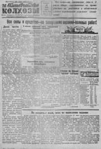 П р о л е т а р и и всех стран, со ед иня й те.'п, О р г а н С е в е р н о г о Р К В К П ( б ) и р а й с о в е т а д е п у т а т о в ______ т р у д я щ и х с я Н о в о с и б и р с к о й о бл а ст и Ч Е Т В Е Р Г 3 1 1 М 94 А 5 Я г. № 1 9 ( 7 9 5 Цояа 15 £00. Все силы— на завершение сева к 5 и ю н я . Ш и р е соревнование за право у ч а ст и я на р а й он н ом и обл а ст ном с л е т а х передовиков сельского х о з я й ства! ! . Все силы исредсвта—на завершениевесене-полевых работ! Дело чести л 14 колхозов пашего района < завершили весенний сея. В бли- ^ Жившие дня заканчивают сов колхозы Остяцкого, Ново-Ели- заровского, Федоровского, 11о- т ш ю и к в ановс с к е о в г , о с п е е л р ь е с д о о в в е ы то е в. З ко а л в х е о р з ы сеют сверх плана, готовятся к с з е ы но М уб а о л р о к -К е а , р п а а г р ае о в в с с к п о а г ш о ко с . ель К с о о л в х е о - г х т а . в т о р ы е самым» первыми в ^район е закончили сев, уже при- А готовили первые силосные ямы я па-днях приступят к заклад- ч»е силоса. Однако темпы сева в целомпо райопу продоласают оставаться совершенно неудоплотворитель- ныли. План сова на 20 мая .-^Ттыиолнен юлько на 66,3 про- "Ацента. Мы намного отстали от ^соревнующегося с вами Михай- '¿¿ловсхого района и других рай- ^ онов области. Время уюдит. .^Ка з п ж и ил т д и ы со з й а и в ж е д е р н е ш п и а ь а ю м щ за и у т е р я о д ж ж н к а и и я с . е с в о а в . Н а Н а е г о с р т б о у ходиом при любых трудностях б за ен ве но ршить ва с т е я в ну к дк 5 се и в юня к . олх О о с з о ы Б-Куликовского. В-Краспоярско- го, Ново-Троицкоге, Чебаковско- го, Чупашинского, Северного сельсоветов. Причина затяжки с д е а в . а—В п к л о о л х х а о я за о х рган В и е з р а х ц - и К я расн т о р я у р - ского сельсовета жились на трактор ц н е ы л й иком пар п к о , ло а на живом тягле работу почти не производят. т к ы ом, имею Се т вер м н е о с м то , П в одо Ч б Н н е о ы б в а е о к - о Т в р с ф о к и а о ц к м , Чувашннском гатый скот в кол се х л оз ь а с х ове Ч т у а в х а . шн Р н о - ского сельсовета на полевых ра0 созыве районного слета передовиков сельского хозяйства По ст ан овл ени е исполнительного комитета Северного районно го Совета депутатов т/^удящихся и р а й к о м а 07п 29 м а я 1945 года. п о с ™ н о п ? я ю т М И раййом В К П ( ° ) 3. П о р у ч и т ь пр ав л ениям кол- ио ст ан о в л яю т | х о з о в , пр едс едателям с ел ьи спо л - n J , ' » г-Т ° НЮИН " 2 ч а с - K0M¡,B «Монсстп 7-8 июня бри- в в в с ^ с в е Р!! ом в п о м ещ е н и и гадные с о б р а н и я , где о б с т д я т ь - районный с л е г п е р с д о в и - п т о т работы г а c e n e и провести ° Г СЛЬ; К0Г0 ХОЗЙ,4ства> |,а к о - выборы д е л е г а т в на районный тором о б с у д и т ь итоги в е с е н н е г о слет . с е в а и о ч е р е д н ы е з а д а ч и с е л ь - Р а й к о м В К П г б ) и р а й и спо л к ом с к о г о х о з я й с т в а . призывают в с е * к п л х о з я й к о й , к о л - п а слет пр игласить р ' к о и о - хознн ц . т р а к т о р и с т о в , п с е х работ- д и тел си п е р е д о в ы х с с л ь с о н е т о и , ’ никои с е л ь с к о г о х о з я й с т в а е щ е к о л х о з о в , к ол хозни к ов , к о л х о з н и ц , ' шире р а з в е р н у т ь со ц н ал н е .т ич сс - т р а к т о р и с т о в , вы по л ни вш и х и ! кое со р ев н о в ани е за у с п е ш н о е п е р е в ы п о л н и в ш и х плацы ве с ен - ¡ ок ончание в е с енн е го с е в а к 5 н е ю с е в а и п о к а з а в ш и х н аи вы с- 1 июня, за п р а в о у ч а с т и я на ран- шие р е з у л ь т а т ы на в с с е н н е - п о л е - окном слете п е р е д о в и к о в гель- вых р а б о т а х . с к о г о х о з я й с т в а . П р е д с е д а т е л ь р з Л и е п о л к - м а Е . М Е Р З Л Я К О В . С е к р е т 