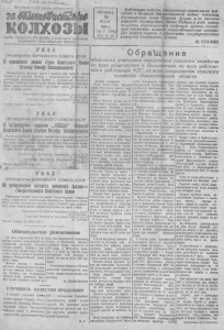 ^ ! ,f)-‘ CiniX)>n [i всех ст ран , со е д и н я й т е с ь ! О р га н С е е е р н о г о Р К В К П ( б ) и р ай сове та д е п у т а т о в т р у д я щ и х с я Новосибирской о б ла с ти П Я Т Н И Ц А 29 ИЮ Н Я 1 9 4 5 г . № 21 ( 7 9 7 ) Цена 15 г о п . Блестящие п о б е д ы, одержанны е с о в ет с к им и вой с к а м и в В е л и к о й Оте чественной войне, п о к а за л и б о г ат ы р с к ую м о щ ь ¡красной А р м и и и ее высокое воинское маст ер ст во . Н аш а Р о д и н а в х о д е войны п о л у ч и л а п е р в о к л а с с н ую к а д р о в ую а р м и ю , с п о с о б- н ую отстоять великие социали ст и чески е завоева н и е нашего н а р о д а и [обеспечить гос уд ар ст венны е интересы С о в е т с к о г о С о ю з а . И . С Т А Л И Н . *■ - У К А З П Р Е З И Д И У М А В Е Р Х О В Н О Г О С О В Е Т А С С С Р О присвоении звания Героя Советского[ Союза СтаилнуИосифу Виссарионовичу ; Возглавившему Краевую Армию в т я ж е л ы е дни з а щ и т и нашей Г о д я вы и ее с т о л и ц ы Москвы, с и с к л ю ч и т е л ь н ы м мужеством г решимостью руков од ивш ем у борьбой с г и т л е р о в с к о й Германией. М арш алу Со ве тского Союза С т а л и н у И о с иф у Писсарионоиичу/присвоить йоаипс ] ероя Советс кого Союза с вручением ордена . Л е н и в а и меда л и < 3 ы о т а я звезда -» . П р е д с е д а т е л ь П р е з и д и ум а В е р х о в н о г о С о в е та СССР М. К А Л И Н И Н . С е к р е т а р ь Президиума В е р х о в н о г о Сената С С С Р А . " Г О Р К И Н . 1 1о<жда, К р е м л ь , 2(> июня 1945 г . У К А З П Р Е З И Д И У М А В Е Р Х О В Н О Г О С О В Е Т А С С С Р О наргаждения орденом »ПОБЕДА" Маршала Советского Союза Сталина Иосифа Виссарионовича За и ек лю ч ¡ т е л ь п ы е з а с л у г и в о р г а н и з а ц и и всех в о о р у ж е н н ы х сил С о ве тс к ою Союза и умелое р у к ов од с т во ими в Великой О те ч ес тв ен ной войне, 31 ко н чи вш е йся полной победой н а д г и т л е р о в с к о й Герма и д е й , н а г р а д и т ь орденом « П О Б Е Д А » Маршала Советс кого Союз.» С т а й н а Иосифа В ле са р з о п о в н ч а . П р е д с е д а т е л ь Президиума В е р х о в н о г о Со в е та С С С Р _ М . 1 С А Л И Н И Н . С е к р е т а р ь Президиума В е р х о в н о г о С о н е та С С С Р м „ А1: Г О Р К И Н . Москва , К р е м л ь . 2ь нюня 1945 г. .-Ч! У К А З П Р Е З И Д И У М А В Е Р Х О В Н О Г О С О В Е Т А С С С Р Об установлении высшего воинского звания— Генералиссимуса Совесткого Союза О с т а н о в и т ь высшее воинское зиа ои е Г е н е р а л и с с и м у с С о в е тс к о й С ою за , п е р с о н а л ь н о присваиваемое П р езиди ум ом В ерховною Совета С С С 1 за особо выдающиеся з а с л у г и иерод Ро д иной в деле р у к о в о д с т н а всеми во ор уж е нны м и силами г о с у д а р с т в а во время в о й н ы . П р е д с е д а т е л ь П р е з и д и ум а В е р х о в н о г о С о в е т а С С С Р „ М . К А Л И Н И Н . С е к р е т а р ь П р е з и д и у м а В е р х о в н о г о С о в е та С С С Р М о с к в а , К р е м л ь . 26 июня 1915 г . А ' 10 Р К И И Обязательство 28 1ювя в Т а р т а с с к о й М Т С сос т о я л с я м и т и н г , п о с в ящ е ш ш й н а г р а ж д е н и ю то в а р и щ а С т а л и н а в т о р ы м орденом « П о б е д а » ! пр и сво е п а ю ем у з в а н и я Героя Советского Союза и в ы сш е го воинского з в а н и я — Г е н е р а л и с с и м у с а Советс к о г о Союза. М и т и н г п р о ш е л с большим подьсмом. В ы с т у п а ю щ и е в ы р а ж а л и свою в е л и к у ю любовь т о в а р и щ у С т а л и н у ! под руководством ко торого наша доблес тна я Красна я А р м и я одержала, п о л н у ю поремонтников беду н а д ги тле р ов ск ой Г е р м а н и е й , 1окарь т . Б о льш аков обязался в ы п о л н и т ь но рму вы р а б о т к и на 200 п р о ц . , т . М и тр а к о в а обяза л а сь к 5 июля