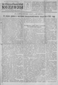 П р о л е т а р и и всех ст ран , соеди н яйт ес ь ! колхозы Орган Северного РК ВКП(б) и райсовета депутатов трудящихся Новосибирской области ПОНЕДЕЛЬНИК 23 ИЮЛЯ 1 9 4 5 г . № 2 5 - 2 6 Щ н а 15 г о п . Сейчас нет б о л е е важной х о зяй ст венн о п о л и т и ческой за д ач и д л я вс е х партийны х, советских , з а г о т о в и т е л ь н ы х органи заций , д л я с е л ь с к и х к о м м унистов, ком с ом о л ьц е в , к о л х о з н и к о в , к о л х о зн и ц , р а б о т н и к о в МТС и с о в х о з о в и специалистов сельс к о г о х о з я й ст в а , к а к своеврем енная и тщ ат ел ь н ая п о д г о т о в к а и проведение у б о р к и у р о ж а я без п от ер ь , выполнение к аж д ы м р а й о н о м , к о л х о з о м и с о в х о з о м с вои х о б я з а т е л ь ст в по сдач е с е л ь с к о х о з я й с т в е н н ы х п р о д у к т о в го с у д а р ст в у . В СОВ Н А Р К О М Е СССР и Ц К ВКП(б) Об уборке урожая я заготовках сельскохозяйственных продуктов в 1945 году г р ■* у Сопит Н а р к д ч и х КомпссарЭйС)- юза СС Р р Ц е а т р а л ь о ы й Коми- д ^ . т е т В К Щ б ) о т м е ч а ю т , ч т о в не риод О т е ч е с т в 'п и он в о й н ы , б л а - ^ годара заботам ко л хо зно го к р е с ть - 3 ^ а и с т е » , Красная Армия не идам - т 5* т ы вала недос татк а в продозоль- с т в а и . К о л х о з ы и совхозы снаб ж а л и р а б о ч и х н в г е л л я г е в ц и ю продовольствием, а п р о м и ш з к н - по р т ь сырьем , о б е с п е ч е н и и пор м а л ь н у % р а б о Т у заводов и фабрик, в з г о г о н к я в ш и х вооружение п снаряжение для ф р он та . Колхозное к р е с т ь я н с т в о а к т и в н о и с по лны м сознанием своего д о л г а перед Роди ной содейств овало Краевой А р м и и в д о с тиж ен ии победы п н д врагом В зсеапии сез в 1915 г о т у проведен более орга низованно и в бо » лее короткие с р о к и , чем в и р о ш - ’ лом г о д у , при л у ч ш е й ка ч е с тв е работ. Г о с у д а р с тв е н н ы й д д г в . я р о ь о г о х е в а колхозами и к р е с т ь я н с к им и хо зяйс твам и выполнен на 100,1 п р о ц е н т а , а по зерио- вым к у л ь т у р а м на 1 0 2 , 8 процен - 1а , по х л о п ч а т н и к у на 100 проц е н то в , но сахарной свекле на 1 0 1 ,0 процен та . Успешное проведение ярового сева и более в ы с о к 1- ■" л л е с т е о ие ^ е а и и х т а р н ы х раоог д а ю т возможность в т е к у щ е м г о д у п овсе местно п о л у ч и т ь х о р о ш и й ур о ж а й , з н а ч и т е л ь н о у в е л и ч и т ь ва лнвые сборы з ерна, х л о п к а , л ь п а , м а с л и ч н ы х к у л ь т у р , сахарной с в е к л ы , к а р т о ф е л я , овощ ей , своевременно и п о лно с тью в ы п о л н и т ь г о с у д а р с т в е н н ы й п л а н заготовок с е л ь с к о х о з я й с т в е н н ы х п р о д у к т о в , з а с ы п а т ь семейные фонды в кол х о з а х , совхозах, к р е с т ь я н с к и х х о з я й с т в а х и п о в ы с и т ь д о х о д и колхозов, ко л хо зни ков и к р е с т ь я н с к и х х о з я й с тв . Совнарком С С С Р и Ц е н т р а л ь ный Коми те т В К Щ б ) обращают впиманне в ’ ех п а р т и й н ы х , с о в е т с к и х , з ем е л ь н ы х , з а г о т о з и т с т ь - ны х о р га н и за ц и й , к о л хо з о в , МТС, совхозов, подсобных х о з я й с т в пром ыш ле нны х п р е д п р и я т и й и к р е с т ь я н с к и х х о з я й с т в , ч т о своевременное проведение уборка у р о ж а я без по терь я безусловное в ы п о л - л и к серьезно запоздали с нодго гонкой к работе т р а к т о р о в , уборочных маш ин в мо лотилок и не обгеаечнли и х по лно го исцоль о- нзни я на уборке у р о ж а я , д о п у с к а й в р е д н у ю о ч ер е д н ос ть при уборке п обмолоте хле бов, ч то приводило к з а т я ж к е обмолота и за го то во к с о л ь с к о х о з я й с т н е п н ы х п р о д у к т о в , к потерям у р о ж а я , а 