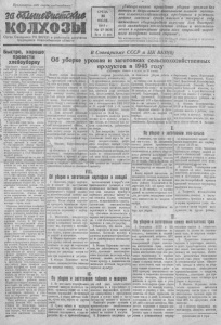 2 З А БОЛ ЬШ ЕВИ СТСКИ Е КОЛХОЗЫ 25 июля 1945 № 27 ( 8 0 3 ) В С о в н а р к о м е С С С Р и Ц К В К П ( б ) О б уборке урожаи и заготовках | сельскохозяйственных продуктов в 1945 году * I Пора быть готовыми к уборке! Что показала проверка тимофеевки, ежи сборной, р е й г р а - сса .л гсо хвоста, о в с я н и ц ы к ра сно й и д р у г и х л у г о п а с т б и щ н ы х « т р а в за 5 центн еров зерновых к у л ь т у р ; б ) 1 ц е н т н е р п р о д а н н ы х с е м я н : п ы р е я а м е р и к а н с к о м , о в с я н и ц ы л у г о в о й п сераделлы за 3 ц е н т н е ра зе р н овы х к у л ь т у р ; в) 1 ц е н т н е р п р о д а н н ы х с ем я н : ии ь и , э с п а р ц е т а , с у д а н с к о й т р а в ы , могара н а ф р и к а н с к о г о проса з а 2 ц е н т н е р а з е р н о в ы х к у л ь т у р ; г ) 1 ц е н тн е р п р о д а н н ы х с е м я н : м н г л я к а лугового, п о левицы белой, к левера шведского и . клево р а белого за 6 центн еров з е р н о - | ы х к у л ь т у р . Колхозы , продающи е г о с у д а р : с т н у с ем ен а клевера, л ю ц е р н ы , ж и т н я к а , тимофеевки, э с п а р ц е т а , и в и к и , после в ы п о л н е н и я п л а н а о б я з а т е л ь н ы х п о с т а в о к з е р н о в ы х ' к у л ь т у р , в о з в р а т а сем с су ды , з а с ы п к и семфондов и у п л а т ы з а р а б о т ы М 1 С , и м е ю т п р а в о п о л у п и т ь с п у н к т о в Заг о т з е р н о с еме н а з е р н о в ы х к у л ь т у р п о у с т а н о в л е н н о м у выаге э к в и в а л е н т у . С е мена з е р н о в ы х к у л ь т у р о т п у с к а ю т с я колхо зам з а н а л и ч н ы й р а с ч е т по з а г о т о в и т е л ь н ы м ц е п а м , с н а ч и с л е н и ем 2 р у б л е н за ц е н т нер в а о к р ы т и о расходов З а г о т зерно. О ся за ть м естные п а р т и й н ы е и советские о р г а н и з а ц и и ш в ро ко р а з ъ я с н и т ь п р а в л е н и я м колхозов, к о л х о з н и к а м и к р е с т ь я н с к и м хо- хо зя йств ам у с т а н о в л е н н ы й н а с т о я щ им пос тановлением порядок поо щ р е н и я за в ы п о л н е н и е н пере выполнение п л а н о в п р о д а ж а сем я н мпо г о л о тп и х и однолетн их т р а в г осударству. 4. У с т а н о в и т ь , что з а ч е т пли в ы д а ча зе рна п р о и з в о д я т с я к о л хо зам и к р е с т ь я н с ки м х о з я й с т в а м за семепа т р а в п р и условия предъявления з а г о то ви те ль ны м о р г а н а м с п р а в к и г ла в н о г о агро нома райзо о з а с ы п к е с ем я н тр а в я семенные фонды к размерах , о б е с п е ч и в а ю щ и х потребность кол хоза и л а к р е с т ь я н с ко г о хо зяйс тва в семенах т р а в н а п с с е з . 5 . В ц е лях большой заи н тере со в а н п о стя комбайнеров в п р о в е дении работ по уборке и обмоло т у семенников т р а в , з а с ч и т ы в а т ь к омбайнерам , ори н а ч ислении н а ту р а ль н о й премии зерном за у б р а н н у ю п л о щ а д ь зе р н овы х к у л ь т у р , к а ж д ы й у б р а н н ы й г е к т а р с ем е н н и ко в т р а в за 3 г е к т а р а зе р н о в ы х к у л ь т у р . Д о бр о к а ч е с тв е н ны й ре доит комбайнов имеет первостепенное з н а ч е н и е в деле быстрого проведения уборки у р о ж а я . Однако в Северной м аш и н н о - т р а к т о р ь о н с т а н ц и и забыли об этом. Ремонт комбайнов здесь недопу, тнмо зат я н у л и . Н о п л а н у надо отремог- т и р о в а т ь 31 комбайн, и ф а к ть - чессн о тр ем о н ти ро ва н о только 5 . К т о м у же ремовт м аш ин про- ведеп недоброкачествен! о . Н а - д п я х г о с у д а р с т в е н н а комиссия п роизвод ила приемку комбайнов, в ы п у щ е н н ы х из ремонта В о т р е м о н т и р о ва н н ы х 5 комбайн а х о б н а р у ж е н о 2 0 недостатков. И о п р и м е р , в кобмайве До 8 пет сто пора зв е з д о ч к и ведущего вала с о л ом отр ан епор тер а,пр авое ходе воо колесо не отре