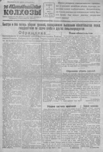 Н р о м п а р и и всех сыгран, соединяйтесь! 2й Щ ы и Ш ш Ш ж , К О ЛХ О ЗЫ Орган С еверно го Р К ВКП(б) и райсовета депутатов трудящихся Новосибирской области Ч Е Т В Е Р Г 2 А В Г У С Т А 1945 г. № 2 8 ( 8 0 4 ) Цола Ц коп. Ш и р о к о развернем социалистическое соревнование за успешное проведение у б о р к и , до срочное выполнение планов хлебо загот о вок . Больш евист ски ми делами ответим на и ст ор и ч е ск ую по беду К р а с ной Армии. Е щ е сильнее у к р е п и м могущество нашей страны! „ Быстро и без потерь уберем урожай, своевременно выполним обязательства перед государством по сдаче хлеба и других сельхозпродуктов Вс О б р а щ е н и е '""“Колхозников и колхозниц сельхозартели ордена Ленина т и и м , е к н о и в И с л ем ьи к ч о а л , х Д о а з б н р и и ка н м ск и ог к о ол р х а о й з о н н и а ц , амВо С р о о в н е е т ж ск ск о о г й о С о о б юла з с а Дорогие товарищи! Великая Отечественная война Советского С гр о о юм з о а м з ф ав а е шр иш с и т л ск а о сь й по Г л е н р ым м ани р и аз и ее безоговорочной капитуляцией. Этой великой победен советский ни Т Мц оыы в ! ар о и бр щ а и ща к е о м л с х я озн к и в к а и м и с кол п х р о и з зывоч: организовать по пример' народ обязан нашей доблестной | с н р о о а юв б а о з нн ч п и о е е х в со з ч а ц е в и с о т а д ьл о и в п с о т и б и е ч д ф е ыс а к б о р з е а ик у с с о п р в е е с шв е - Красной Армии, мудрому вождю и полководцу Генералиссимусу ^|-т С р В и о о в н е с т о у с в р к и о о ч в г у о ы С е С т о а г юл о и д з ын а у И . В о е с л и и ф к у ой Ви О с т с е а - ное проведение уборки урожая и за своевременное выполнение обязательств перед государство.': по поставкам хлеба и других сельскохозяйственных продуктов В этом соревновании мы берем на себя следующие обязательства: 1 . п р о в е с т и косовицу колосо вых к у л ьт у р па всей уборочной п хо л з о е ща со д с и т , ав к л о я т е о т ра 7 я 86 в н ге ашкт е а м ров к , о з л а 14 рабочих дней. 2. Н е допустить потерь зерна В е с ь хлеб , скошенный конными машинами и вручную, с р а з у нее с т в ц я ы за и ть ко в п с н н ы о . пыХ , ле с б л , ож к и о т т ь ор в ый кре н с е будет обмолочен в первые длМ,— заскирдовать. Бережливо на по п д о о л б е чественнэй войны вместе со всем ч ау советским народом без устали трудились в тылу к о л х о з н и к и - мужчины и женщины, старики и подростки, бзсперсбойно снабжая н К ыра п с р н о у дю ов А о р л м ь и ст ю ви и ем н , а а се п л р е о н м и ц е ш с л т е р н а - Ф г’ ность—Сырьем. В жестоких яспы- *' таниях войны с особой полнотой проявились сила и жизненность колхозного строя В памяти детей и ся в с н т у а к л о и в нс н к а а шя их за н б а о в т с а егд п а ар ос т т и а и н * ет и правительства о колхозном, с т р о е i и высокая оценка товарищем Ста- j рать все оставшиеся л иным саыоотлержепаогв т р у д а 1полесья, я и н п ст а в т а рио в тизм г а од с ыовет О с т к е о ч г е о ст к в р ен ес н т о ь й войны. Д о войны мы коллективным трудом всесторонне развили свое о ч б и щли ес к т у в л ен ьт н у о р е ну х юозяй и ст в за о ж , ит о о б ч е н сп у е ю жизнь каждому колхознику. За д св ен ою ор р д а е б н о о т м у н Л а е ш ни к н о а л . хо Т з ри нагр го а д ж а подряд наша артель участвовала н в а ен С н В о с й в е ы с в о с ыо ю к с з и т н м а о в й ке со . с з е н л ан ьс и к е о м хо с з в я о й е с г т о долга перед Родиной трудились в дни войны на помощь фронту с г к т о о в Н л е в х е н р о с н з е м о н м о й и е т к н р а и и я р , т н н е н а л а а и ш ш т . е р й к у о д л н с х о е о л с з т ь и 