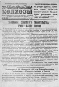 Пролетарии всех стран, соединяйтесь! Ор ган Северного Р К ВКГ1(б) и райсовета депутатов трудящихся Новосибирской области • № 3 0 ( 8 0 6 ) 1 10 августа 1945 г.пятниц^цепа 15 ко п . Самоотверженным трудом на у б орк е урожая, у сил е нием темпов хлебосдачи поможем родной Красной Армии разгромить японских агрессоров! ЗАЯВЛЕНИЕ СОВЕТСКОГО ПРАВИТЕЛЬСТВА ПРАВИТЕЛЬСТВУ ЯПОНИИ 8 августа Народный Комиссар Иностранных Дел С С С Р В . М . М оло тов принял японского посла г-на Сато и сделал ему от имени Советско го Правительства следующее заявление для передачи правительству Японии: „После разгрома и капитуляции гитле- розской Германии Япония оказалась единственной великой державой, которая все еще стоит за продолжение войны. Требование трех держав—■Соединенных ( Штатов Ам ери ки , Великобритании и Китая от 20 июля сего года о безоговорочной капитуляции я п о н с к и х вооруженных сил было отклонено Японией. Тем самым предложение япон ско го правительства Совет ск лу С ою зу о посредничестве в войне на Дальнем Востоке теряет всякую почву. Учитывая о т ка з Японии капитулировать, союзники обратились к Советскому П р а вительству с предложением включиться в войну против японской агрессии и тем самым сократить сроки окончания войны, сократить количество жертв и содействовать скорейшему восстановлению всеобщего мира. Верное своему союзническому долгу, С о ветское Правительство приняло предложение союзников и присоединилось к заявлению союзных держав о т • 2 6 июля сего года. Советское Правительство считает, что т а кая его политика является единственным средством, способным приблизить наступление мира, освободить народы от дальнейших жертв и страданий н дать возможность японскому народу избавиться от тех опасностей и разрушений, которые были пережиты Германией после ее отказа от безоговорочной капитуляции. Ввиду изложенного Советское Правительство заявляет, что с завтрашнего дня, т. е. с 9 августа, Советский Союз будет считать себя в состоянии войны с Японией. 8 августа 1д45 года. В. М . Молотов заявил т а к ж е г -н у Сато, что одновременно с этим советский посол в Т о к и о Я. А, М а л и к передаст японскому правительству настоящее заявление советс к о го правительства. Посол Японии г-н Сато обещал довести до сведения япон ско го правительства заявление Советского Правительства. З а я в л е н и е В. М. Молотова п о с л а м В ели кобрит ан ии, Соединенных Штатов Америки и К и т а я 8 августа В . М . Молотов принял посла Великобритании сэра Арчибальда К . Керра, посла Соединенных Ш т а т о в А м ери ки г-на Гарримана и посла Китая г-на Ф у Вин— Чана и информировал их о состоявшемся решении Советского Правительства объявить с 9 августа состояние войны между Совет ским Союзом и Японией. Послы выразили удовлетворение заявлением Советского Правительства.