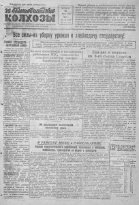 Hpe-MMflpuu всех стран, соединяетесь! О р г а н С е в е р н о г о Р К В К П ( б ) и р а й с о в е т а д е п у т а т о в т р у д я щ и х с я Н о в о с и б и р с к о й о б л а с т и Ч Е Т В Е Р Г 16 А В Г У С Т А 1 9 4 5 г. № 31 ( . & 0 7 ) Це ш 15 r o n . Период у б о р к и и х л е б о з а г о т о в о к в с е г д а бы л с а м ы м сложным в с е л ь с к о м х о зя й ст в е . В эт от пер и о д в один у з е л з а в я з ы в а е т с я целый р я д неот л ож н ы х р а б о т , р еш а ю щ и х с у д ь б у в с е г о с е л ь с к о х о зяй ст венн о го го д а . И искусство р у к о в о д с т в а сельским х о з я й с т в о м состоит не в т ом , чтобы выт ягивать одно д е л о ценой з . б ' , е н и я д р у г о г о , а в том, чтобы обеспечить т а к о е сочетание р а б о т , к о т о р о е даст в о зм ож н о ст ь все и х п ровести х о р о шо и своевременно. (ПРАВДА). . Т - Ш V Все силы-нн уборнуруожая и хлебесдачу государству! ГРАФИК ХПЕБОСДАЧИ-- НЕРУШИМЫЙ ЗАКОН ’ Сегодня к ы п у б л и к у е м обязательства колхозов в а ш е го ранооа зав ерш и ть у бо р ку у р о ж а я к 2 0 сентября,., в ы п о л н и г ь плап злебо з а го тов о к ' к ' 1 0 остя(?ря, к Дню Сталинской К о н с т и т у ц и и — к 5 декабря ш п о л и и т ь обязательства пс^ед государством по сдаче мя с а , молока, ш е рс ти , в с р о к про вести сев озимых, не позднее 10 о ктя 6 ] )я в с п а х а т ь 5 0 0 0 г е к т а ров зяби. Наш район вызвал па соревнование все районы Бара ‘ бинской степи. щШрипяты серьезные а о тв ет- с*<»нные обязательства. Мы должны во ч т о б ы то не Стало сдержать снос слово. Нто я в л я ется делом чести к а ж д о го колхоза, сельсовета, всех работников сельского хо зя йств а р а й о н а , всей п артийной о р г а н и з а ц и и . . Передовые колхозы - п о - б о т е м у борются за в ы п о л н ен и е э т и х обя зательств. В ы п о л н и л и план хлебосдачи за п е р в у ю по л ови ну а в г у с т а колхозы им . Карла .Марк’: г а , . и м . Д е м1я я а Бедного, «Красногв ардеец», им. Ворошилова, «Борьба», « П а р и ж с к а я К о м м у н а » , » Красная з а р я » , «Общий т р у д » , «Красный ф ак ел » , «Новый, с и б и - р н р и др. Однако есть и т а к и е ко лхцзы , к о ю р ы е сорвала г р а ф и к хлебосдачи за первыеV'-три пятядневха а в г у с т а . Срывают в ы т л н е п и о ш и н а хлебосдачи г о сударс тву колхозы О с з д н и н с к о ю . Больше К у л и к о в с к о г о сельсоветов. Черепашьими темпами сдают хлеб колхозы М .'до-Кардга евско го сельсовета. Руководители- колхозов Ч е ба конс кого се.п.совета во главе с председателем сельсовета т . ‘ Клинцовым в ы я с к - я ш о т ьсе- г-ощыжные о б ъ е кти в ны е п р и чи ны для задержка хлебосдачи, сам т . Клинцов п о к о р с т в у е т срывщ и к а м хлебосдачи. Такое положение терпимо быть не может. Граф) ж хлебосдачи— нерушимый з а к он . Урожай созрел хороший . К а ж д ы й ко лхоз имеот во зможность в срок выполнить п л а ц хлебосдачи. Надо т е З ж о умело орга низова ть тру д , помнить, что .выиолпепае плана х л е б о с д а ч и - п е р в а я заповедь ц все силы и средства должны быть направлены па его в'ыдолцевпе, Одновременно П1до усилить тем пы убо р ки хлеба, организо вать бесперебойный обмолот, в с р о г вы полнить сев о зи м ы х . А между тем в ряде колхозов не сочетают л е тн и е нолевые работ ы , в ы т я г и в а ю т одпо дело ценой вабвения д р у г о г о . Н ас т упили самые решающие дьа уборки и хлебосдачи. Сейч а с дорог к а ж д ы й день и час. Надо о р г а н и зо в а ть бесперебойную работу па у бо р ке , в ы в о з к е хлеба го сударству, сове о з и м ы ! . О б р а з ц о в ы м п р о в е д е н и е м у б о р к и у р о ж а я , д о с р о ч н ы м вы п о л н е н