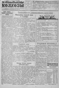 1 иК/*'%л/ иисиинл и 7/7есь ! заШ тШ ЫШ ие КОЛХОЗЫ О р г а н С е в е р н о г о Р Л ВКГ1(б) и р а й с о в е т а д е п у т а т о в т р у д я щ и х с я Н о в о с и б и р с к о й о б л а с т и Ч Е Т В Е Р Г 18 О К Т Я Б Р Я 1945 г. № 4 0 ( 8 1 6 ) Цата 15 сои. О б избирательных о к р у г а х по выборам в С о в е т С о ю з а и в С о в е т Национальностей ригельных округов по выборам в Со- неткСоюза ■ 631 щбир'атслшый т р е у й г . по выборам в Сойот национально о с к (ТАСС). На основании статей 84 и 35 Кон ституции СССР ■ статен 2 4 , 25, 26 «Положения о выборах в Верхов м ны а й Ве С р о х в о е в т но С го ССР С » овет У а каз С о С м СР Пре от зиди 1 у 6 октября с. г образовано 656 избиВЫШЕ УРОВЕНЬ МАССОВО-ГОЛИТИЧЕСНОЙ РАБОТЫ Приближается 28-я л н и а ст В и е ч л е и с к к о о й й Оре к в т о я л б юрь ц с и к и о . й г П о а д с ш о о в ц щи н и а а р н о у дю в д с а т т р у еч н а о е в т ым э и ту про зн н а зв м о е д н с а т т в е е л н ь - з « о и в м и н у а с ш п е е г х о ам и р . ай С о в н ыа ш з е а 3 в 0 ер к шо л и х л о и л г г г и о и и д м е с о ь в с п е о с о л й с г ь т о х п а с о в л у з к а д а н а а р м р т с е х с т л е л в и л е о ь б м у х о ж о с п з д е о п а р ч в р о и с а е д , с м у сч к ми т д о т р н а в о у . Труженики колхозной деревни стремятся к 7 ноября полностью з п а о в л е н р и шть ить в хл се ебоз о а б го я т з а о т в е к л и ь , ст в в ыа , с п п т е р вши е нн н о я н т ы ы з й е ав г е о в рд ш с и о т р ь евн се о л в ь а с н к и о и х , о зя у й с В успешном выполнении всех за дач , стоящих перед колхозной д л б е о е ж р те е и . в т н О м е б й а , с э с т о о о г в м р о о - м л п у н о ч л а ш я ит е и ро ч в л е с ь с е к г о п о й ри е н з р а и д а - щельствует практика передо- т х колхозов 6 колхозов из 7 в Ини р л и и бел п и л н а с н ком хл се е л б ь о с з о а в го ет т е ов в о ык . пол В н эт и о з м аци б и ол , ь а ш ги а т я ко з л а л сл ек у т га ива п .к а о р т т о о р р ы га м руководит местный учитель т. л р в К с е оы о у н - в з е п и е ь о т е м с л м а и и и , с н и т т . и м в ем ы В ч е е ю о а п с т у т к и в с с у с ч к я ю е е а х с ю а к г т р и и к а т о с б т а в л о е т е х т н о д о у н р у з ы ыт а с х е , м к н с а г е о а а с л т з с с е о ь о е ты, боевые листки, оформляют доск и показателей учета соцсоЕТ П р е д о к т я б р ь с к о с со циа ли стич е ско й соревнование В ы п о л н и т ь годовой план к 7 ноября Приближается 28 я годовщипа ч О а к е т т яб э р т я у . Со зн ве а т м с е к н и а й тел п ь а н ро ую д вст д р а е т у т х я и а о м ть ы и. м в и е М л ы п и р к о у т и ю а з к в ж од г е о ст д в о р е в е н щ ш н и а ы н л м у и и у в п с с е т п р р е е е - выиолненнем своего ственного плана, уду п ч р ш ои е з в в и о е д м качества продукция. Включаясь в предоктябрьское соревнование, мы берем на себя следующие обязательства: 1 Производственный план в в пол с н у и м т м ь е к 21 7 1 н т о ы я с б я р ч я р и уб д л о ей кон в ц ы а года дополнительно выработать продукция па 40 тысяч рублей. з н п и о а т с ь т 2 ь 3 . т п р р П с у о е о д ц б в а е . ы ст с н о и а и т м ь о 1 с 5 ть п п ро ро и п ц з р в о о , д д у и к т ц с е и н л и и ь3. Обучить до конца года 26 чел. Из пих сапожников —5 , шорннкор —2 , пимокатов — 10, плотников — 2 , швейников —7. бу с 4. б П р о а в к е о ст д и елам б и ес , по в щ е ад д н о у п ю ус б к о а р т ь ь Сдерж али слово Включаясь в предоктябрьское социалистическое . соревнование, к в о ет л а хоз б н р и а к л и и о Ч б у я н з а а ш те в л и ь е с к т о в г о о се к льсо15 с о т к в т а ябр п я о п п о о л д н п о и с с т к ь е ю в п н а ест ч и етве с р р т е ы д й военный заем. Свое обязательство о т выполнили с честью, пол- - - - - - - - -