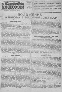 Пролетарии всех стран, соединяйтесь! 2аШт&ияпсШ КОЛХОЗЫ O p f a n С е в е р н о г о Р К В ¡ 4 П ( б ) и р а й с о в е т а д е п у т а т о в т р у д я щ и х с я Н о в о с и б и р с к о й о б л а с т и ЧЕТВЕРГ 2 5 О К Т Я Б Р Я 1 9 4 5 г. № 4 2 - 4 3 Ц е т а / ¡ 5 s o u . С е й ч а с в ажнейшей задачей я в л я е т с я шзнакомле- ние всех и збир ат елей с „П о л о ж е н и е м о вы б о р а х в В е р х о в н ы й Совет С С С Р \ „ П о л о ж е н и е“ долж но стать дост ояни ем к аж д о г о р а б о ч е г о и р а б от н и ц ы, к о л х о з н и к а и к о л х о з н и ц ы , оно д о л ж н о быть известно к а ж д о м у со в ет с ком у ч е л о в е к у. \ л П О Л О Ж Е Н И Е О ВЫБОРАХ В ВЕРХОВНЫЙ С О В Е Т СССР Г л а в а I Ибзирательная система Статья I. На » с л о в а м и ст а т ь и 131 К о н с т и т у ц и и СС С Р ж е ш ц и н и у ч а с т в у ю т в К о н с т и т у ц и и С С С Р вы бо ры д е и у т а т в в в вы борах н м о г у т б ы т ь набранными в ВерВ е р х о в в ы З Совет С С С Р пронаводятс я из бирателями н а основе всеобщего, р а в н о г о и прямого избирате льн ого п р ава при т а й ном голосова нии. статья 2 Н а ос но в а н и и с т а т ь и 135 К о н с т и т у ц и и С С С Р выборы деп у та т о в я в л яю т с я всеобщими. Нее г р аж д а н е С С С Р , х о в н ы й Совет С С С Р па р а в э ы х пр.чвах с м у ж ч и н а м и . Статья 6. На осно вании ст а тьи 13 8 К о н с т и т у ц и и С С С Р г р а ж д а н е , со ст о ящ ее к рядах Красн ой А р м ? и , поль зую тся правом и зби р а ть в бы т ь я8и р а и п и м н в В е р х о в н ы й Совет С С С Р н а р а в н е со всеми г р а ж д о с ти гш ие 1 8 ле т , н е з а в и с и м о от ргссотой д а ш м к . и н а ц и о н а л н о й п р и надлеж нос ти , пола , I статья 7. Н а освоиаивн с т а т ь и 139! вероисповедания , обфазовательпого ц е н з а , ! К о н с т и т у ц и и С С С Р выборы депутатов яв- оседло сти, с о ц и а л ь н о г о п роисхождения , | л а ю т с я п р я м ы м и : избрание депу тат ов в ^ 'б я в с т в е н н о г о положения и прошлой| В е р х о в н ы й Совет С С С Р производится ^ ■ » ^ У к л ь н о с т и , имеют ираво у ч а с т в о в а т ь в г р аж д а н ам и н е ц о с р : ^ .тленно п ут ем п р я - я ы б о р ц д е п у т а т о в в В е р х о в н ы й Со вет | м ы х выборов. С С С Р , за и с к л ю ч е н и е м у м а л и ш е н н ы х и ! статья 8. На осно вании с т а т ь и 1 4 0 ли ц , г с т ж д е н н и1 судом с лишением изби ! К о н с т и т у ц и и СС С Р голо сова ние при вы р а т е л ь н ы х п р а в . статья 3 Д е п у т а т о м Верховного Со вета С С С Р м о ж е т б ы т ь избран к аж д ы й гражданин С С С Р , до с т и гш ий 23 дет , пе- завясимо от рассовой и « ш т о п а л ь н о й п р и н а д ле ж н о ст и , пола, ве роисповедания , о б разовате льн ого ц е нза , оседлости, со циального п р о и с х о ж д е н и я , и м ущ е ст в ен н о г о пол о ж е н и я и прошлой д е я т е л ь н о с т и . * статья 4. На ос но вап и и с т а т ь и 13 6 К о н с т и т у ц и и С С С Р выборы деп у та т о в я в л я ю т с я р а в н ы м и : к а ж д ы й г р а ж д а н и н и м о е т один г о л о с ; все г р аж д а н е у ч а с т в у ют в В ы б о р а х в В е р х о в н ы й Сонет С С С Р на р а в н ы х о с но ван и ях , статья 5 Н а «сновании ст а т ь и 137 Статья 21 Заявления о неправильнос т и з с п и с к е избирателей (н е в к л ю ч е н и е в сп и со к , и с к л ю ч е н и е из с п и с к а , к с к а ж е ние фамилии, и мен и , о т ч е с т в а , н е п р а вильное включение в списо к лиц, лиш ен н и х и зб и р а т е л ь н ы х прав ) подаются в ис п о л н и те л ь л ип к о м и т е т Со г о т а д е п у т а т о в т р у д я щ и х с я , о п у б л и к о в а в ш и й с п и с к и , ко т о р ы й о б я з а н не позднее чем в 3-двев пый сро к, рассмотреть каждое заявление о н еп р а в и л ь н о с т и и с п и с к е избирателей. статья 22 Но 