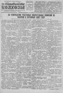 Дрб-7ешорни всех стран, соединяйтесь! тШтеХшШие К Г Ш Ж Л А О р гаь С е в е р н о г о Р К - В К П ( б ) и райсо ве та депутатов трудящихся Н ов осибирской области П О Н Е Д Е Л Ь Н И К 17 ДЕКАБРЯ 1945 г. № 51 (827) Ц е н а 11 к о а . Наш н а р о д прид ет к и з б и р а т е л ь н ы м у р н а м с нак о п л ен ны м з а эти г о д ы о г р о м н ы м политическим опыт ом , м н о г о п е р е д у м а в о с у д ь б а х своей Р е д и н ы, о с о б ы т и я х в Европе и в о всем мире. Б о л ь шевистская п а р т и я вм ест е с ш и рокими к р у г а м и беспартийного с о в е т с к о го а к т и в а гот о вит с я к эт им вы б о р а м , видя в них важнейшее п роя вл ени е советской д е м о к р а т и и и еще о д н о м о г у ч е е с р е д- ство сплочения наш его н а р о д а и д ал ьн ейш е го у к репления с о в е т с к о г о г о с у д а р ст в а . Б. М МОЛОТОВ. ОБ УВТ ЕРДЖЕНИУИЧАСТКОВЫХ ИЗБИРАТЕЛЬНЫХ КОМИСИЙ ПО ВЫБОРАМ В ВЕРХОВНЫЙ СОВТЕ ССР Решение испо На ос но ван и я ст . ст . 5 1 , 5 2 «П о лож е н и я о выборах в В е р х о в т ш й Сов ет С ССР » исп о л ни т ел ь ны й к о м и т е т Северного район ного С о ( е г а д е и у т а т о в т р у д а щ и х с я Р Е III И Л : У т в е р д и т ь у ч а с т к о в ы е избирательны е е о м и с си п общее Для выборов в Со вет Союза (Т а т а р с к и й избирательный о к р у г Л® 2 2 3 ) в Совет Н аци он зл ьи ос тей (Новосибирско- А л т а й с к и й и з б и р а т е л ь н ы й о к р у г Л5 2 3 ) в со т а в е с л е д у ю щ и х п р едставителей о бщ е ств еннны х о р г а н а з а ц и й в обществ т р у д я щ и х с я . По С е в е р н о м у избирательному у ч а ст ку .М 2 5 3 . ( Ц е н т р с. Северное ). Председат ель учас тковой избирательной -¡«миссии Ш а к и н к о М и х а и л И в а н о в и ч — о* профсоюзной орган и за ци и Северной средней ш к о л ы . З а м е с т и т е л ь председат еля учас тковой и з б и р а т е л ь н о й ком ис си и Можарин М а т вей Д а н и л о в и ч— от первачвой о р г а н и з а ц и и Всесоюзной к о м м у н и с т и ч е с к о й п а р т и и (б ольш евиков ) Р О Н К В Д . С е кр е т а р ь участковой и збирательной комиссии У с а т о в а А н а с т а с и я П е т р о в н а — о т первичной о р г а н и за ци и Всесоюзного ле н ин с ко г о к о м м у н и с т и ч е с к о г о соеоз» ыо лодежн Северной средней школы . Ч ле пы у ч а с тк о в о й изби р ате л ьн о ! к о м и с сии: М ат в е е в Е в г е н и й М а т в е е в и ч — от колхозников колхоза «Советская С и б и р ь » ; Большаков Аиф М и х а й л о в и ч - о т ра б о ч и х 'Га р т а сс ко й МТС; А н д р о со в а А н т * в и н а П р о к о п ь е в н а— от колхозников к о л х о за им. Т е л ь м а н а ; Кулеш о ва М а р к и Гр и г о р ь е в н а — ог колхозников колхоза «18 -й п а р т , с ъ е з д » ; М ае в ск ая Г а л и н а М и хай ло вн а — от первичной о р г а н и за ц и и Всесоюзной ком муни с ти че ской п а р ти и (б ольшеви ко в) Северной средней ш к о л ы ; Ю р ь е в а Ел и за вет а Л а в р е н т ь е в н а — от первичной о р г а н и з а ц и и Всесоюзног о л е нинского к о м м у н и с т и ч е с к о г о союза молодежи с у д а и п р о к у р а т у р ы . По С е в е р н о К а б а т о в с к о м у избирательному у ч а с у у № 254. ( Ц е н т р д. Еабатота). Председатель участковой- избирательной комиссии Нилова Але ксандра П етровна — от к о л х о зни к о в колхоза « 1 7 - й п а р т с ъ о з д » . З а м е с т и т е л ь председателя у ч а с т к о в о й избира ельвой к о м и с с и и — Л о б а ш е в Д а ниил Н и к и т и ч — от колхозников к о л х о зе « 1 7 - й п а р т с ъ е з д » . С е к р е т а р ь у ч а с т к о в о й избирательной комиссии Ш е в ч е н к о Е к а т е р и н а Пианов н а — от колхозвиков колхоза «17-й п а р т съезд». Ч л е н ы у ч а с тк о в о й избирательной ко 