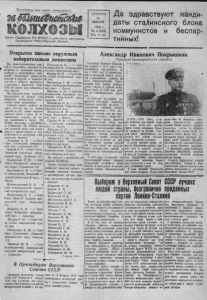 П р ол ет а р и и веех стран, соединяйтесь! за Ш ш ^ т с н Ы КОЛХОЗЫ О р г а н С е в е р н о г о Р К В К П ( б ) и р а й с о в е т а депутатов т р у д я щ и х с я Н о в о с и б и р с к о й о б л а с т и СУББОТА 1 2 ЯНВАРЯ 1 9 4 6 г . № 4 ( 8 3 3 ) Цела 15 к о л . Д а здравствую т кандидаты сталинского блока коммунистов и беспартийных! Открытое письмо окружным избирательным комиссиям Мы, нижеподписавш и е ся , к а ж дый в отдельности , полупили т е л е граммы от различных заводов, колхозом и предвыборных сове щ анин избирателей различных областей и о к р у г о в о выдвижен и и нас в качестве канди да тов к д е п у та т ы в Верховный Совет СССР по целому ряд у избирательн ы х о к р у г о в . Мы п р и н о с и м свою г л у б о к у ю благодарность за доверие есем товарищам и зби ра телям , в ы с т а вивш и « н а ш и к анди да туры . С ч и та е м , однако, н у ж н ы м за я в и т ь , что т а к , к а к по за кон у к а ж д ы й из пас может баллотироваться только в одвом ез из бирательяых о к р у г о в , то мы, к а к к о м м у н и с т ы н члены Ц К В К П { 6 ) обратились в Ц К ВК1Ц6) за у к а з а н и я м и . Ц К В К П ( б ) дал вам у к а з а я в и с н я т ь свои к а н д и датуры с д р у г и х о к р у г о в и б а л лотироваться в сл едующих избир а т е л ь н ы х о к р у г а х : А н д р е е в А . А — в Совет Союза, А н ш б а д с к и н избирательный о к р у г , Т у р к м е н с к а я ССР. Б е р и я Л П . —в Совет Союза, Тбилисский - С та л и н с к и й избирате льный о к р у г , Г р у з и н с к а я ССР. Б у д е н н ы й С - М — н Совет Союза, Ш е с е то н с ки й избирательный о к р у г , У к р а и н с к а я ССР. Б у л г а н и н Н. А. — н Совет На т о н а л ь н о с т е й , Московский го родской избирательный о к р у г , г . Москва. В о з н е с е н с к и й Н . А . — в Совет Н ациональностей , Гор ь ков с к и й и збиратель ны й о к р у г . В о р о ш и л о в К . Е . — в Совет Союза, М и н с к и й городской избирательный о к р у г , Б е л о р у с с и я ССР. Ж д а н о в А . А . — в Совет Союза. Володарский избирательный о к р у г , г . Лени н град . Ж у к о в Г. К . — в Совет Сою' за, особый избирательный о к р у г Л ! 6 6 0 . К а г а н о в и ч Л . М . — в Совет Союза, Т а ш к е н т с к и й - Л е н и н с к и й избирательный о к р у г , Узбекская ССР. К а л и н и н М. И — в Совет П ациовальяостсй, Л ен и н гр а д с к и й г о р о д с к о й и зби р а т е л ь ны й о к р у г г . Л е н и н г р а д . К о с ы г и н А Н . — в Совет Национальностей, Л е н и н г р а д с к и й сельский изби ратель ны й о к р у г . К о н е в И . С . в Сокет Союза, особый избирательный о к р у г К 6 6 5 . М а л е н н о а Г. М. — в Совет Союза, Л е ни н град с ки й избиратель пын о к р у г , г . Москва. М и к о я н А . И . —в Совет На циональностей, Ереванский - С тал и н с к и й избирательный о к р у г , А р м я н с к а я ССР. М и х а й л о в Н . А . — в Совет Национальностей, Ставропольским избирательный о к р у г . М о л о т о в В М — в Совет Союза, Молотовекий и зб и ра тель ный о к р у г , г . Москва. С т а л и н И В — в Совет Союза, С та л и н с к и й н ( б и р а т е л ы ш й о к р у г , г . Москва. Х р у щ е в Н С — в Совет Союза, К и е в с к и й Л е н и н с к и й и;;би рл тельный о к р у г , г К и е в . Ш в е р н и к И М. — в Сокет Национальностей, Свердловский и збиратель ный о к р у г . Ш к и р я т о в М. Ф —в Совет Национальностей, Т у л ь с к о - Р я з а н с к и й изби ратель ны й о к р у г . Мы пр и н т а с исполнению эти указания ЦК 81x11(6). Просим соответств ующие и з б и рател ьны е комиссии п р и н я т ь к сведению настоящее за явление , и рассматривать его х а к д о к у мент п ри р е ги с трац ии кандидатов в д е п у т а т ы . А н д р е е в А . А. Б е р и 