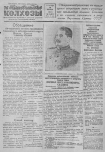 Ы р0, ш п а / т и веет ст р а н , СФе»инлйте§ь\ О р га н С е в е р н о г о Р К В К П ( б ) и райсовета д е п у т а т е в трудящихся Новосибирской области Обращение 130-тысячного митинга трудящихся Сталин ского избирательного округа М о с к в а , Кремль т о в а р и щ у Ст а л и н у ДорогоП Иосиф Пяссарияноивч! С чу вс т во м безграничной радости у з н а л и сегодпй т р у д я щ и е ся С та л ин с ко г о изб ирател ьного о к р у г а о В чш е м согласии баллотироваться по избирательному о к р у г у М о с квы , к о то р ы й иосиг Ваша славпое имя. В е л и к а ч е с ть ,н еизм е рим о п а ше счастье голосовать за Вас, то варищ С та л и н , — всенародного к а н д и д а т а в д е п у та т ы Верховво- т о Совета С ою1а С о в е т с к и х Соци а л и с т и ч е с ки х Р е с п у б л и к . Вместе с великим Л е п и н ы м Вы создали большевистскую п а р т и ю , Советское государство. Под Вашим водительством т р у д я щ и е ся нашей Родили построили социализм. Вод Вашим м у дрим р у ководством большевистская п а р т и я сплотила народы нашей о т чизны в единую н е р у ш и м у ю братс к у ю семью. 5 Й . то варищ Стадия, п р и в а - ' ^ н наш народ К вез икон победе над не мед к о - ф ш «стеке « в зах - в а т ч п к а и п ж японскими империалистами. В ы , родной Иосиф Виссарионе" в и ч , уч или и у ч и т е сов е тски й народ по-лепинсь-и, беззаветно любить п а ш у Р од и ну , не устанно у к р е п л я т ь ее могущество, самоо т верж енно з ащищат ь завоевания Всдикой О к тя бр ь ско й соци алисти ческой революции. I Пас, то варищ Сталин , у ч а т ся советские люди бороться за интересы социалисте ческой Родины и побеждат ь; у ч а т с я сохран я т ь твердость д у х а в м и н у ты г розной о п а с но с т и , не поддаваться благодушию , беспечности при самых больших победах. В ы , т о в а р и щ Сталин} — у м , с о весть , честь советского народа. В ы — п а ш а гордог ть и падежда. Голосуя за Вас, тоЕарцщ Ста-, л и н , мы голосуем за славную большевистскую п а р т и ю — вдохновителя и ор гани за тора всех н а ш и х побед. е Голосуя за Вас, то варищ Стал и н , мы голосуем за паше мудрое Советское пр авительство Голосуя за Вас, т о в а р и щ Стал и н , мы голосуем за дальнейшие у к р е п л е н и я м о г ущ е с т в а нашей Советской держ авы , за дальне йш е е ра з ви ти е народного хозяйства и к у л ь т у р ы пашей с т р а н ы , 31 зпачьтельвое повышение ж и з н е н н о г о уров ня сове тско го народа. С радостным волнением т р у - дящ- еС! Ста линского избирательного округа ж д у т то рж е с т вен но го дая 10 ф ¡враля Ш 6 года, ьогда мы вез, к а к один, я в и м с я п а выборы и единодушно отдадим Своп голоса Вам, первому кандидату блока к о м м у н и с т о к о бес и а р т и й а ы х . М ы к л я н е м с я Вам , то варищ С та л ия , тр у д и т ь с я в е покладая р у к , образцово выполнять все зад а н и я большевистской п а р т и и и Советского правительства , неуст а н н о по выш а т ь - производительно с ть т р у д а и к у л ь т у р у произ водств а. , I М и еще шире развернем соци алистич е ское соревнование в ■¡есть выборов в Верховный Совет Союза Советских С оциалистичес к а х Республик , во славу вашей м о г у чей Родины! Лод знаменем па р той Л е н п п а - Ста лвна мы создали и от стояли в боях с оци алистич е ски й Стр ой— основу всех наших побед. Под знаменем п а р ти и Л е н и н а - Сталина мы идем вперед, к ком м у н и з м у ! До здравствует Советский Союз на д еж ны й оплот счастья и славы пародов пашен Р о д и н ы ! Да з д равс т ву е т н а ш е родное Советское правительство! Да зд