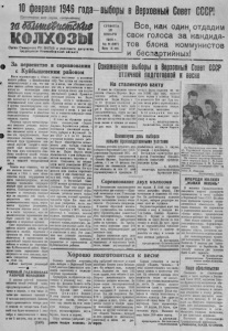 10 февраля 1946 года-выборы в Верховный Совет СССР! стран, соединяйтесь! т Ш ш Ш т Ш к е К О Л Х О З Ы 0 ^ Г » Н С е в е р н о г о Р К ВКП(б) и р а й с о в е т а двпутатав трудящихся Н о в а в и би р с к а й аблаати С У Б Б О Т А 2 0 ЯНВАРЯ 1 9 4 6 г . № 8 ( 8 3 7 ) Ч ш 1 Í К * И . З а первенство в соревновании с К у й бы ш е в ск и м районом К т о ! i соревнования в 1945 г . период п о д г о т о вк а к весеннему ■ашего райоаа с М в х а й ю в с к и г с еву . Чем л у ч ш е мы по д готивям - с в и д е т е л ь с т в у ю т о том, ч т о к о д - си к в ес н е , тем у б п е ш и е прове ховы вашего районе « д е л а л а ш а г дем сев, а с л е д о в м м ь в о в вило - вперед по вып олнен ию с в о и ж им пр о ч ную основу д ц п о л у ч е - еблвателкств перед го с уд а р с т вом , яи я высокого у р о ж а я . П р в в и л ь ш - Свыше 40 колхозов н а ш е г о р а й - п о с т у п а ю т ко лхозы им. К а рл ь еяа в ы п о л н и л и в п е р евы по лни ли Маркса, « Н у т а к с о ц й л в л н у » у с та н о в ле н ны м п л а н сдачи хлеба ( К р а с н а я звезда» я им<Ч'»е д р у - ■ Д р у г и х с е л ь х о з п р о д у к т о в г о с у r í e , которые н е о тклады в аю д в р с т в у . Б в а з и н с к и й сельсовет п о д г о т о в к у в весвв, а у ж е с е ! завоевал первенство в областном час в основном вавершвют гетев с в ц в и в с т и ч е с к о м соревновании ность к сену , с е л ь « i s советов. ¡ 1Í о г в е г яа обращение к о н и Упорным тр у д о м ч л е н ы передо- ненов с е л ы о з а р т е л и ( П а м я т ь •ых ко лхозо в добились п о л у ч е - К и р о в а » , Бар&бивского p a l o i a о н и высокого у р е ж а я , у в е л и ч е - проведении с та ли н с к о й « м т н » имя поголевья с к о т а ■ повыше ч е с т ь выберов в В е р х о в н ы ! Се и з а его п р о д у к т и в н о с т и . О п ы т « е т С С С Р c l по Ю февраль ............................... передовые к о л х о з ы нашего рано на б е р у т о бя за т ел ь с т ва ознаме н овать ден ь выборов о т л и ч и о й п о д г о т о в к е ! к ееенв. Ч л е я ы кел хоза им. Ка рла Маркса в з я л п е р е д о вы х колхозов, самоотверж е н н ы й т р у д т р у ж е н и к о в к о л - х м н о й деревни » о в о р и т о пеодо- i i H o l e i a « колхозн ого с тр о я . Э т а с*ла д а л а возможность с ел ь „ --- - иа|)анд В З Я Л ( T to u y х о з я й с т в у нашей с тр аны обяза тел ьство к д а » >иберев п о л - Все, как один отдадим свои голоса за кандидатов блока коммунистов и беспартийных! ■■■■!■■■■■I■■ ■■ п г т из— — на» Ознаменуем выборы в Верховный Совет ССР отличной подготовкой к весне На с т а л и н с к у ю в а х т у В о т и т и обращение членов колхоза « П а м я т ь К и р о в а » , Кара- 1инеко го района, колхозн ики колхоза им К а р л а Маркса с 1 ю 1U ф е в р а л я с т а н о в я т с я на с та л « н е к у ю в а х т у в ч е с т ь выборов в Верховный С о к е т СССР. С е л ь х о з и в е в г а р ь , сбрую ми у ж е п р и г о т о в и л , с е м е й о ч и с т и л» . За втв дни мы вылезем на поля 300 воюя и » ш » я 20 д а т . звлы. собирай не новее Па ж и в о тн о во д ч е с к у ю ферму подвезем ие менее 3 .0 0 0 д з т . сева, в ы ? « '’ ' ’ » бронь кормов к полевым ста вам в к о л в честив 300 ц н г . П р и кол юзе н а ч а л рабвту а г р о т е х к р у д о а , в котором с аиим анпся п а х а р я , борониколокв, с е я л ьщ и ки . К Ц ) ф е в р а л я наш к о л хоз п о л ь о с ты о » в е р ш а т визги r o i s y к весне. С . П О Д Р Я Д Ч И К О В , п р е д с е д а т е л ь к о л х о з а мм. Карла Маркса Ознаменуем день выборов новыми производственными успехами уетен гии преодолеть все т р у д н и с - и в тяжелом четырехлетие! вийяе. Одявки вадо о т м е т и т ь , ч т о ие вое к и л ю з ы нашего района в ы - п o n и л я в 1945 г . своя обязат е л ь с т в а перед госуд 