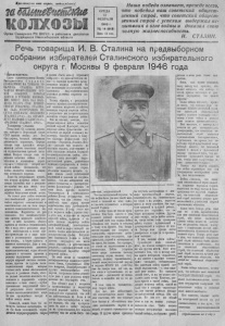 Ж р о л т л р и и s t u c ш » л н , с о е д и н я й т е с ь . Орган С е в е р н о го РК ВКП(б) и райсовета д еп у та тов тр у д ящ и х с я Новосибирской области Н аш а п о б ед а означает , прежде всего, что п об еди л наш советский общественный ст р о й, что советский общественный ст рой с у с п е х о м выдержал ис пытания в огне войны и д оказал свою п о л н ую ж и зне сп о собн ост ь. //. С Т А Л И Н. С Р Е Д А 13 Ф Е В Р А Л Я 1 9 4 6 г . № 14 ( 8 4 3 ) Цена 1» кои. Речь товарища И. В. Сталина на предвыборном собрании избирателей Сталинского избирательного округа г, Москвы 9 февраля 1 9 4 6 года П ред сед ат ел ь : Слово предоставляется Иосифу Виссарионовичу С т а л и н у . ( Й О Я В Л Н Н И Е Н А Т Р И Б У Н Е Т О В А Р И Щ А С Т А Л И Н А В С Т Р Е Ч А Е Т С Я 13 БИ Р А ТК Д ЯМ Н Б У Р НОЙ О В А Ц И Е Й , К О ТОРАЯ ДЛИТСЯ В Т Е Ч Е Н И Е НЕСКОЛЬ К 1 Х М И Н У Т . ВЕСЬ З А Л Б О Л Ь Ш О Г О Т Е А Т Р А СТОЯ П Р И В Е Т С Т В У Е Т Т О В А Р И Щ А С Т А Л И Н А . ИЗ З А Л А Н Е П Р Е Р Ы В Н О НЕ С И С Я В О З Г Л А С Ы ; « В Е Л И К О М У Ст а л и н у .у р а ! » , «д а з д р а в с тв у е т В Е Л И КИЙ С Т А Л И Н У 1 А 1 » , «Р О Д Н О М У С Т А Л И Н У , У Р А ! » . Т о в а р и щ С т а л и н . Товарищи! Со времени последних выборов б Верховный Сонат СССР прошло восемь л е т . Это был период, бога тый событиями решающего х а ра к те р а . Первые четыре года и р о н и и в напряженной работе советских людей по осуществлению третьей п я т и л е т к и . Вторые четыре годи обви н яю т со бы т и я войны с не- л и ц [.им а я японскими агресс о р а м и , — с о б ы т и я второй ма-1 ровой войны. Несомненно, что война я в л я е т с я главным моментом истекшего периода. Было бы неправильно д ум а ть , что вторая мировая война возникла с л у ч а й н о , ила в ре зуль та т е ошибок т е х или и ны х госуд а р с т в е н н ы х дея те л е й , х о т я ошибки безусловно имели место. На самом деле война возникла к а к неизбежный р е з у л ь т а т разв и т ия мировых экономических и п о ли ти че с ки х сил па базе современного монополистического к а п и та л и зм а , Марксисты ве раз з а я в л я л и , ч т о капиталисгичес кая система мирового хозяйс тва т а и т в себе элементы общего кризиса и военных столкновений, что в виду э т о ю развитие мирового капитализма в наше время п ро и с х о д и т не в виде п л а в ного а равномерного продвижения вперед, а через кризисы и военные катастрофы. Дело в том, что неравномерность развития к а п и т а л и с т и ч е с к и х стран обычно приводит с течением времени к резкому нарушению равновесия в н у тр и мировой системы к а п и т а лизма, причем т а г р у н н а к а п и та л и с ти ч е с к и х стр ан , которая сч итает еебя менее обеспеченной сырьем и рынками сбы та , обычно делает п о п ы т к и изменить по л о ж е н и е и переделить «сферы в л и я н и я » в свою пользу — путем применения вооруженной силы. В ре з у л ь та те эт ого возникает раскол капиталистического аира на два враждебных ла гер я и война между ними. П о ж а л у й , можно было бы изб е г н у т ь военные катастрофы, если бы была возможность периодически перераспределять сырье j i рынки сбыта между странами сообразное их экономическим ве сом — в порядке п р и н я т и я согла сопанных мирных решений. Но это невозможно осуществить при нынеш них к апиталистических условиях ра в и тия мирового х о зя йств а . Та к и м образом, в ре зуль та те первого кризиса к а п и т а л и с т ичес кой системы мирового хош й с тв а возникла первая мировая война, в р е з у л ь т а т е же второго кризиса возникла вторая 