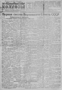 I \ .0 ч • П р о л е т а р и и всех штран, соединяйт есь ] « i Q p r a H С е в е р н о г о Р К В Н П ( б ) и р а й с о в е т а д е п у т а т о в t.r , * Ч ^ т р у д я п ^ ^ П Я Т Н И Ц А 15 М А Р Т А 1 9 4 6 г. № 19 (6 1 8 ) Дева 15 вон. Основные задана нового пятилетнего плана состоят в т о м , , чтобы восстановить пострадав’ шае районы страны, восстановить довоенный ности и сельского хозяйства этот уровень в долее или ме~ азмерах. уровень промышл и затем превзой нее значительных (Из речи товарища И . В.' лей Сталинского избиратель П АЛ И Н Л на предвыборном собрании избирателе) округа г,Москвы 9 февраля 1У46 г.). ервая сессия Верховного Совета С С С Р И нф о рм ац ио нно е сообщ ение о заседании Совета С ою за 12 марта 1946 го д а 12 марта, в 5 часов дня, в Кремле, в Гшаьшом кремлевской дворце, состоялось открытие сессии Совета Союза. По предложению депутата Кузнецова А. А. сессию открывает один из старейших депутатов Совета Союза академик Алек сандр Александрович Байков. После речи депутата Байкова Совет Союза приступил к выборам председатели и заместителей председателя Совета Союза. Председателем Совета Союза единогласно избран депутат Ж д а н о в Андрей Александ рович; заместителями иредсида теля избран депутат Л ы с е н к о Трофим Денисович и депутат Ундасынов Н у р та с Дандыбаввич. Сияет Союза принял следующий регламент заседаний Совета Союза! 1. Заседания сессии Совета Союза происходит с 1 I часов утр* до 3 часов дня и с Б до 10 часов вечера. 2. Докладчики по вопросам поркЩи дни Сессии Совета Оою- за утверждаются председателем' Совета Союза. 3. Каждая гр уппа депутатов Совета Союза, насчитывающая не менее 50 человек, может выставить своего содокладчика. 4. Докладчикам предоставляется для доклада 1 час и для заключительного слова— 39 мн нут, содокладчикам для Сидокла- да— ного 3 с 0 ло м в и а нут, для заключитель —15 минут. 5. Ораторам предоставляется Слово » нервыб раз 20 минут и во второй р а з — 5 минут. 6. Личные заявления и фак тнческне справки вносятся в письменном виде и оглашаются председателем Совета Союза немедленно или в конце заседания, Смотря по их содержанию. 7. Внеочередные запросы вносятся в письменном виде я оглашаются председателем Совета Союза немедленно. 8. Для слова к порядку предоставляется 5 минут. 9. По мотивам голосования предоставляется 3 минуты. Далее Совет Союза принимает следующий регламент: 1. Докладчики по вопросам по рядка совместного заседания Со вета Союза и Совета Национальностей утверждаются председателями той и другой палаты. 2. Каждая груапа депутатов Совета Союза и Совета Национальностей, но считывающая не менее 50 человек может выста- зить своего содокладчика. 3. Докладчикам предоставляется для доклада ] час и для з а к лючительного слова — 30 минут; содокладчикам для содоклада— 30 минут, для заключительного слова— 15 минут. 4. Ораторам предоставляется слово в первый раз 20 минут, во второй раз —5 мавут. 5. Личные заявления и фактические СПр а т и ВНОСЯТСЯ в письменном виде и оглашаются председательствующвм на совмес т н а заседании палат немедленно или в конце Заседания, смотря ни их содержанию. Б. Внеочередные запросы вносятся в письменном виде и о г лашаются нредседательст вующи м немедленно. 7. Для слова к порядку предоставляв юя о минут 3. Но мотивам голосования предоставляется 3 минуты Но поручению Совета старейшин Депутат П о п о в Г Н внес оредложенив о порядке дня с**.е- е