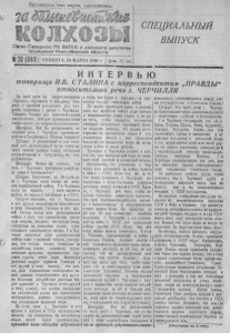 СПЕЦИАЛЬНЫМ ВЫ ПУСК Ч ? ол:€З аР ии 'ессх стран, соединяйтесь! О^ган Северного РК ВКП(б) и райсовета депутатов трудящихся Новосибирской области И Н Т Е Р В Ь Ю товарища И .В . С Т А Л И Н А с корреспондентом „ П Р А В Д Ы “ относительно речи г. Ч Е Р Ч И Л Л Я На днях одян пз корреспондентов л р « и о П с н р о у а в в , д с с ы вя » п з р а о о н с б н ь р ы б а х т о и й л с р с а я з р ъ е к ч я ь с ю н т и о т в г ь а . р Ч и р е щ я р у д чил С в л т о я а п . Товарищ Сталии дал соответствующие разьленевил, которые приводятся пнже в виде ответов на вопрсы корреспондента. Вопрос. н сл у е ю дн н ю м ю в С р о е е ч д ь ин г ен . н К Ч ы а е х к рч Ш и В л т ы л ат я а , р х а п сц р А е о м н и е и з р н в и а е к е се т и н е ? пос н е ы я й т О ь а т к с з е т е м , т е р н . а а сс Я ч р и аз т р д а а о н е р н ц а ы еп й м ав е п а ж а ю ду то ее , г ч о к ю т а о з к б а ы ы о п м п о в а с государствами а затруднить их сот- рудпичестно. В о п р о с Можно ли считать, что л л р у е а чь О г м . и т г р в Ч . а е е р и Ч т ч е . и р б л ч е л и з Б о ь л е п з л а у я с с с т н л о о о п и в с р т т н и и о ч т ? , и еп н д е я а р е . ь т Н у н щ а о с е у р т б п и о д з д е и ции поджигателей войны. Г-н Черчилль е здесь не одинок, — у него имеются друзья но только в Англии,но и в США. Следует отметить, что г. Черчилль и его друзья поразительно паиомисают з в ей э . то Г м ит о л т е н р ош н е а н ч и а и л Г д и е т л л о ера раз и вя е з г ы о ва д н р и у я войны с того, что провозгласил рассо- вую теорию, объявив, чтотолько люди, с г ч т о п а в л в о л л р ь я ящ ю и т н е ач п н и о а л н н а о е н т ц е е м н е н ц д у к е ю о л м о на я ц р з и ы а ю з к в . е я Г , з - ы н в п Ч а р е н е р и д я д во а й я н , ы чт то о ж т е ол с ьк р о ассов н о а й ци т и е , ор го и в и о , р у ящ тв и е е рж н а английском «зыке, являются ш це и н т н ь ым с и удь н б а ы циям в и се , го при м з и ва р н а н . ым Н и ем п е о в ц л е к н р а о я рассовал теорвн привела Гитлера и его друзей к тому выводу, цы, как ция, должн е а ди г н о с с т п в о е д н с н т о вов п а о т л ь но н ц а е д н ч н т а д о я ру н г н и е а м м р и ия н п а р ц и и в я о м ди и т . А г. нг Ч ли ер й ч с и к л ая ля р п ас е со г в о а д л ру т з е е о й к тому выводу, что нации, говорящие на английском языке как единственно полноценные, должны господствовать над остальными нациями мира. По сути дела г. Черчилль и его друзья в Англии и США предъявляют нациям, не говорящим на английском языке, нечто вроде ультиматума; признайте ваше господство добровольно т и ив т н о П о г о м да н с а в л ц с и у е ч и а б е у п д — р е о т л не и в и в з а б л е и п ж о н к р а р я о д в в к ь о е й , — в на т в . ече п н р и о е пяти лет жестокой войны ради свободы д и и н т е о з г а о в , исим ч о т с о т б и ы сь з о а и м х ен с и т т р ь ан, г а осп н о е дс р т а во в н г о и е р т я л в щ е е р р и о о е в ят п н г а о осп а п о н о д г э с л т т и о в м й о с м у к , ом Ч чт е о р я чи з н л и а л ц ю е и й и . и , В н п е о с г л о с с - тавляющие вместе с тем громадп<>е с б я о т л с Т ы я р п а г г п п е и е д т й и в т я о п г н в . ас Ч н е е л о р е в ч н о и и е л я р л а я б м с с и т о р в с о а т . , ои е т е и сог т л о а м , ч м г а о ет Не о э с н т о , о м й н к е а п н к р н о о з с , а т к о ч о й т р о ен и е у л о с ы ч т е й а в н и т о д о в н р к о и а й н и е с г т п . и о в н Ч ы и е . р чилля есть установка на войну, призыв к войве с СССР. Ясно так же и то, что такая установка г . Черчилля совместима с существующим союзны н м е д д п о а у г , т о а в г т о . р ь ом Ч чи е м р т ч а е и т ж е л д л л у я ь Анг д м л л н и я м е о й ю т и д о о 