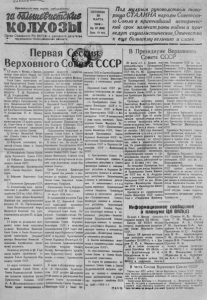 й ч л V П р о с т а j mu tees итран, соединяйтесь! ш Ш т Ш № т М & 4 в ш % ; О р г а н С е в е р н о г о Р К В К П ( в ) и р а й с е в е т а д е п у т а т о в • т р у д я щ и х с я Н о в о с и в и р е к в й в в л а в т и П Я Т Н И Ц А 21 М А Р Т А 19 4« г. № 2 1 (8 5 0) Деза 1» коп. Jm По д мудрым руководством товарища С Т А Л И Н А народы Советского Союза в кратчайший исторический срок залечат раны войны и приведут социалистическое От ечест во к еще большему величию и славе. Ж , ' Х Верховного Со 12 марта в Москве, в Кремле,| развития народного хозннства начала свою работу Первая Сес- СССР на 19-101-950 г.Г сжя Верховного Совета СССР. СССР б д р е а п л С у о т П а в р т ет а ед С А с о е ю д А а з т а е . ле е м ди С н о о в г е ла та сно Союз и а з Ж д а н о в а с д т е и п т у е т л а я ты ми Председателя избрани замеТ . Д . Л ы с е н к о и Н Д. У н д а с ы н о в . г в л е а т с С а н о о ве Н и т а з ц Н б и р а о а ц л н и а о л П ь на р н л е о д ь с с т н е е д о й а с т т е д л е е е й м п е у д т и а С н т о о а В. В. К у з н е ц о в а . ми Председателя избраны де З п а у м та е т с ы тителяЧ А с л а н о в а П. А Л е в и ц кий Н . а своих первых .заседаниях, п н н о р а , о ль и С н с о х о в о е с д т т и е в С й ш о п ю и р х з и а н 1 я 2 в ли м С а о р в т с е а т ле р д а у з Н ю д а щ е ц л и ь и й о порядок дня работы Сессии; с ц ии и 1 о ) нл ( а В С ь ы о н б в о о е р с т ы т а е С й о М ) ю ; а з н а да и тно С й овет К а ом Н и а с мис 2 си ) й Из ( б С р о а в н е и т е а С п ою о з с а тоя ж нн С ы ов х е к т о а Национальностей); диу 3 м ) а У В тв е е р рж хво д н е о н г и о е У С к о а в з е о т в а П С р С е С зи Р > хов 5 н 4 о ) ) го О И б з С р б о а р в з а о ет н ва а и н е С и С е П СР р П ; ез р и а д в и ит у е м ль а с В т е в р а С са С р С 6 о Р ) в — ; И С зб ов р е ан та ие На В р е од рю н в ых ного Ком С и у с д а ССС 7 Р ) ; Назначение ПрокурораСССР; х н о о з в 8 я л ) й ен с П и т я я в т аС и С и л С р е Р а т з п и в а й и 1 т 9 и н 4 я л 6 а - к н 1 а 9 р 5 о 0 в дн о г о с . г г с о . та Совет Союза избрал Мандатную Комиссию под нредседательстноя депутата Н* С . П а т о л и ч е в а . Совет Национальностей избрал Мандатную Комиссию под пред, седательствоы депутата П. А . Ш а - р и я . дан 1 и 4 ях мар па та лат иа б р ы а л з и дле ь з н а ы сл х уш з а а н с ы е доклады Мандатных Комиссий. С н о о в с е т т ей Сою е з д а ин и огл С а о с н н е о т На у ц т и в о е н р а д л и ь л 1 доклады Мандатных Комиссий о признании правильными мочий депутатов. По докладу денутита полно А . ф ки на палаты единогласно вердили Указы Президиума Ве у р т Г о р ховного СоветаСССР. ное 15 за м се а д рт а а ни со е ст С о о я в л е о т с а ь С с о о ю в з м а ест и С н о ое вет з а ас Н ед ац ан ко ие иал з ь ас но л с у т ш ей а . л С о о д в о м к ес ла т д После доклада депутата В о з н е с е н с к о г о председательствующий с л р е о я о н б д н щ к ом а у у е о т, бс В у ч е ж т р о д х е ов н с н и ог ы е л м а д сн о С к о л ов а е д т а у о с м т о ан п п о о я в т к д и о е л л н е ь а т н и ы б е х м уд з ут п ас л е а п д н р а е н о и в и я о х д п и С ри о т в ь н е я с т т ян а и а е С р о з а а ю з за и Сонета Национальностей. Ёерюввый Совет СССР иере- ходит далее К рассмотрению п в в а у ет н н а к ие т Н а П ар 5 р о а д в п и н о т ы р ел я х ь д К с к о т а м в и а сс д а н р С я о С — в СР о С б —С р С а С з Р о о . Председательствующий- огла ш нет а а ет Н з а а р я о вл дн ен ых ие К П о р м е и д с с с е а д р а о т в ел С я С С ь о Р депутата И В С т а л и н а ! «Председателю Совместного за седания СоветаСоюза и Сонета Национальностей Верховного Со вета СССР тов. Ж д а н о в у а А- В связи с тем, что вонрос об образо