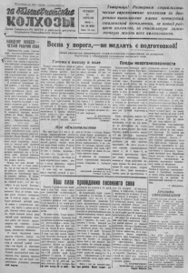 стран, соединяйтесь ?й Щ щеЯистсмЫ КОЛХОЗЫ Орган Се ве р н о г о Р К В К П (б ) и райсовета депутатов трудящихся Новосибирской области Ч Е Т В Е Р Г П А П Р Е Л Я 1 9 4 6 г . № 24 (853) Д ев а 15 к оп . Т ов а р ищ и ! Развернем с о ц и а л и ст и ческое соревнование к о л х о з о в за д о с р о ч н о е выполнение п л а н а четвертой ст али н ск ой пятилетки , за новый р а с цвет к о л х о з о в, за сча ст ли в ую зажит очную жизнь в с е х к о л х о з н и к о в. КАЖДОМУ КОЛХОЗУ— ЧЕТКИЙ РАБОЧИЙ ПИАН И р и С л ж а е т с л самая горячая пора сельскохозяйственного года — яесенипц сев. Перед всеми р а ботниками сельского хозяйства ш « а V в этом году партия и правительство поставила ответственнейшую з ад а ч у— провести первый послевоенный сев первого года новой сталинской п я т и л е т к и ва высо - . ~ ------- „ — КОИ агроте хническом уровне, за- ■ко-лхо^ного крестьянства — проложить тем самым прочную ос- с®*1' этого года быстро я нову высокого урожая 1 9 4 6 года. 10Р°Ш0’ в м о ж и т ь прочную ос- т> - ....... - - - - - — - ' вону высокого у рожая. Все чле В есна у порога,— не медлить с подготовкой! Шире развернем предмайское социалистическое соревнование з а успешную подготовку и образцовое проведение весеннего с ева Г о т о в ы к в ы е з д у в п о л е Первая послевоенная весна на дворе. Через несколько дней н а ч н у т с я полевые работы. Долг В у с н е т пом проведении лю бой работы , а тем более весенн е ю сева, решающее значение имеет организация тр уд а , п л а нирование работы. Можно п р и вести многочисленные примеры из п р а к т и к и работы наших кол* ю зов , е м д е т е д ю т в у ю щ и о том, к а к у ю огромную роль я успешном проведении сельхозработ играет план , организация тр уда. В п е р е ю в а х колхозах н а ш е г о ^ района им. Карла Маркса, « С е - ; ? > дет верная з а р и » , « П у ть к социал и з м у ! , «Красная звезда», «Удар- в и г » в с е г д а уделяется первостепенное значение этому вопросу. Сегодня в нашей г а зе те публикуется план проведения весеяне полевых работ кол х < ш им. Карла Маркса. В ном предусмотрены все работы, у к а заны пормы выработки, онреде лево во сколько дней провести п а х о т у , боронование, сев и т . д. В колхозе « У д а р н и к » предусмотрено закончить сев в 1 5 р а бочих дней. Каждый работник з н а е т , чем он будет заниматься, что должен сделать. Однако т а к дело обстоят не везде. Есть еще и та ки е колхозы, где до с и х иор не составлены рабочие планы, ничего не делаетгя по организации труда на полевых работах. К таким колхозам относятся нм. Калини на «Новый п у т ь » , « 1 7 лет О к тября» и ряд др у ги х . Н е н о н я т - по, чего ж д у т руков-датели эгих колхозов? Ведь до начала полевых работ остались считанные дни. И если на период сева но будет составлен рабочий план, то можно с уверенностью с к а зать, что п ро к а в работе не буд е т . Поэтому сейчас надо добиться , чтобы каждый колхоз имел ч е т к и й план проведения нолевых работ, где следует предусмотреть все «мелочи», уделив особое внимание организации тр уд а , ликвидации обезлички. В своем обращении члены колхоза « Г и г а н т » п и ш у т , что борьба за успешное проведение сеиа и высокий урожай этого г о д а — это борьба за оГфазцовое выполнение всей пя т и л е т к и . Ч е т к и й , продуманный алан проведения сева, к р е п к а я трудовая д и с ц и п л и н а— вот что будет способствовать успешному решению И й з а д а ч . Пледы неорганизованности Недопустимо з а т я н у л и Все ! н и колхоза «Уд