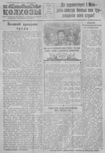 П р о л е т а р и и всех стран, с о е д и н я й т е ^ . КОЛХОЗЫ Орган С е в е р н о го PH В К П (б ) и райсовета д е п у та то в тр у д ящ и х ся Новосибирской области С Р Е Д А 1 МАЯ 1 9 4 6 г . № 27 ( 6 5 6 ) Ц ена 15 к о п . Да здравствует 1Мая— деньсмотра боевых сил трудящихся всех стран! Т Великий праздник т р у д а После 4 - х л е т Отечественной вой н и наш народ снова к обстановке %'ipuoi'o т р у д а п р а з д н у е т сегодня ервое Man — д е н ь м е ж д у народного смотра боевых с и л т р у д я щ и х с я . Е щ е г о д н а з а д в э т о т день небо Европы было в пороховом д ы м у , гремели о р у д и я , догорали пож а ры войны . Ш е л последний ш т у р м ф а ш и с т с к о г о ло гова. Но зн ам я пибеды, водруженное наши ми б о г а т ы р я м и н ад немецким р ей хс та гом , у ж е возвещало позор нын конец ги тлеро вс к ой Германии. .Великий с о в е тс к и й народ и его горой веская Красная А рм ии , ведомые большей ле те кой партиен , ведомые гением своего вождя ■ по л ковод ца т о ва рищ а С т а л и н а , совершили бессмертный подвиг перед Родиной и человечеством Они с на с лн мир о т ф аш и с тс к о г о в ар ва р с тв а , а пароды Европы — о т ф а ш и с т с к о г о рабства и истр е б л е н и я . Через т р и м е ся ца по с ле с о к . р у ш е н и и г и т л е р о в с к о й Германии Красная А р м и я повернула о р у ж и и п р о т и в я п о н с к и х им периал и с т о в , быс трым ра зящем ударом раз гр ом ила и х и , совместно с с ою з н и к а м и , п и п у д и л а к безоговорочной к а п и т у л я ц и и . Т а к з а к о н ч и л а с ь в торая мировая войва. Сплоченные у с и л и я свободолюбивых народов увенчали сь у с п е х о м . Ф аш и с т с к ие в а р в ары , з л е й ш и е враги дем окра тии , свободы и независимости народов, п о т е р п е л и полное п о р аж ен ие . Советские л ю д и го р ды те м , что они вне с ли самый большой в кл а д в дело разгрома фашизма: Крас ная А р м и я с ы гр а л а решающую р о л ь в победе н а д г и т л е р о в с к о й Г е рм а н и е й . В годы войны наш варод я в и л все м свободой юб и иы м парода м пример с т о й к о с т и а б е с с т р а ш и я , I допа тельпого н искр ен не го с т о р о н н и к а г о т р у д н и ч е с г в ! народов д л я у п р о ч е н и я а ¡беды, об*СЕШче ния мира и всеобщей безопасн о с т и . Интерес к С о ве т ск ом у Союзу , к вашему общественному в го с у да рств енному у с т р о й с т в у возрос в иебывалых размерах среди сьо Водолюбивых пародов мира, ж и з н ь показа ла , ч т о советский общественный с тр о й более у с т о й ч и в и жизнеспособен, чем пе с о в е тс к и й общественный с тр о й , ч т о наша с т р а н а я в л я е т с я образцом мирного с о т р у д н и ч е с т в а р а в н о н р а зн ы х народов в едином союзном г о с у д а рс тв е , Ж и з н ь показала о г р о м ное зн ачение д о с т в ж е н п й с ов е т ской народной демократии д л я борьбы у г н е т е н н ы х людей за свободу и с ч а с т л и в у ю ж и з н ь . Т е з е р ь , н дни п и р а , наш н а род показы вает всем народам образец т о г о , как з а л е ч и в а т ь ран ы , нанесенные в о й н о й , и д в и г а т ь с я вперед во имя с ч а с т л и в о г о б у д ущ е г о т р у д я щ и х с я мисс. Б ла го д а р я с т а л и н с к о м у г е н и ю сов е т с к и й народ п о л у ч и л ч е т к у ю п я с н у ю программу д е я т е л ь н о с т и на р я д л е т . Э т о — новый С т а л и н с к и й п я т и л е г н в й п л а в . Он б у д е т вып олнен в п е р е п о л н е н . Е г о о с у щ е с т в л е н « д а с т б о г а тейш ие п л о д ы : з н а ч и т - д ы ш и подъем народного х о з я й с т в а , рост б з л . и - состояиия т р у д я щ и х с я , р а с ц в ы н а у к и , т е х н и к и , к у л ь т у р ы . 