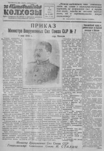 П р о л в т а р г ш т е х ет ран , с ое д и н я й т е с ь! заШтиШШЬе Ш К Ф З Н О р га н н е в е р н о г о P i t ВКП (б ) и райсовета депутатов трудящихся Новосибирской области В О С К Р Е С Е Н Ь Е 5 М А Я 1946 г. № 28 (85Т) Ц е н а 15 к о и . „М о ж н о н а д е ят ь с я, что советские л ю д и во главе с комм уни ст и ч еск ой партией, не пожалеют с и л и труда для того, чтобы не только выполнить, но и перевыполнить н овую п ят и л ет к у. * (Из первомайской» приказа товарища С Т А Л И Н А ) . ПРИКАЗ Министра Вооруженных Сил Союза ССР №7 1 мая 1946 г. » Т и и а р и ц и к р а с н о а р м е й ц а и ' краснофлотцы, с е р ж а н т ы и с т а р ш и н ы ! Т о в а р и щ и о ф а ц е р ы , г е нералы в а д м и р а л ы ! Т р у д я щ и е ся Советенего Союза! С е годня в п е р в ы е после побе- доаосного о к о н ч а н и я В еликой О течественной войны провод* м МЫ 1 мая — м е ж д у в а р о д ц ы й п р а з д н и к т р у д я щ и х с я — в у с л о в и я х Мирной X I л ни, завоеванной в т я ж е лой борьбе с враг а м и , ценою большие ж е р т в и л и ш е н и й . Год тому назад К р а с н а я А р мия водру зи ла з н а м я победы н а д Б ерлином и з а в е рш и л а р а з г р о м ф аш и с т с к ой Г е р м а н и и . Через четыре м е с я ц а после победонос ного о к о н ч а н и я войны с Герма нней сл о ж и л а о р у ж и е и м п е р в а - л я с т и ч е с к а я Я п о н и я . Вторая ми ровая в о й н а , под готовленная с а лам и м е ж д ун ар од но й р е а кци и и р а зв я за нна я г л * а н ы м к ф аш и ст « са м и г о с у д а р с т в а м и , б ы л а за винчена полной победой с лобо- долюбнвых народов . Р а з г р о м и л и к в и д а ц и я основн ы х о ч а г о в фашизма и мировой а г р е с с и и п р и в е л и к г л у б о к и м и з м е н е н и я м в по л и тич ес ко й ж и з ни народов м и р а , к ш и р о ко м у р о с т у д е м о к р а т и ч е с к о г о д в и ж е н и я среди народов . Н ау ч е н ны е о п ы том в о й н ы , народные мас сы п ои л и, что су д ь б у г о с у д а р с т в нельзя в п е р и т ь ре акционным п р а в и т е л я м , преследующим у з- иокаетовые и к о р ы с т н ы е нро- тивонародные цели. Именно пом о л у н а р о д а , не желая больше ж и т ь п о - с т а р о м у , берут судьбу евонх госуд ар ств в свод р у к и , у с т а н а в л и в а ю т д емо кра тич ес ки е п о р я д к и в ве д ут а к т и в н у ю борьбу п р о т и в сил р е а к ц и и , пр о тив поджи га телей новой войны. Народы м ир а н е х о т я т повторени я бедствий войны . Они н а с то йчиво борются за у прочение м и р а ■ безопасности. В а в а н г а р д е борьбы за мир и безопасность идет Советский Союз, с ы г р а в ш и й в ы д а ю щ у ю с я роль в р а з л о м е ф аши зма и в ы п о л н и в ш и й свою ве л ик ую о с в о бо ди тел ьн ую миссию. Н ар од и , освобож1енные С о в е т с к и м Союзом о т ф а ш и с т с к о г о я г а , п о л у чи л и во зможность стр ои ть свою г о с у д ар с т ве н н ую ж и зн ь на д е м о к р а т и ч е с к и х н а ч а л а х , осугор. Москва ще е твл я я своя и с т о р и ч е с ки е чая н и я , На этом п у п они в с т р е ч а ю т со сто ро ны Со йо тск о г о С о ю з а б р а т с к у ю помощь . В е с ь м ир имел во зм ож но сть уб ед и ть ся не только в м о г у щ е с т ве С о ве т с к ою г осударства , но и в справедливом х а р а кт е р е е г о пол и т и к и , основанной на п р и з н а ни и равноправии в с е х народов, на у в а ж е н и и и х Свободы и незави сим о сти , Л е т н и к а к и х основани й сомневаться в т ом , что Сов е т с к и й Союз и впредь будет ве р е н своей политике — п о л и т и к е м а р а и безопасности, п о л и т и к е ра вн оп ра ви я и д р ужбы народов . Со ве т с к и й Союз с о ко и ча ии ем войны п р и с т у п и л к м и р н о м у ео- ц и а л и с 