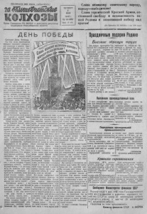 П р о л ет а р и и «*ех стран, соединяйтесь! за Ш ш и е Ш ш М # КОЛХОЗЫ О р г а н С е в е р н о г о Р К В К П ( б ) и р а й с о в е т а д е п у т а т о в тр удящ и хся Н о в о с и б и р с к о й области Ч Е Т В Е Р Г 9 М А Я 1946 г. № 29 (858) Це на 15 коп. Слава великому советском у народу, народу— победителю! Слава героической Красной Армии, отстоявшей с в о б о д у и независимость нашей Родины и завоевавшей победу над врагом! (Из Призывов ЦК В К П (б ) к 1 мая 19-16 года)' Д Е Н Ь П О Б Е Д Ы С е го дн я Д е н ь Победы. ( Год тому н азад пр едставителя немецкого верховного командован и я подписала в зан ят ом К р а с ной Армией Берлине а к т о бе зо тговорочной к а п и т у л я ц и и (сдаче) Германии. Ф аш и с т с к а я разбойничья Германия р а з б и т а я .разгромленная, в ы н у ж д е н а была сложить ! оружие. В е л и к а н Отечественная война Советского Союза о к о н ч и - ( лась п аш ей блестящей победой. О т н ы н е день 9 мая стал одним из п е рвы х пр а з д н и к о в советского государства, с и а с ш е 'О мир от с т р а ш н о й фашистской угрозы. Сегодня мы отмечаем этот день. К а к чел* век ,п реодолевший больш у ю к р у т и з н у , мы сегодзя о г л я дываемся иазад, чтобы л у чш е по н я т ь настоящее . Рабство, м у к и , кровь и смерть — вот чго было натие ан о на п о ганом па уч ь ем з на м ен а н емецк и х ф ашистов. О н и зверски лю товали в з а х в а ч е н н ы х ими советских р а й о н а х , дума я иаиугать вас. Но мы не из п у г л и в ы х . То, что удалось г и тл ер ов ц а м в З а п а д ной Е в р о п е вследствие предательства п р а в я щ и х классов, ие вышло и н и к а к не могло выйти у вас, в Советском Союзе. У нас власть в р у к а х народа, у нас во главе г о с у д арс тв а стоит и с п ы т а н н а я з а щ и т н и ц а т р у д я щ и х с я — п а р т и я большевиков,н ами ру к о в о дит вел и кий я мудрый вождь л ю б и м ы й т о в а р и щ Сталин. Четыре д о л ги х года длилась борьба. Т яжелые бывали времен а , о т ч а я н н ы е дни. . . Но непоколебимо, к а к у тес , ст о яла ваша п а р т и я и с ней весь народ. В это трудн ое время народ оказал свое великое доверие большевистской п а р т и и ц советскому п р а в и т е л ь с т в у . Т о в ар и щ С т а л и и выразил народу от имени п а р т и и и советского п р а в и те л ь с тв а глубокую благодарность з а это доверие. П р о с чи т ал с я немец. Перед ним уже была не с т а р а я Р у с ь — о т с т а л а я и слабая, а Р у с ь нова я, с о ц и а л и с т и ч е с к а я , Р у с ь м о щ н а я , ' индустриально колхозная, Р у сь , I с п л о т и в ш а я все народы нашей с т р а н ы в е д и н у ю м о г у ч у ю са л у . «Баемся, П ю н ф Р а с с ар и о и о - в и ч , — пи сали т о в а р и щ у С т а л и н у пе редовики сельского хозинсРва Б у р с к о й о б л а с т и ,— 1 5 лет назад, к огда В ы намечали с д а н инду- т р нал н а ц и и , некоторые из к р е с т ь ян не понимали, зачем нам н у ж н о столько заводов, зачем н у ж н а ин д у с тр и а л и з ц и я .а теперь мы поняли, ч то э т а индустрна л и з а ц н я н ам ж и з н ь сп асла! . .» Пр осчи т ался н емец— у нас есть з а в о д ы ,— они дали Брасаой Арм ан вдоволь п у ш е к , т ан ко в , самолетов, снарядов, винтовое, пулеметов. У нас есть колхозы — они дали с т р а н е я армии хлеб, хлопок, шер -ть, мясо... Нас сп а с л а д а л ь н о в к д т я н о л и т н к а т о в а р и щ а С т а л и н а — пол и т и к а социалистической ин д у - стри алн зции . п о л и т и к а к о лле к тиви зац ия . Ц а о спасли т ы с я ч и , Праздничные подарки Родине В ы с о к и е образцы т р у д а День Победы т р а к т о р а м и Тар- т р а к т о р и с т из колхоза им. Ко - тасской Ü T C о
