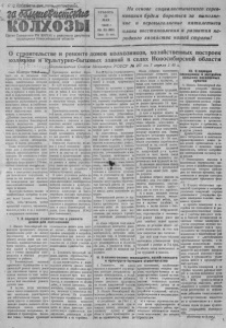 - О с Щ шШо О р ган С е в е р н о г о Р К В Н П (б ) и р а й с о в е т а депутатов т р у д ящ и х ся Ново си би р с к о й области СУББОТА 2 5 М А Я 1946 г- № 32 (861) Ц е н а 1Ь к о п . Н а основе со ц и а л и ст и ч е с к о г о соревнования будем бо р от ься за выполнение и перевыполнение пятилетнего плана во сст ановления и р а з в ит и я н а р о д н о го х о з я й с т в а нашей ст р а н ы ! О строительстве и ремонте домов колхозников, хозяйственных построек к о л ^ З о в и ттультурно-бытовых зданий в селах Новосибирской области о с т а н о в л с н и е С о в е т л М и н и с т р о в Р С Ф С Р *М 237 от 7 апреля 1 46 г. I Л ([■ ■ Совет М н а я Й ' р Ь в 4н: ч а с т , что за последнее годы т е л ь н ы х ма те риалов в к олхоз ах стр ои тель ство н о в ы х домой колхоз и п р е д п р и я т и я х местной прочыш н и к о и , х о з я й с т в е н н ы х по с т р о е к ленности почти г ре к р а т и л о с ь колхозов и к у л ь т у р н о - б ы т о в ы х я д а - ! II ) 1 3 0 к и р п и ч н ы х заводов I най в с е л а х Н ов оси б ир ско й обла- с е л ь с к о й местности, вырабатывав с т а , а особенно в се л ах Б а р а б а н - ш а х до войны 5 млн ш т у к к а р с к о й и К у л у в д и н с к о й с т е п и , поч- п и ч а и 2 млн. ш т у к ч ер е пи цы , т и не производилось, т а к ж е не- в на с т о я щ е е время работают толь доста точно о с ущ ес т в л я л с я ремонт ко отдельные за воды , в ы р а б а ты имеющего,« ж и л ы х и хозяй ствен- н аю щ и е небольшое к ол и че с т в о н и х постр оек па селе, вследствие к и р п и ч а , э т о г о з н а ч и т е л ь н а я ч а с т ь их Производство извести, кровель пр иш л а з негодность . ной щепы, с к о б я н ы х и с т о л я р н ы х ^ [ е с т н ы е с о в е т с к и е , земельные изделий , з а г о т о в к а леса и пнло- о р г а н ы и колхо зы Новосибирске)! м а т е р иа л ов в колхозах и пред- области недоста точно у д е л я ю т н р и н т и я х местной промышлчино- в и и м и п и я проведению р е м о н т а д сто области почто по всеместно новому с т р о и т е л ь с т в у , в резуль- п р е к р а щ е н ы , и к о л х о з н и к и не та ти че о во мног и х селах жилые имеют возможности пр иоб р ета ть дома к о л х о з н и к о в обветшали , по- и х для р е м о н т а и благоустрой Производство м е с т ны х « т р о и * ' Р а з и ^ * б р т г а д у с т а н а в л и в а е т с я правлением колхоза в зави симое ти от п р о и з в о д с т в е н н ы I возможностей и объема предстоящего стр ои тель ства. Р а б о ты по з а г о т о в к е я произ- водству с т р о и т е л ь н ы х м а т е р и а л о в : леса, пр ска , г л и н ы , п а м е я , кир пи ча, ч ерепицы , кровельной щеп ы , перевозка стройматериалов ц ч д р у г и е подсобные работы для стр ои те ль ства и к а п и т а л ь н о г о ремонта домоз к о л х о з н и к о в производятся в с р о к и , у с т а и з в л е к а е мые пр авл ен ием к о л х о з а , дополни тель но выделяемыми для этой цели к о л х о з н и к а м и , без ущерба для проведения с е л ь с к о х о з я й с т в е н н ы х работ в колхозе; б ) к о л х о з н и к а м , пр и н и м а ю щим у ч а с т и е по н а р я д а м правлекоси ди сь , к р ы ш и не и с п ра вн ы , стна с в о и х домов. ! ня й колхозов в работах по строиограды и ворота р а з р у ш е н ы . I П ередовые к о л х о з н и к и , во же-1 т е л ь с г в у и к а п и т а л ь н о м у ремонту, Т а кж е не удовлетворительно об- лая в ущерб колхозному проаз нач и сл яю тся т р уд од ни в соответ- ст о и т дело с обеспечением пост- водству о тв л е ка т ь с я от кол х о з ны х с т в н и с нормами в ы р а б о т к и и р а с ц е н к а м и , у с т ан о в л ен о и м я в к ол хозе. Труд од ни , начисляемыв за работы ио ст р ои т е л ь с т в у и ка- ,1.ч т а л ь н о м у 